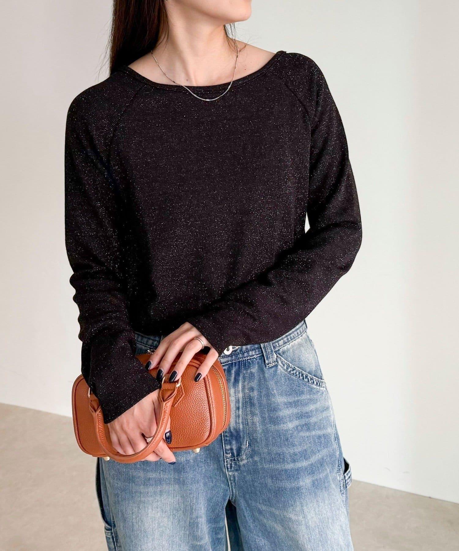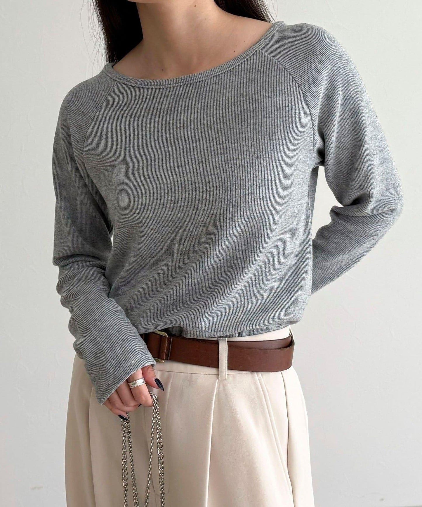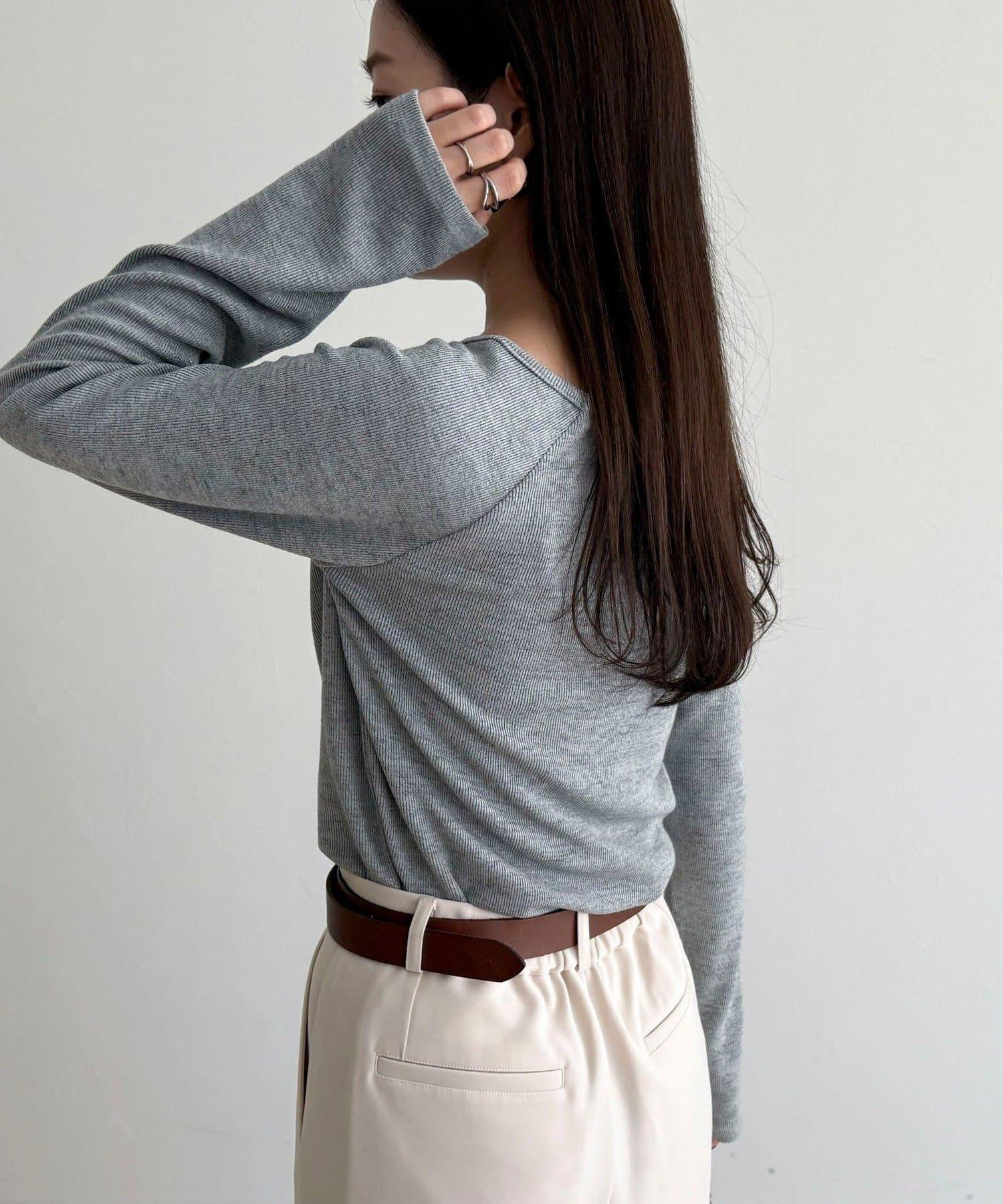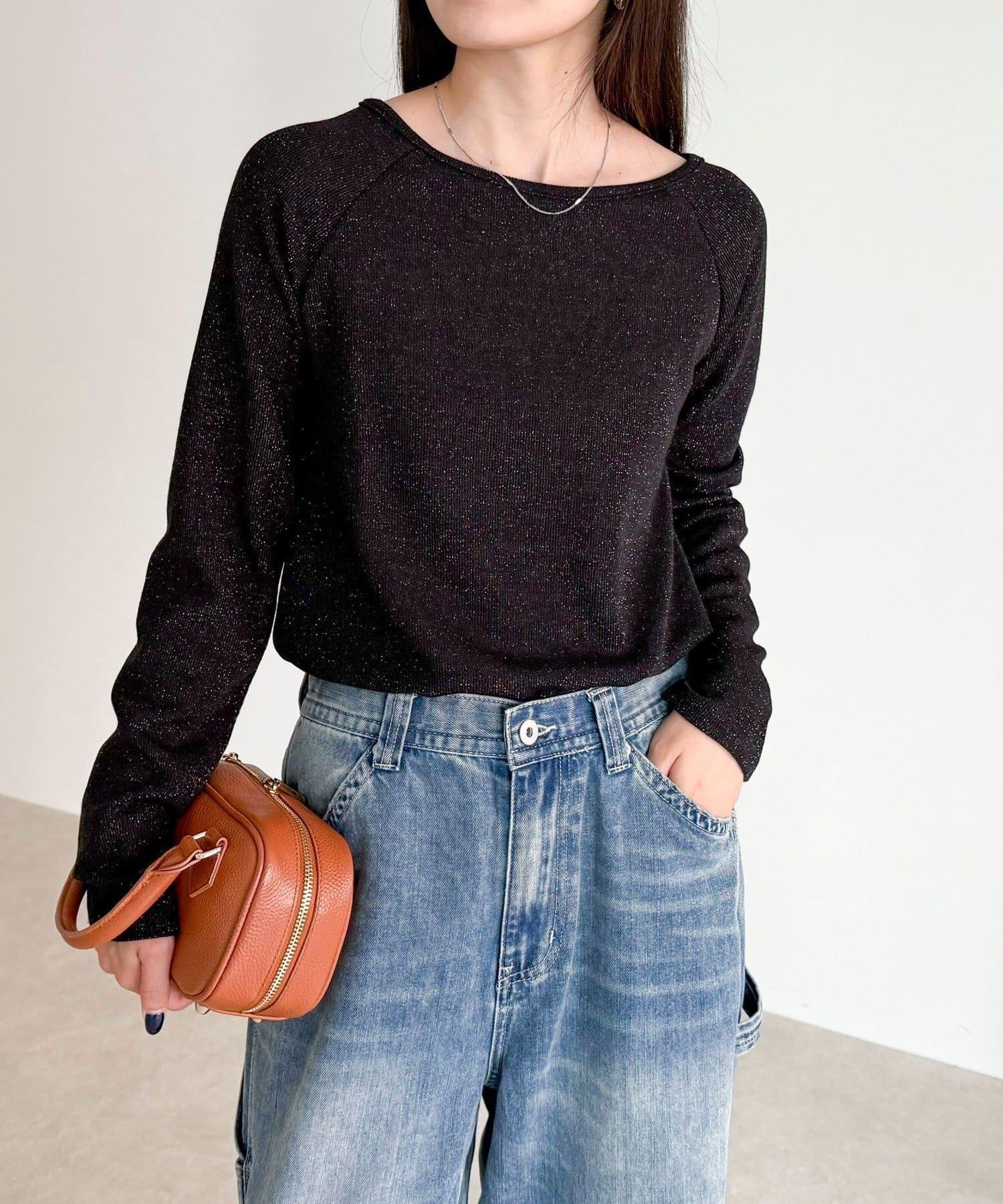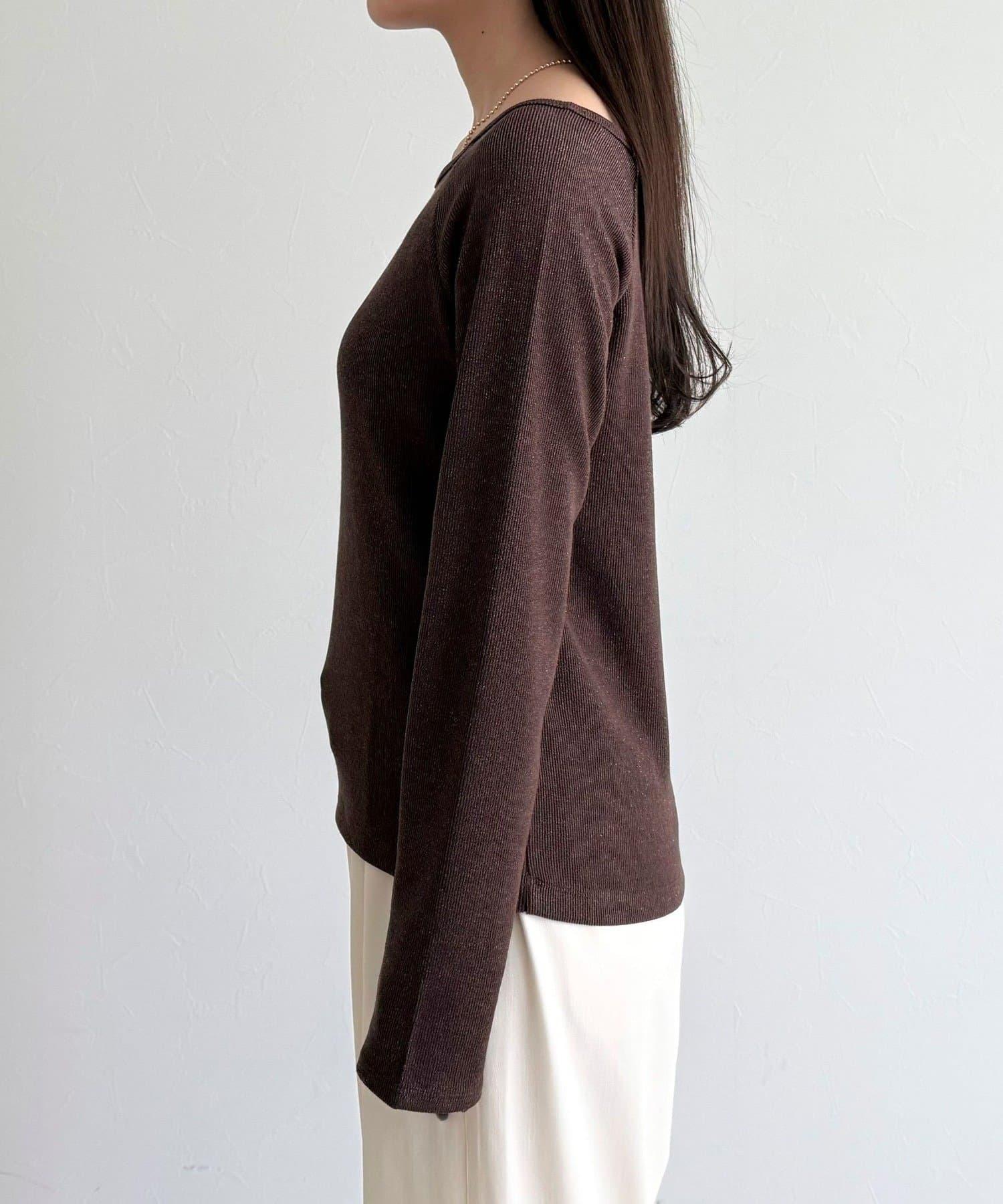 身高 156 厘米的工作人員(穿 38 號):恰到好處地貼合身體,肩部和腰部線條優美。彈性好,穿起來活動自如,很舒服。柔軟的面料貼膚感很好,薄片巧妙地閃耀著光澤,是提亮臉龐的好點子。領口處的船形領口設計,將骨架筆直的鎖骨線條展現得淋漓盡致,女人味十足。