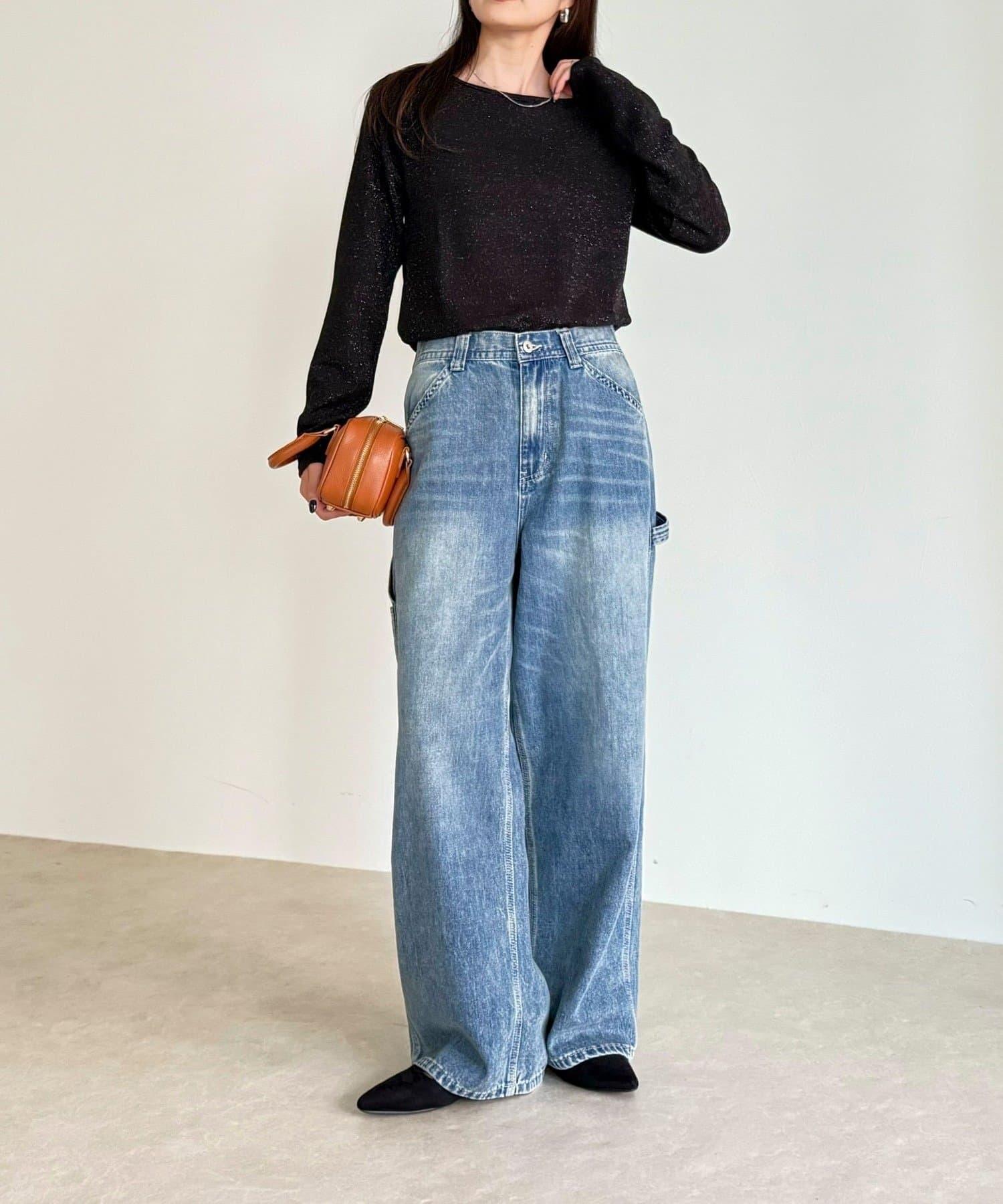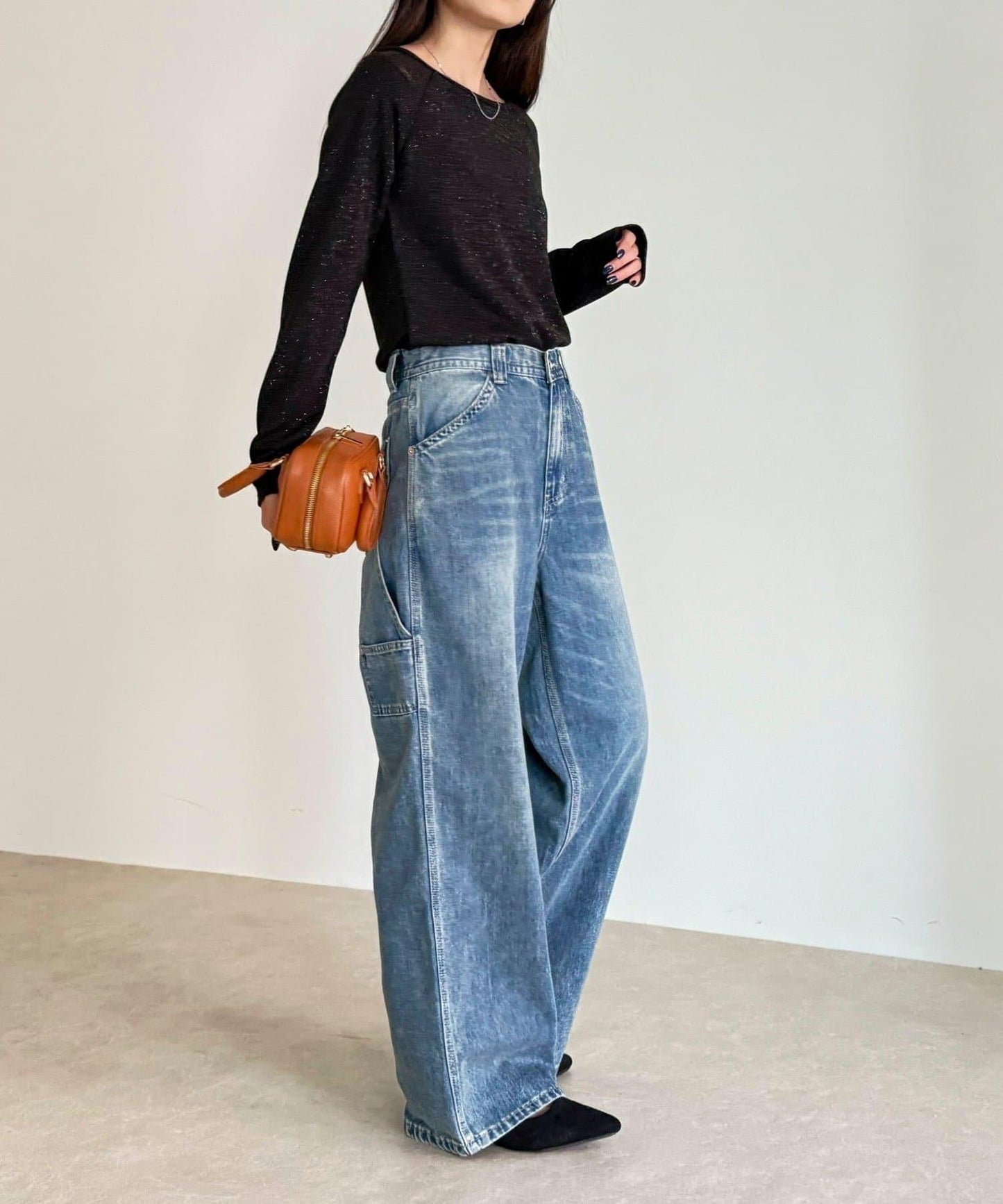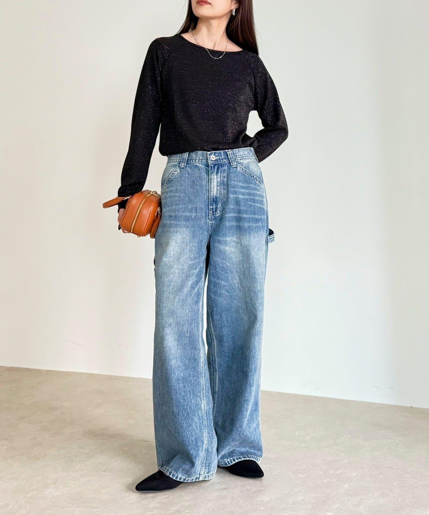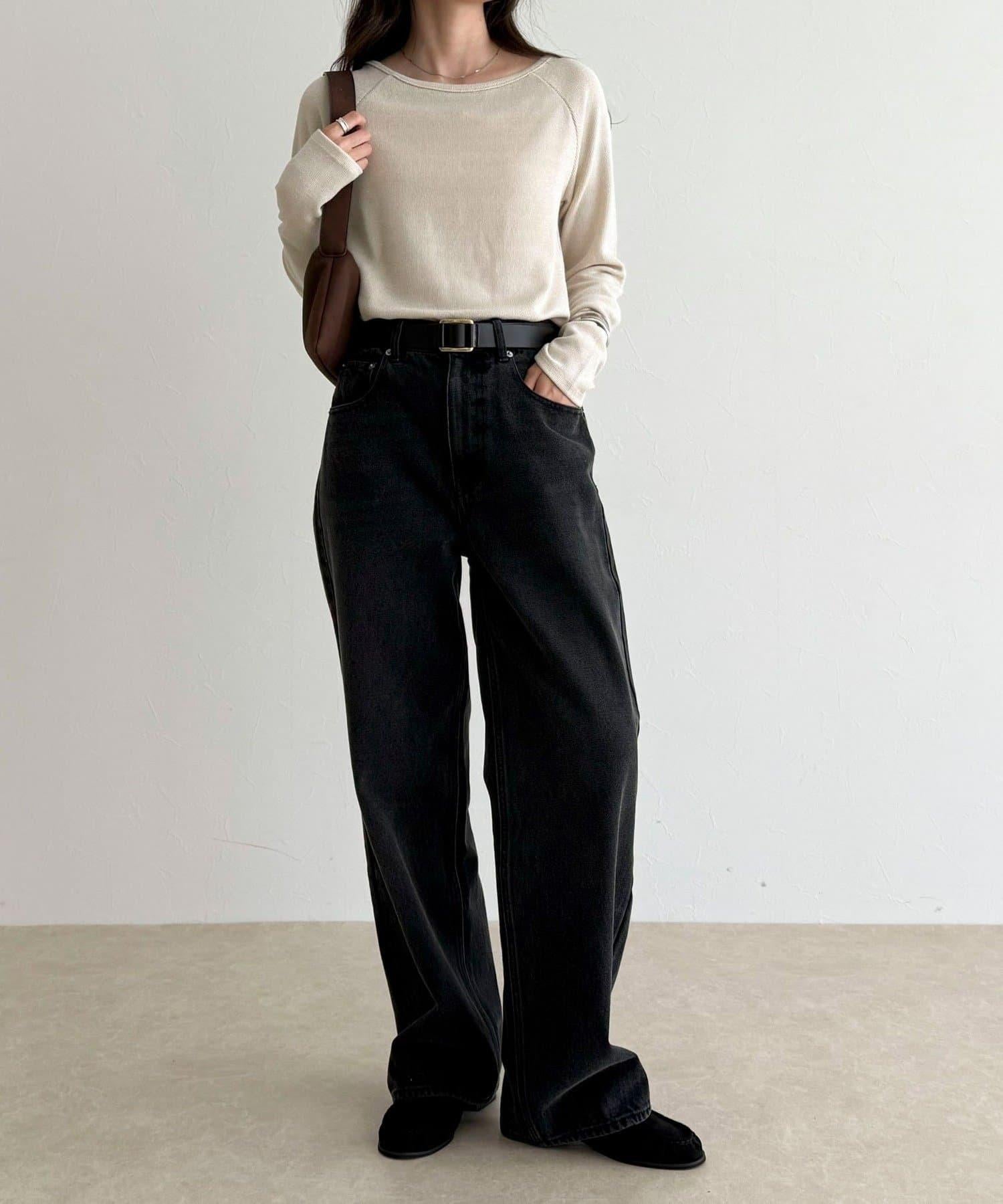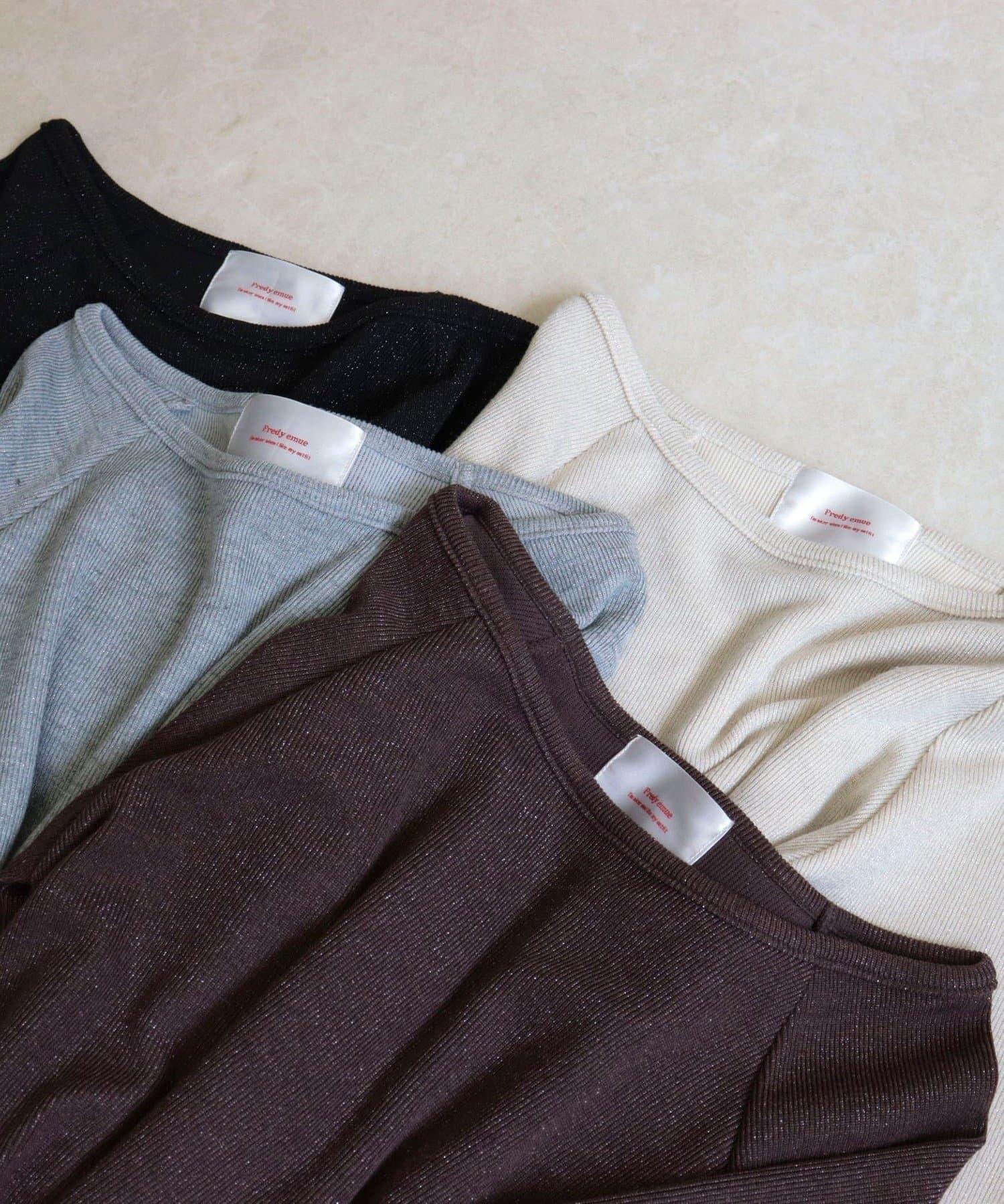 身高 156 厘米的工作人員(穿 38 號):恰到好處地貼合身體,肩部和腰部線條優美。彈性好,穿起來活動自如,很舒服。柔軟的面料貼膚感很好,薄片巧妙地閃耀著光澤,是提亮臉龐的好點子。領口處的船形領口設計,將骨架筆直的鎖骨線條展現得淋漓盡致,女人味十足。