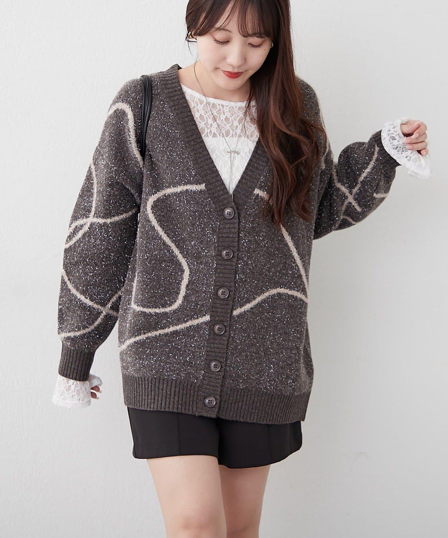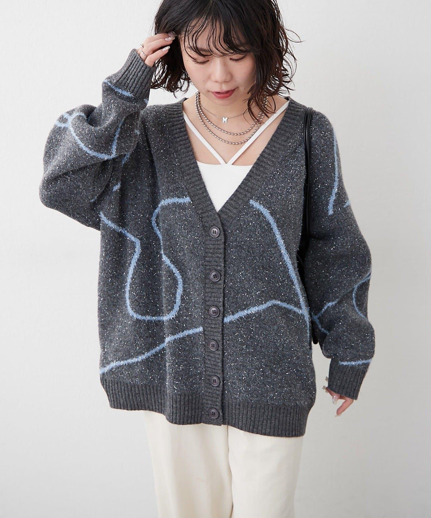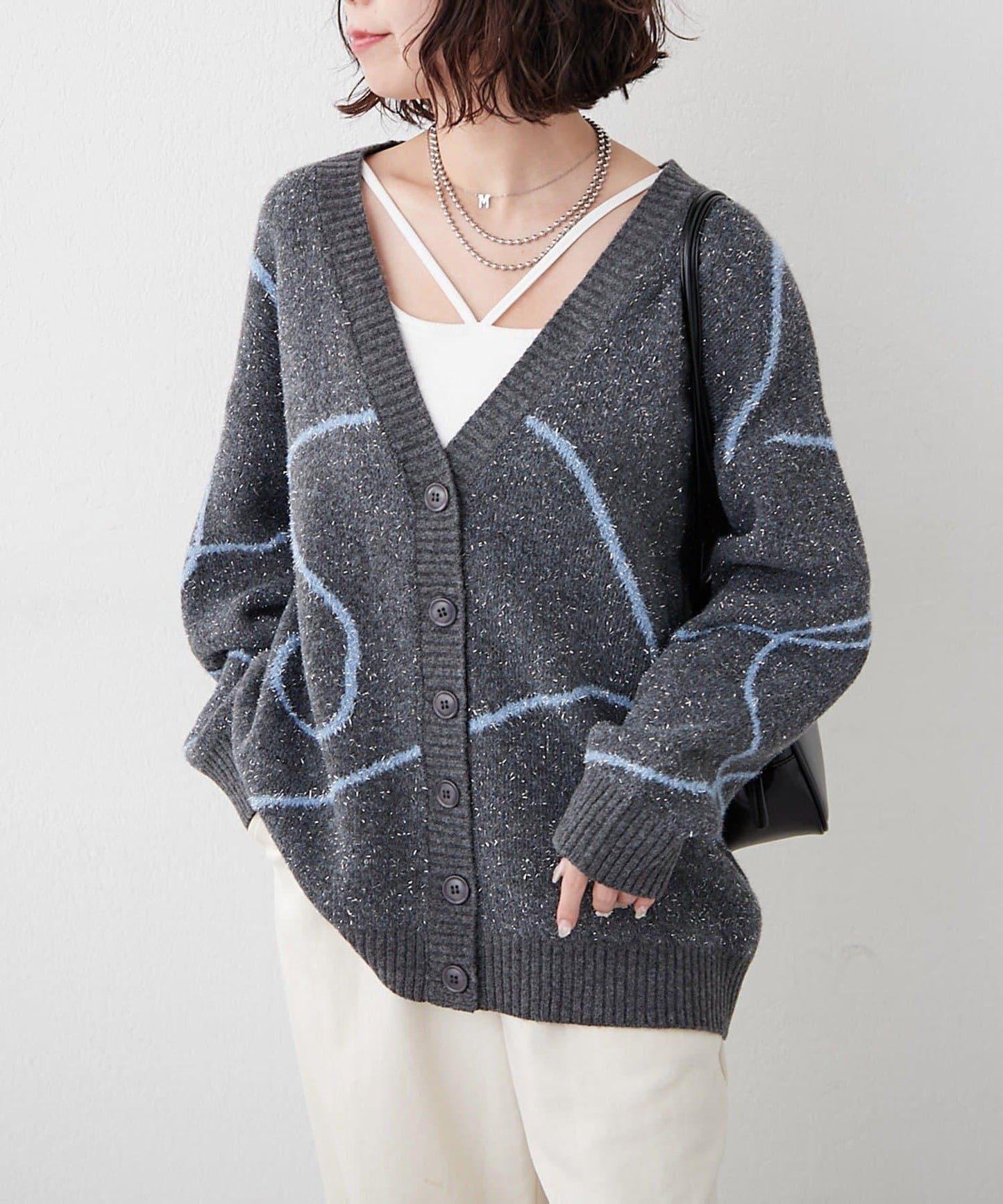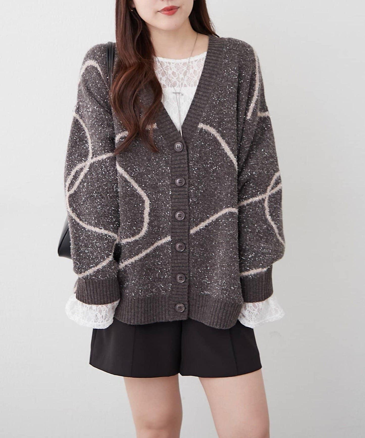 薄紗材質隨意閃耀♪線條圖案的時尚 V 領開衫。
