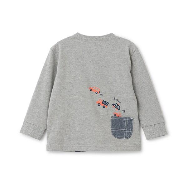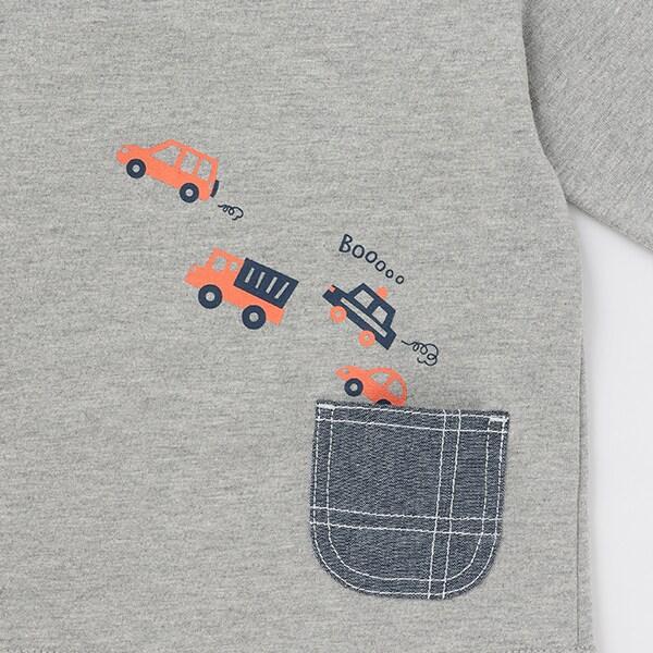 背面印有一輛汽車從牛仔面料的小口袋中駛出的圖案。