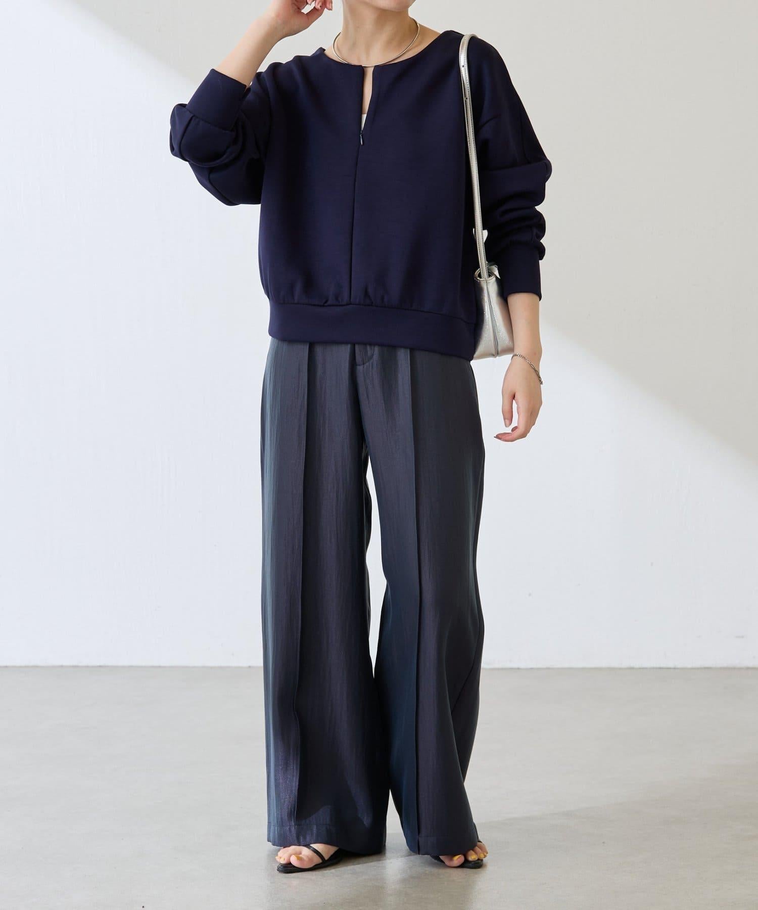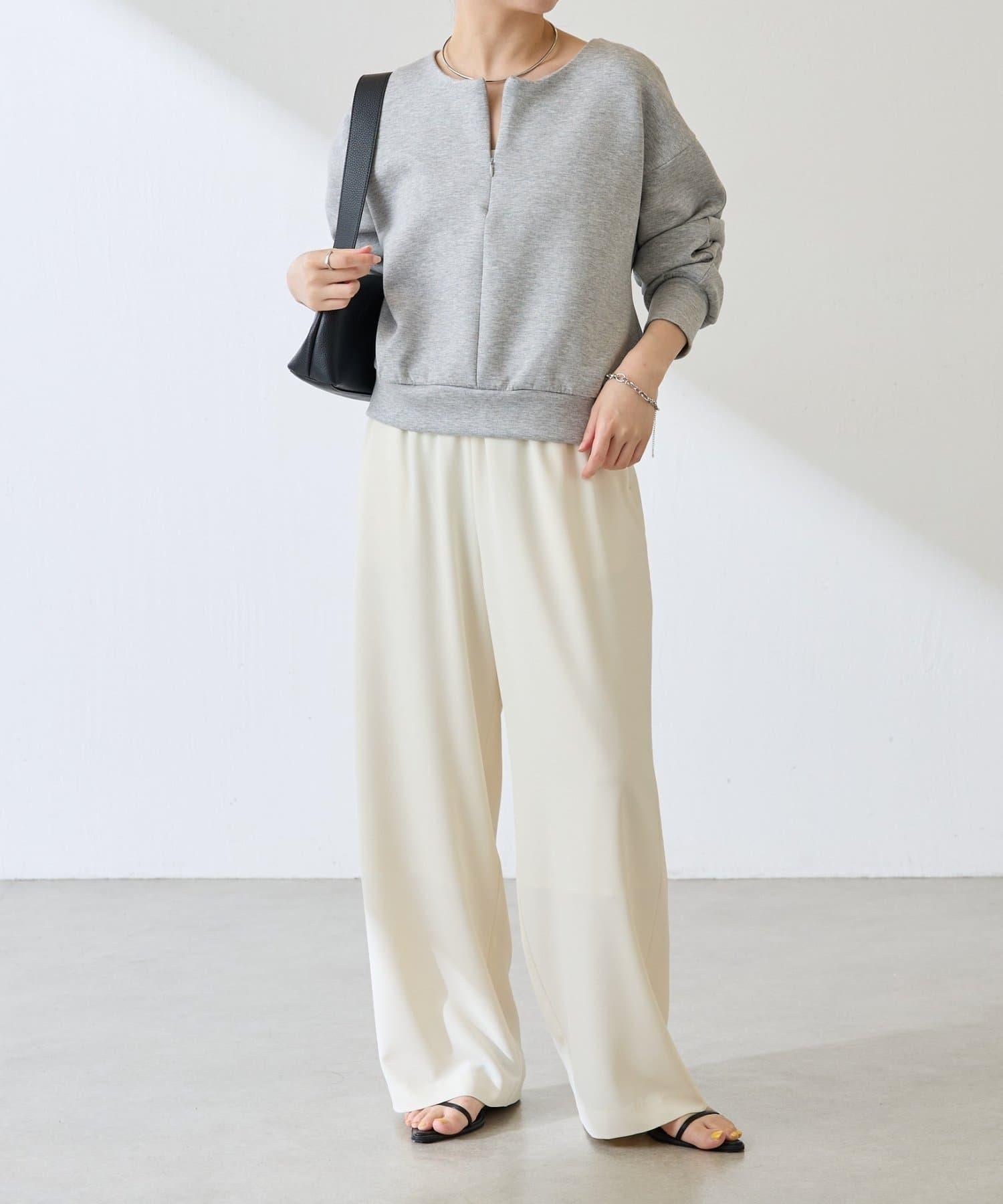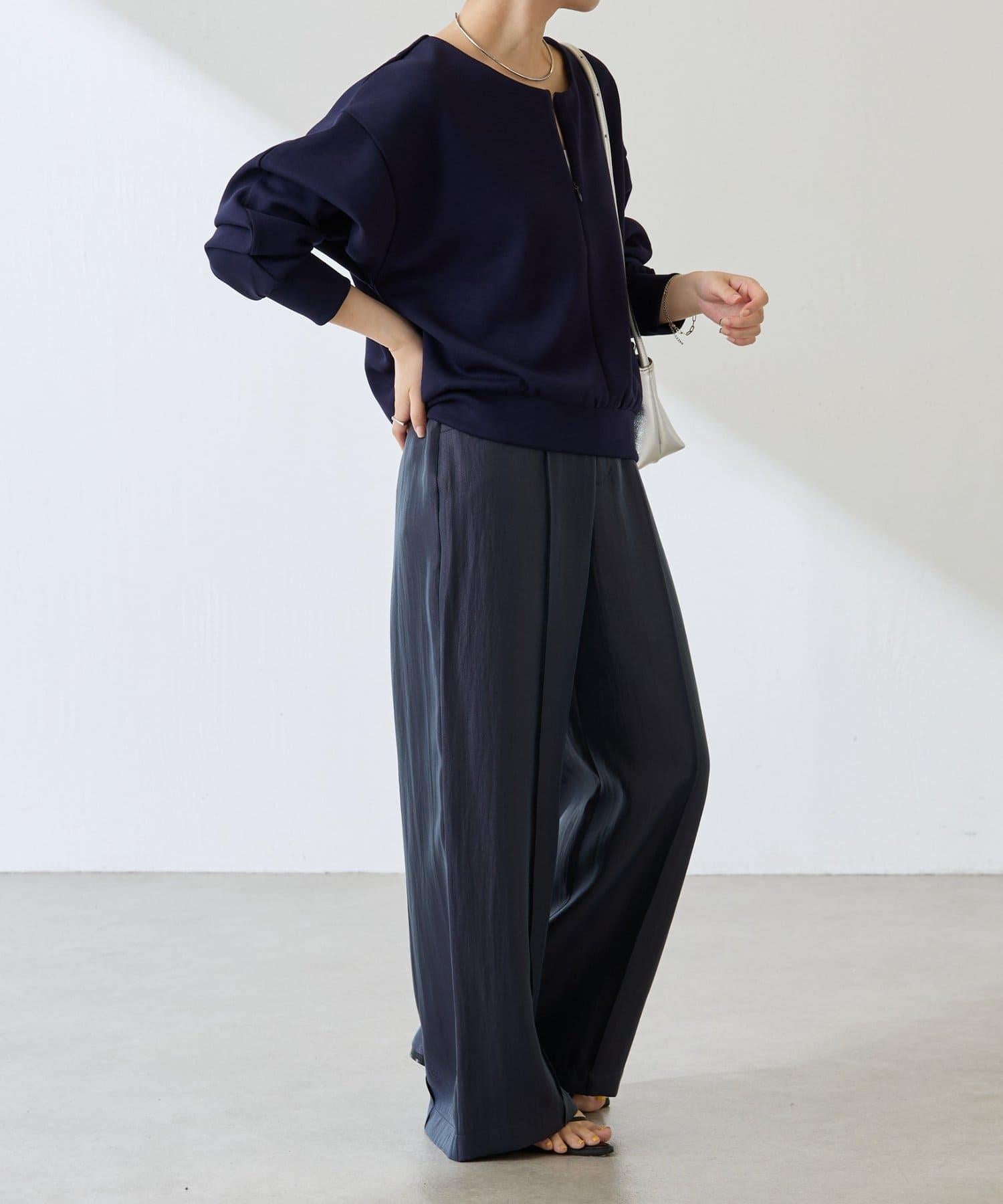 搭配中間壓線的寬大長褲時,將胸前的拉鍊稍稍拉開,即可完成帥氣造型。