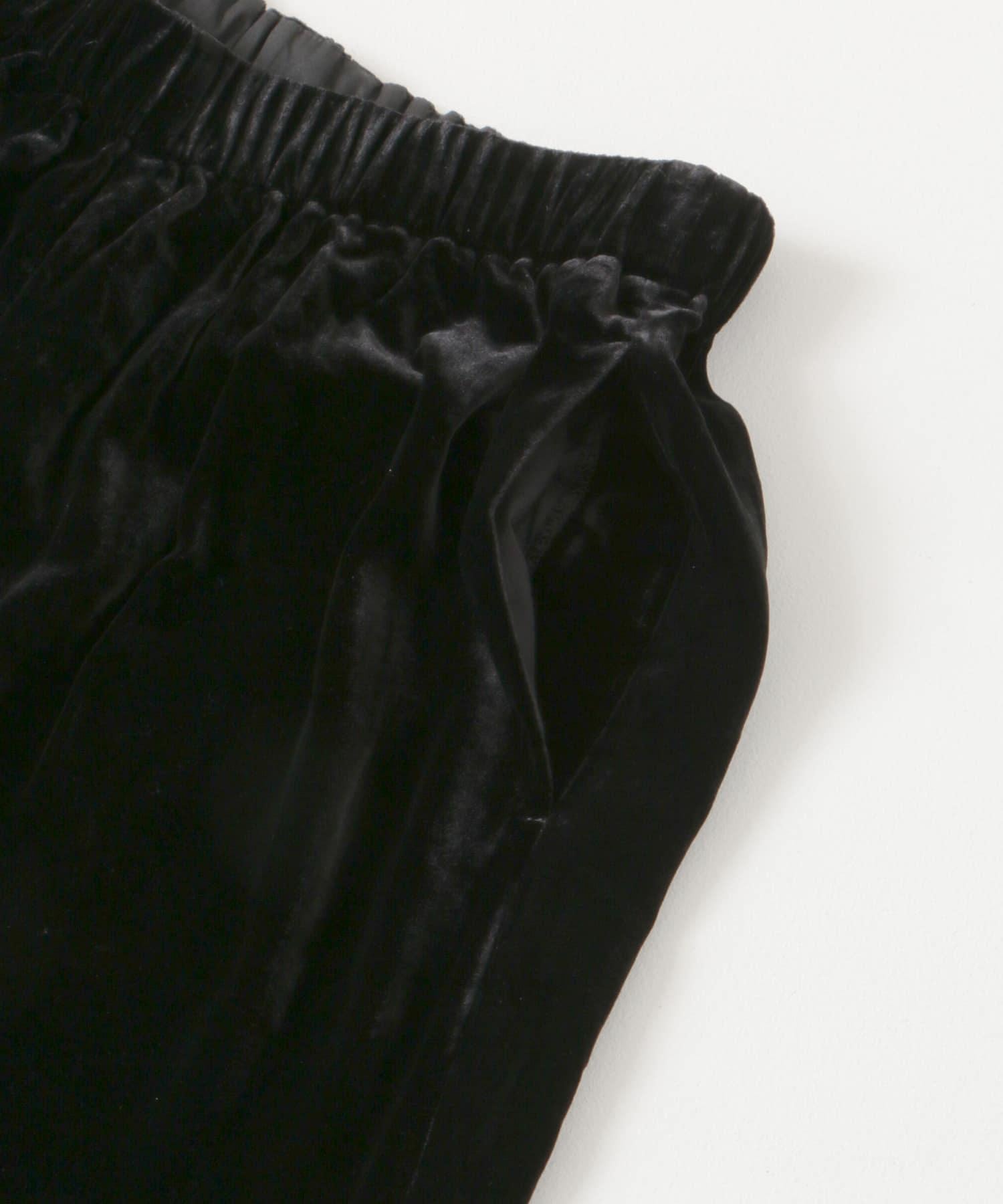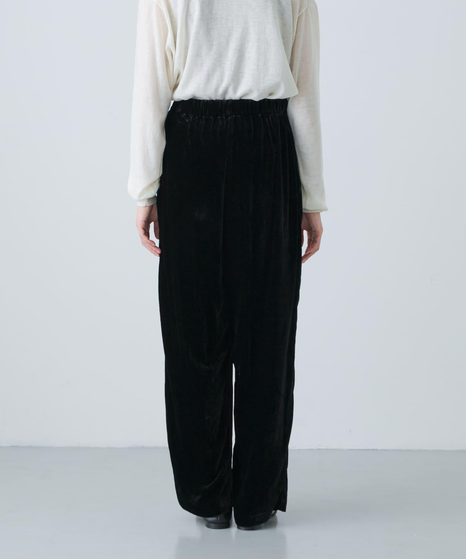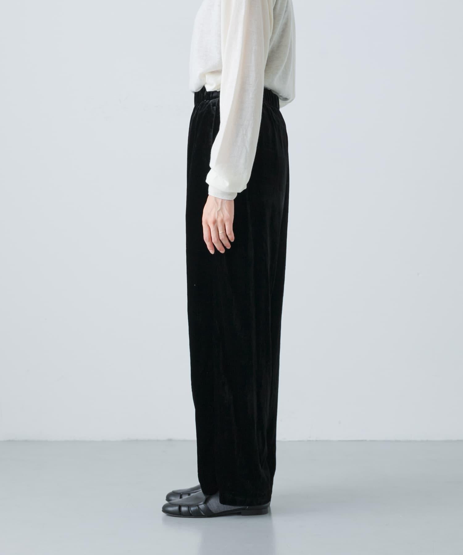 去年廣受好評的天鵝絨系列現在又有了新的面料。基布採用絲綢和尼龍,絨毛採用人造絲。尼龍混紡增加了織物的強度,使其更易於處理,同時又不失質感。質地柔軟,外觀奢華。筆直的剪裁落落大方,給人留下美好的印象,而易收腰的設計則讓穿著更加輕鬆舒適。適合搭配襯衫、襯衣和針織衫。與該系列的上衣搭配也是不錯的選擇。這款單品不僅能與各種場合完美搭配,還能在日常生活中與休閒單品搭配穿著。