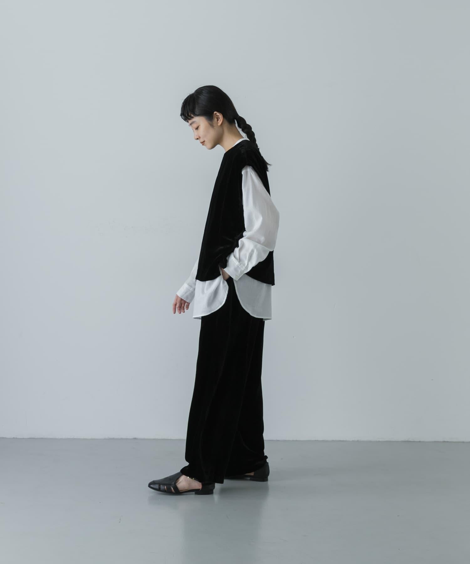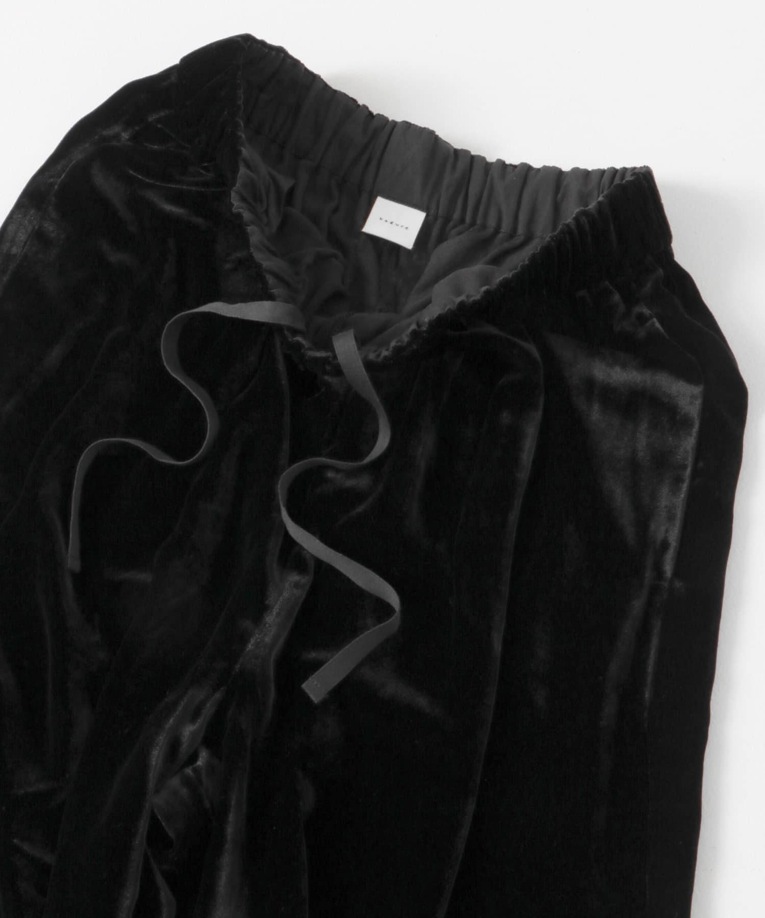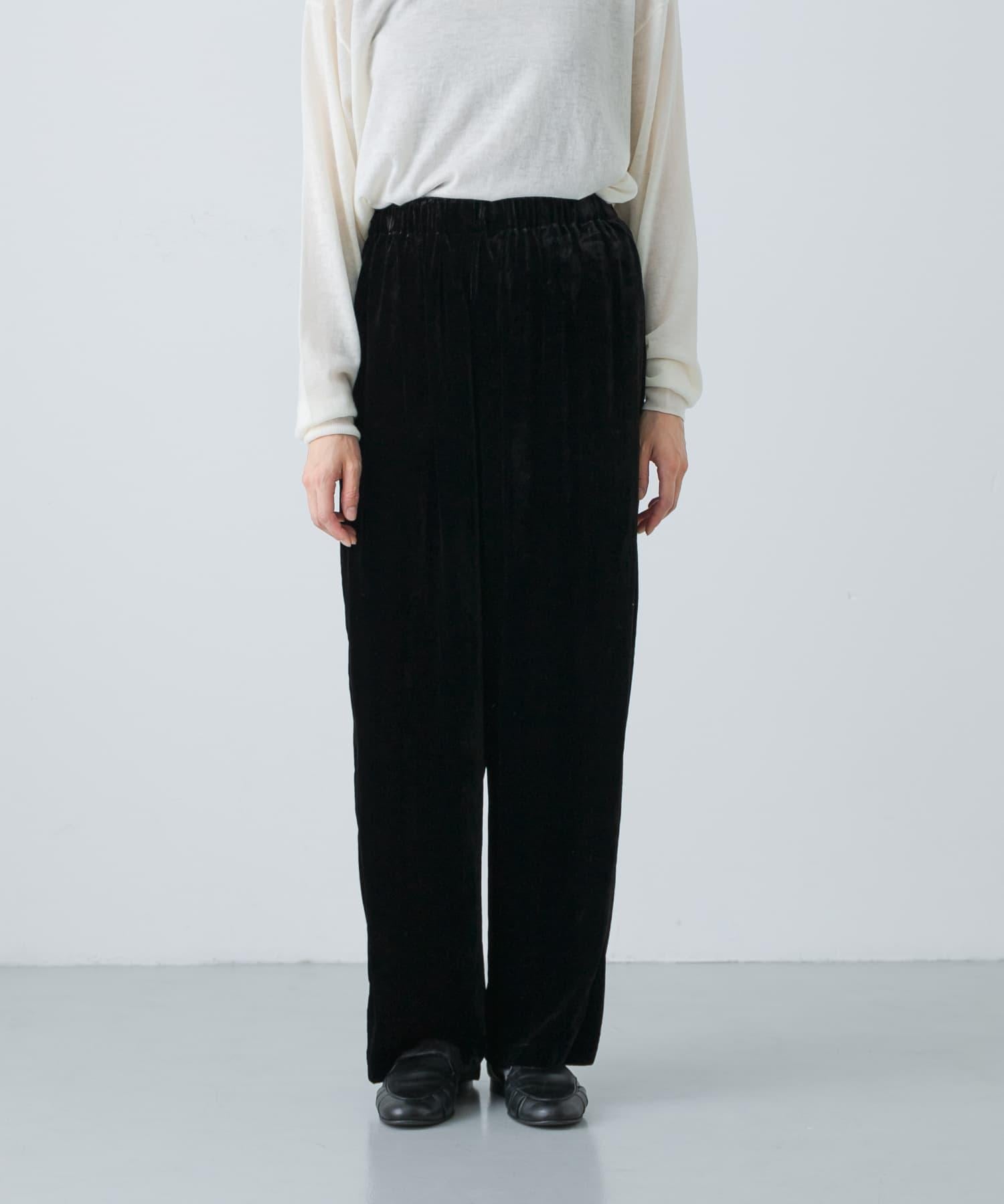 去年廣受好評的天鵝絨系列現在又有了新的面料。基布採用絲綢和尼龍,絨毛採用人造絲。尼龍混紡增加了織物的強度,使其更易於處理,同時又不失質感。質地柔軟,外觀奢華。筆直的剪裁落落大方,給人留下美好的印象,而易收腰的設計則讓穿著更加輕鬆舒適。適合搭配襯衫、襯衣和針織衫。與該系列的上衣搭配也是不錯的選擇。這款單品不僅能與各種場合完美搭配,還能在日常生活中與休閒單品搭配穿著。