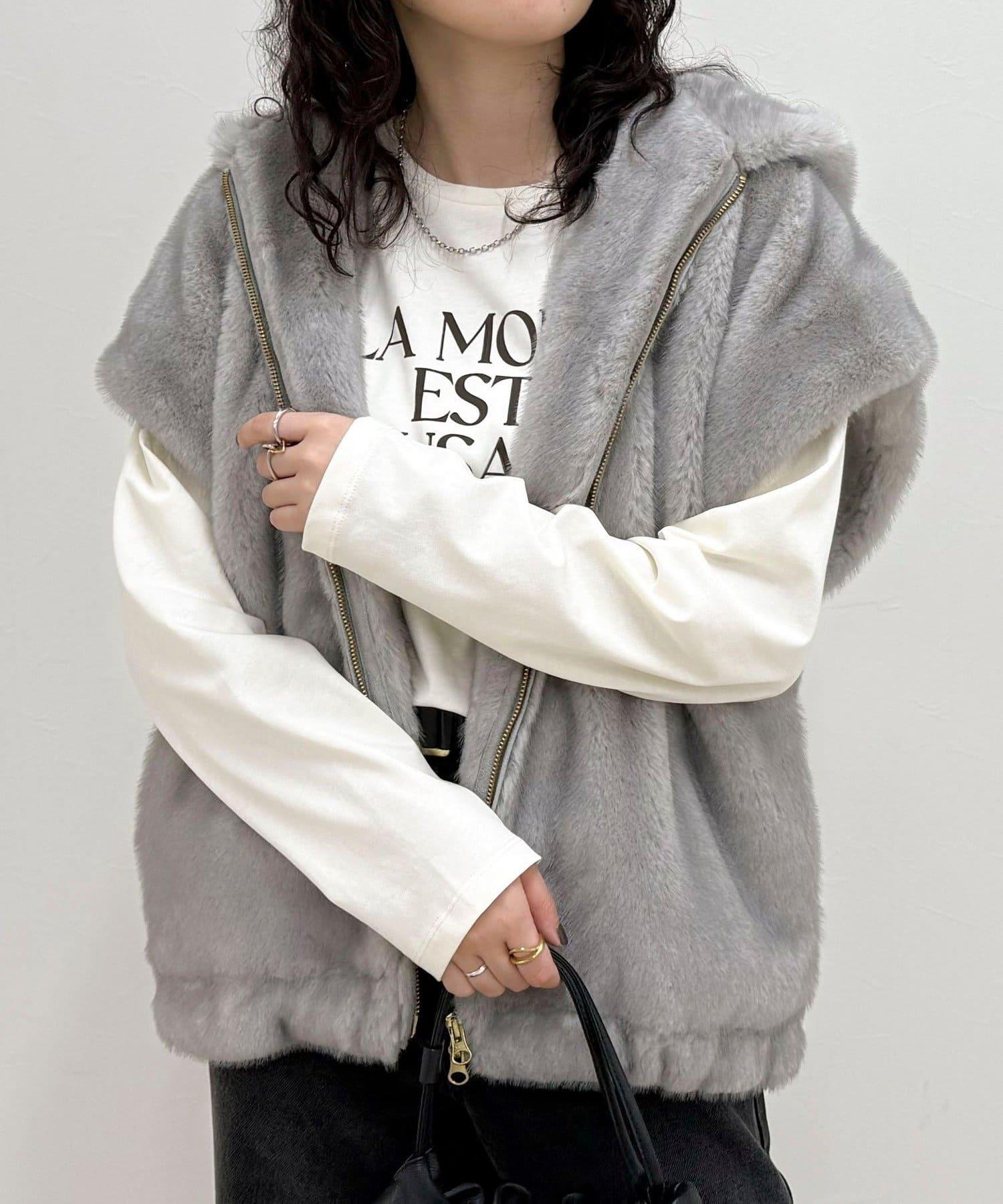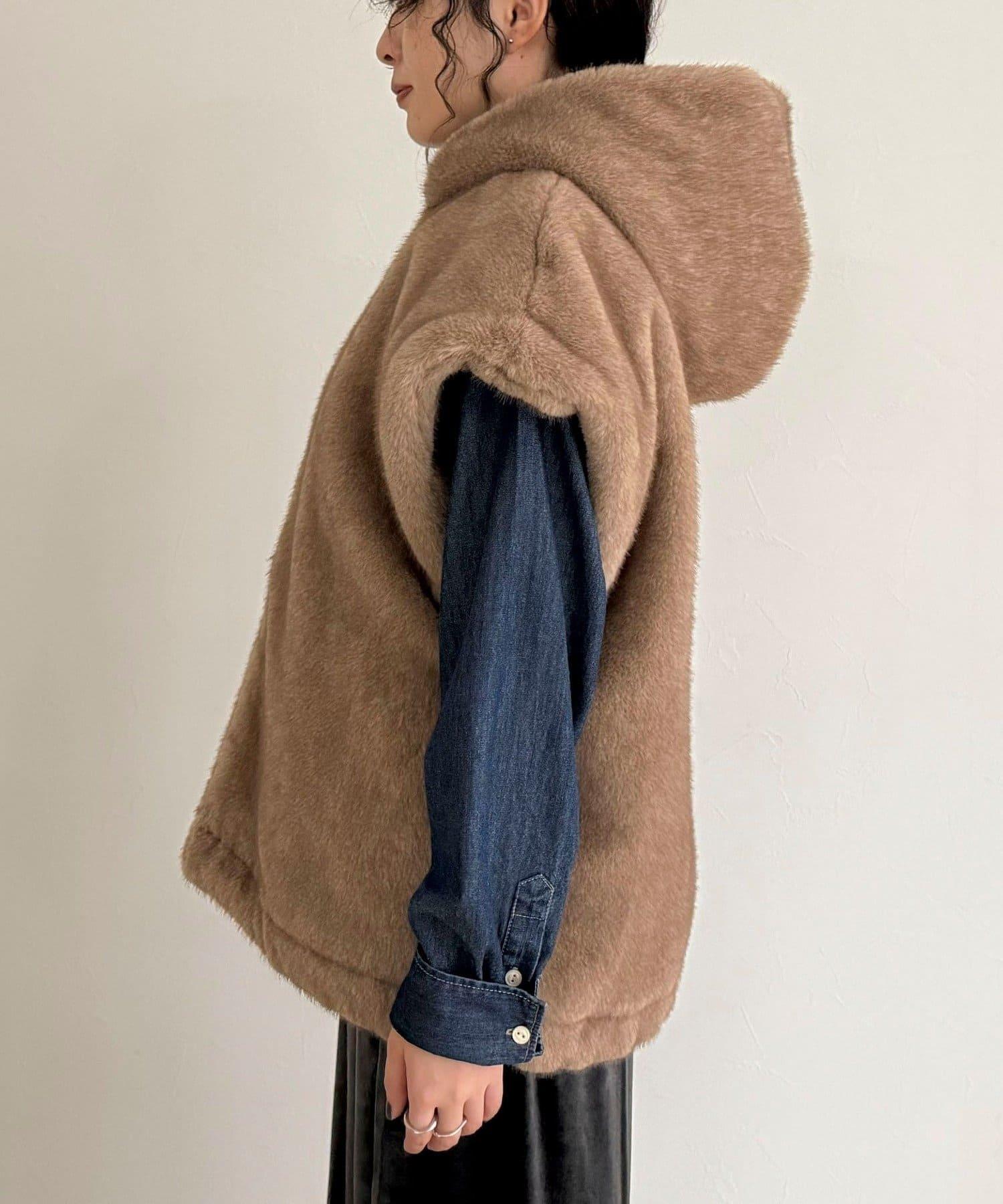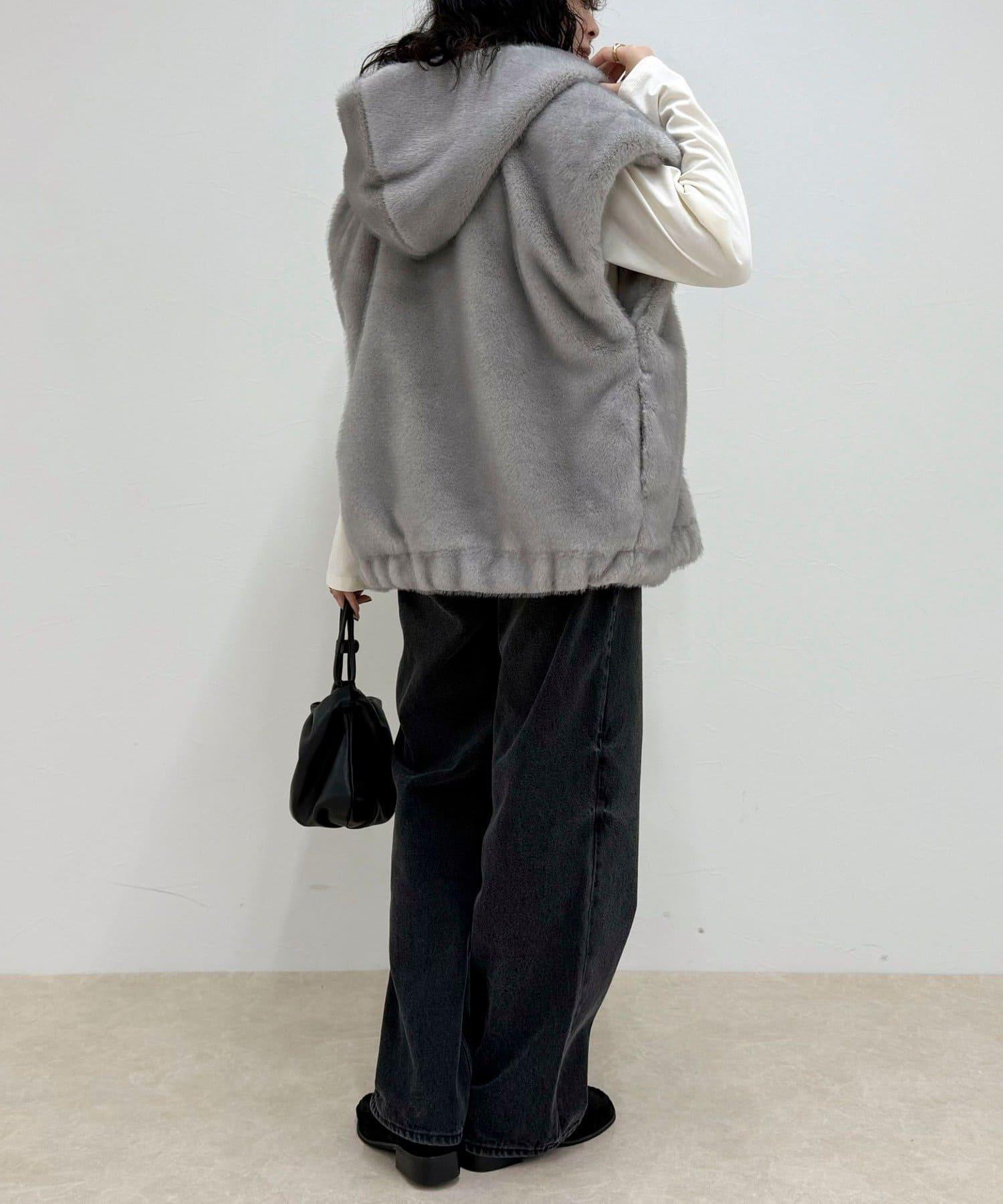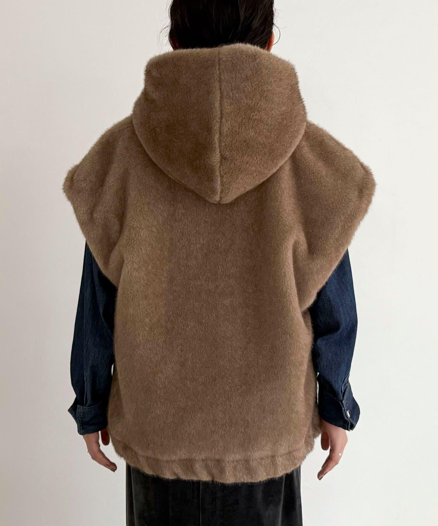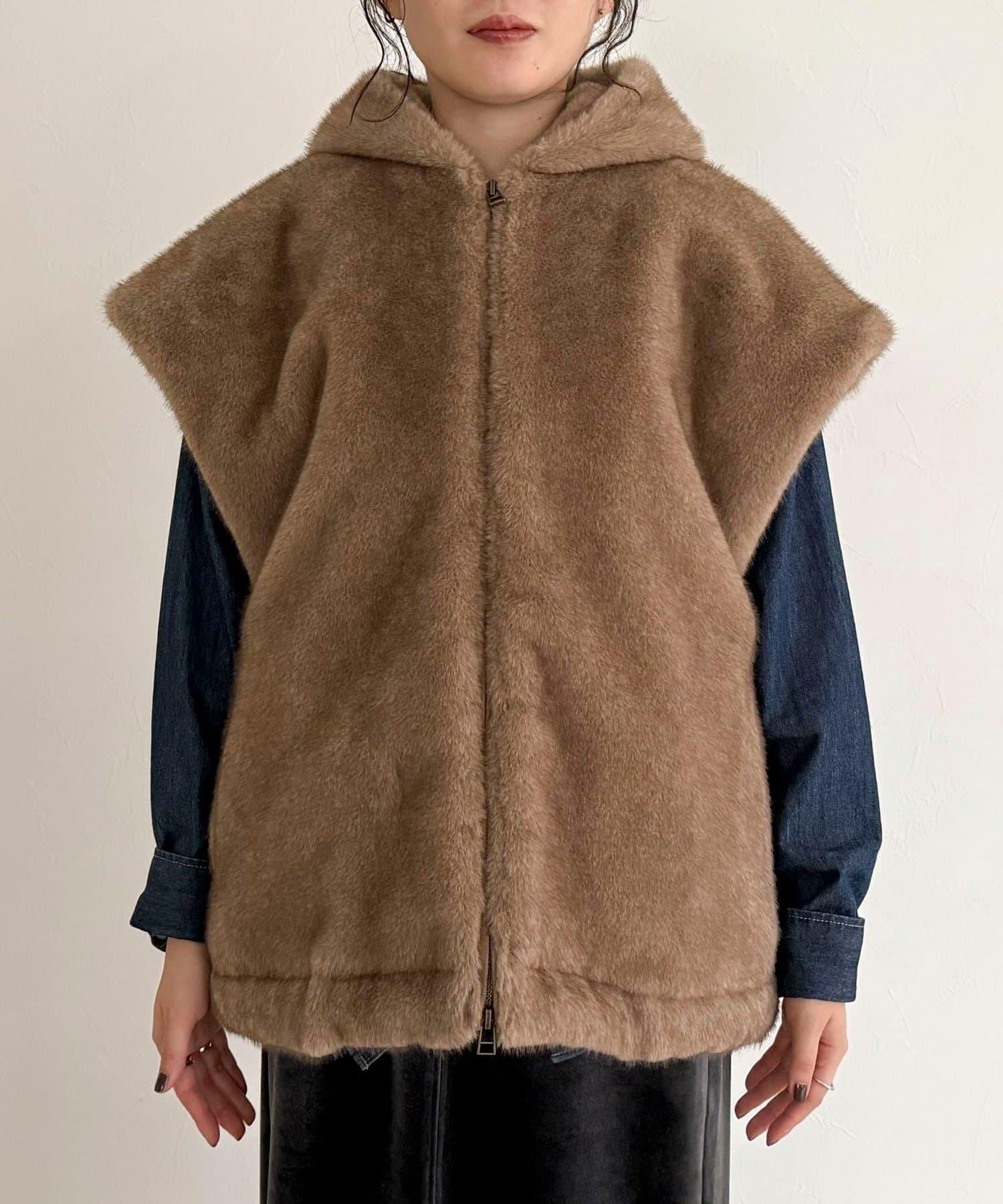 使用人造皮草的連帽馬甲,氣場十足。