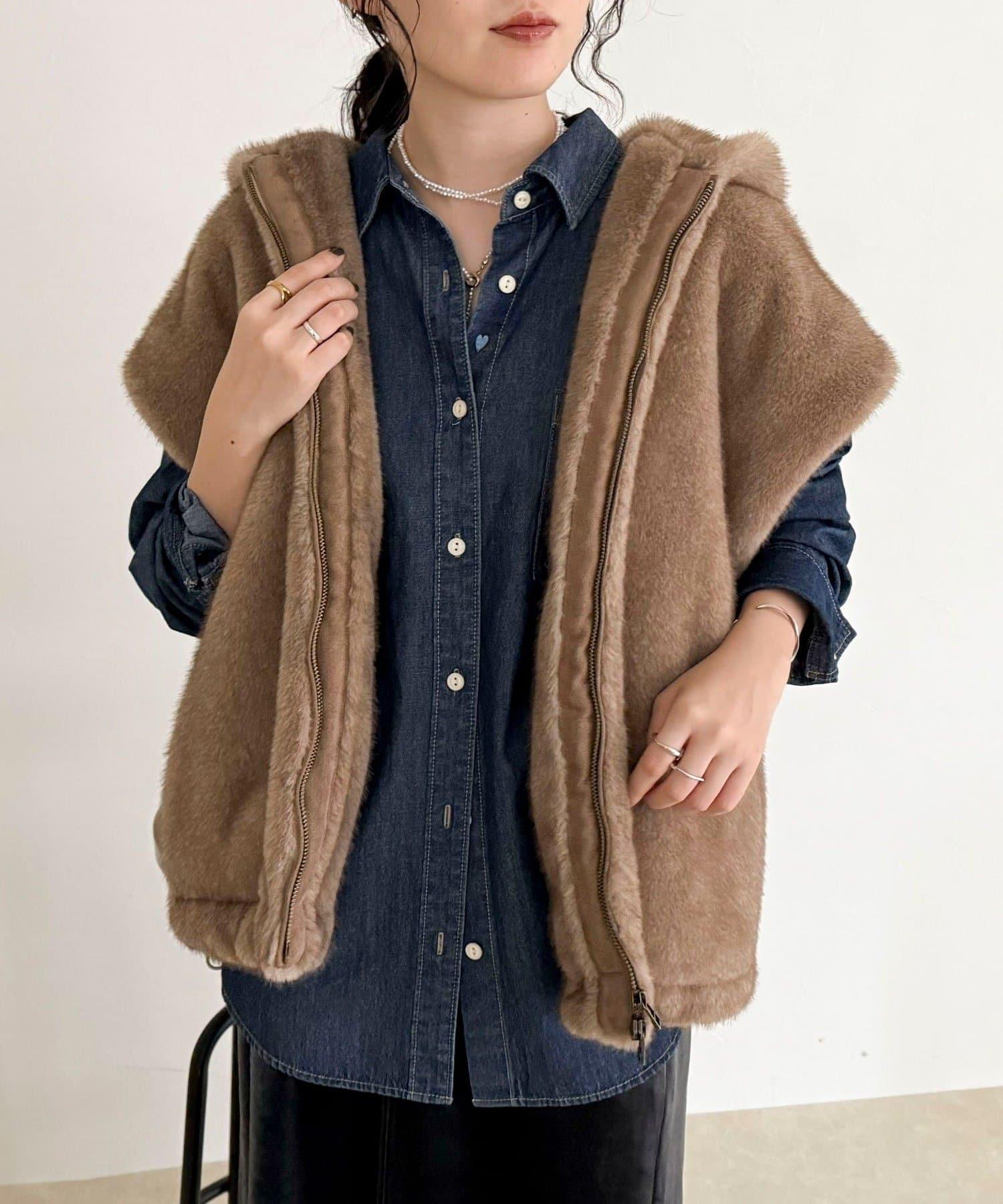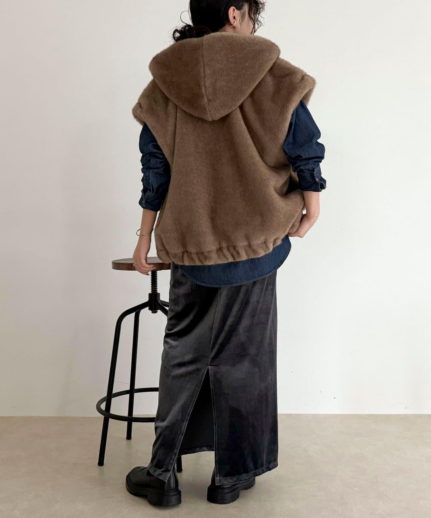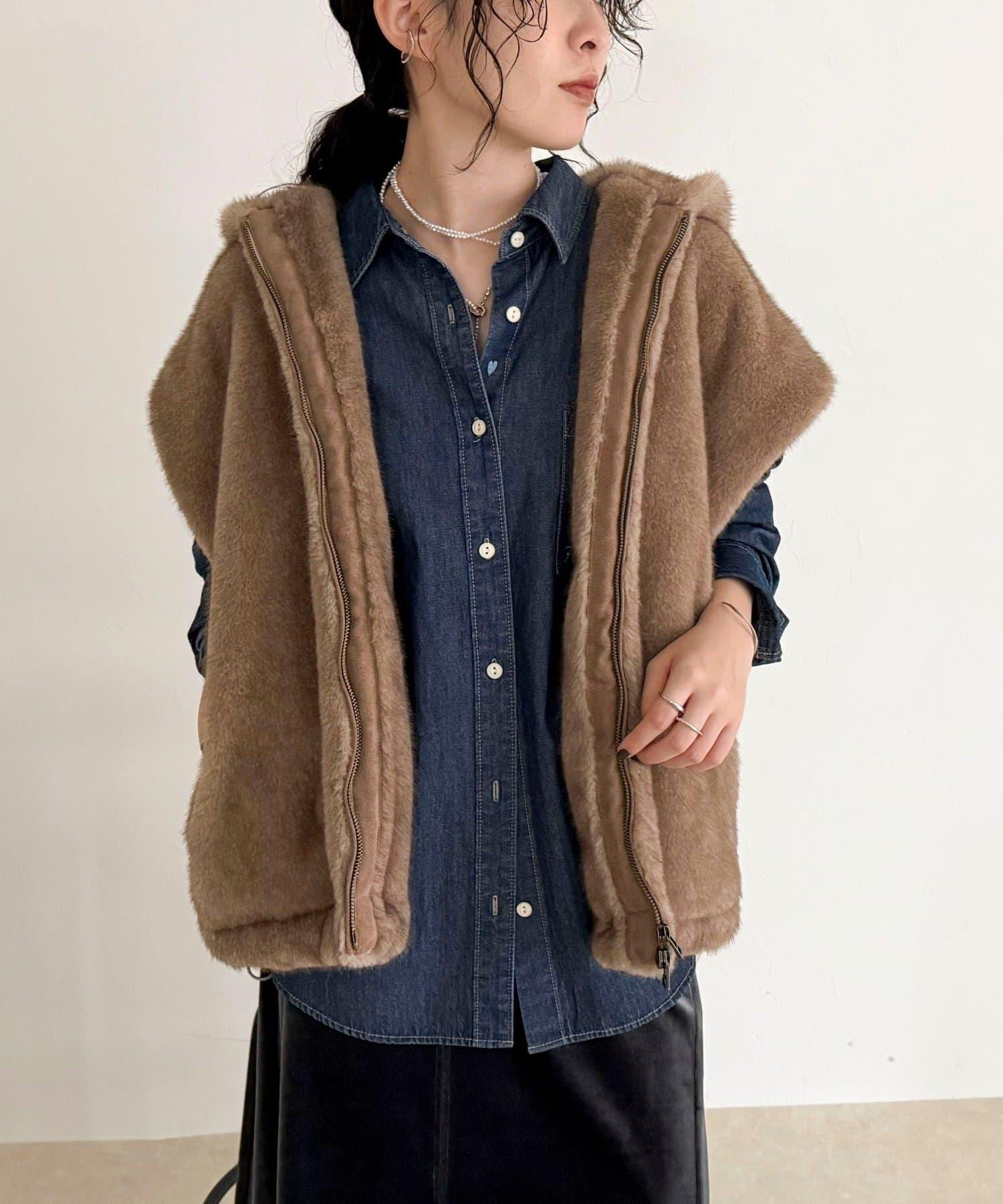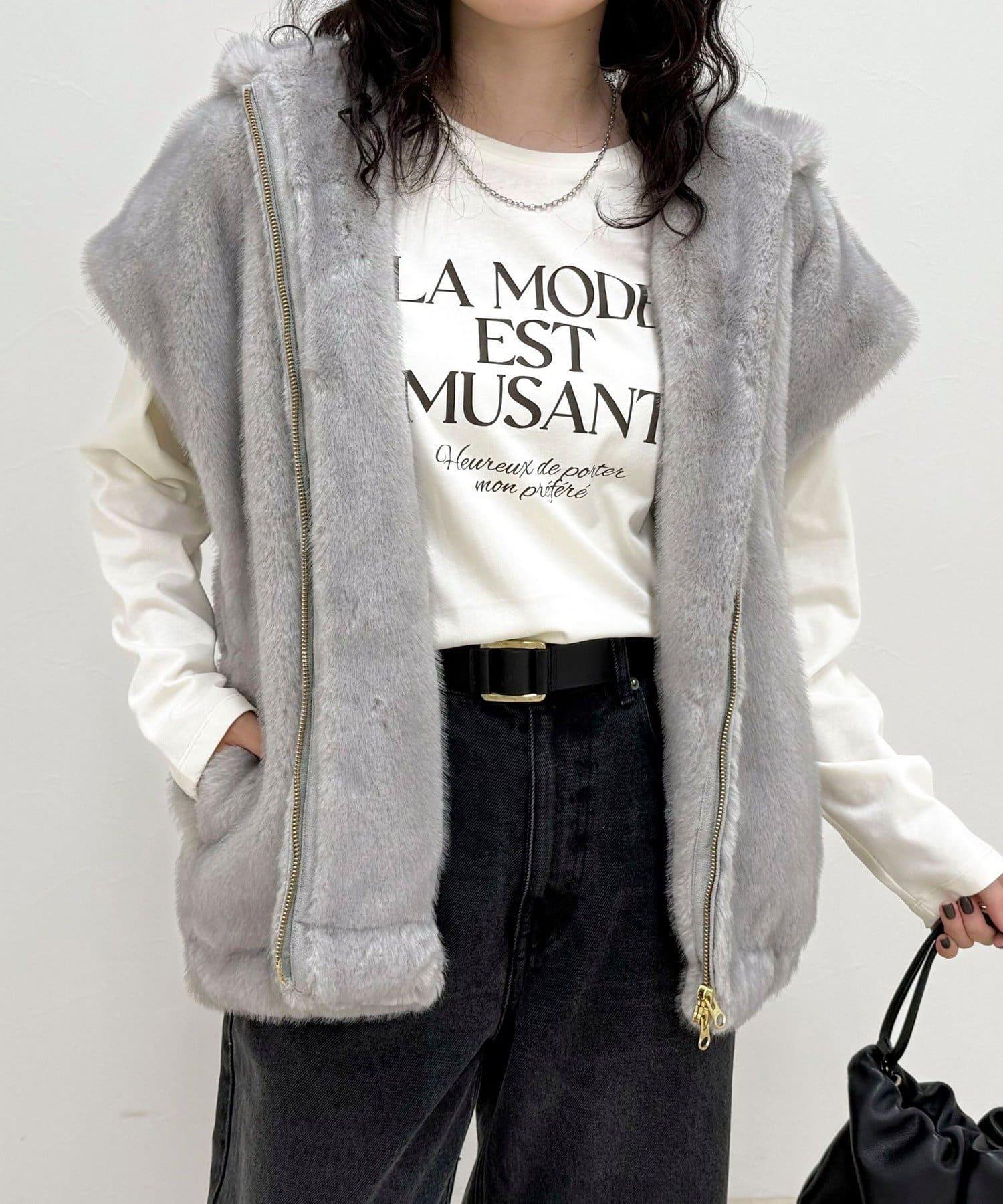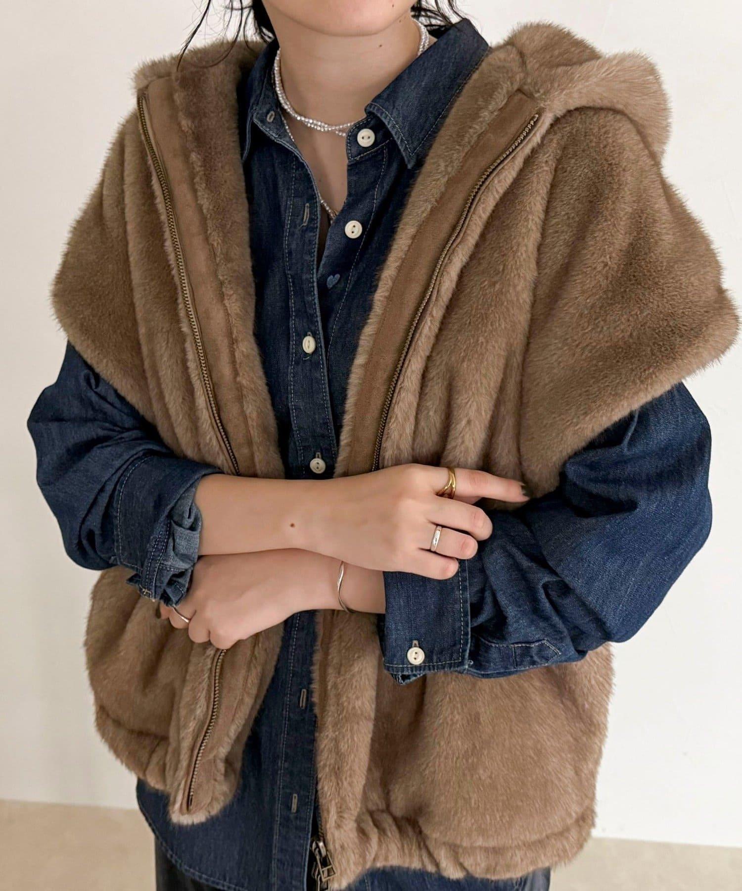 使用人造皮草的連帽馬甲,氣場十足。
