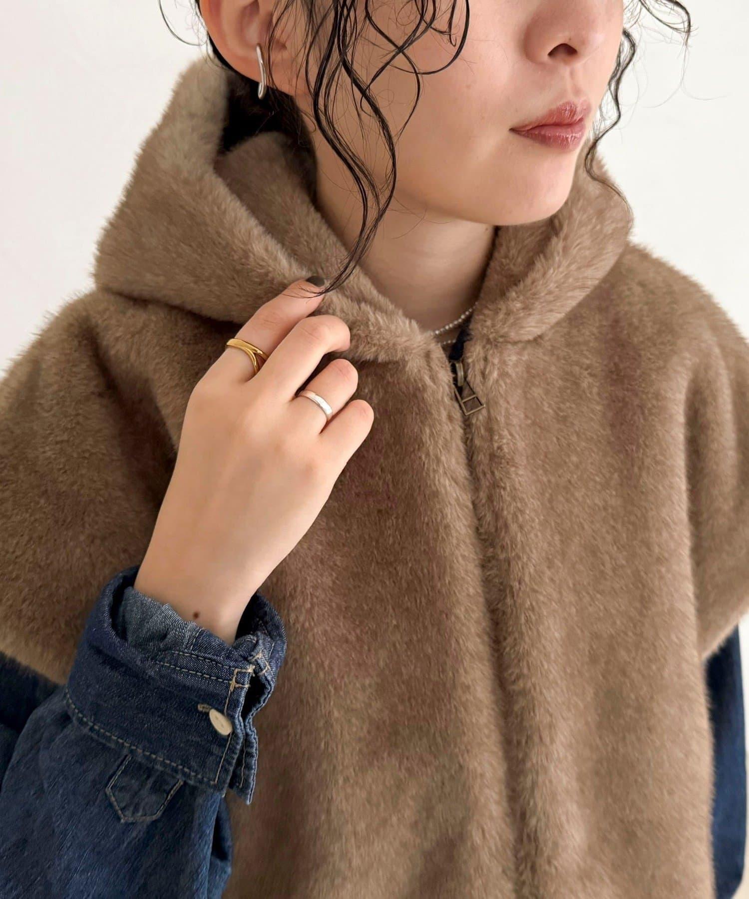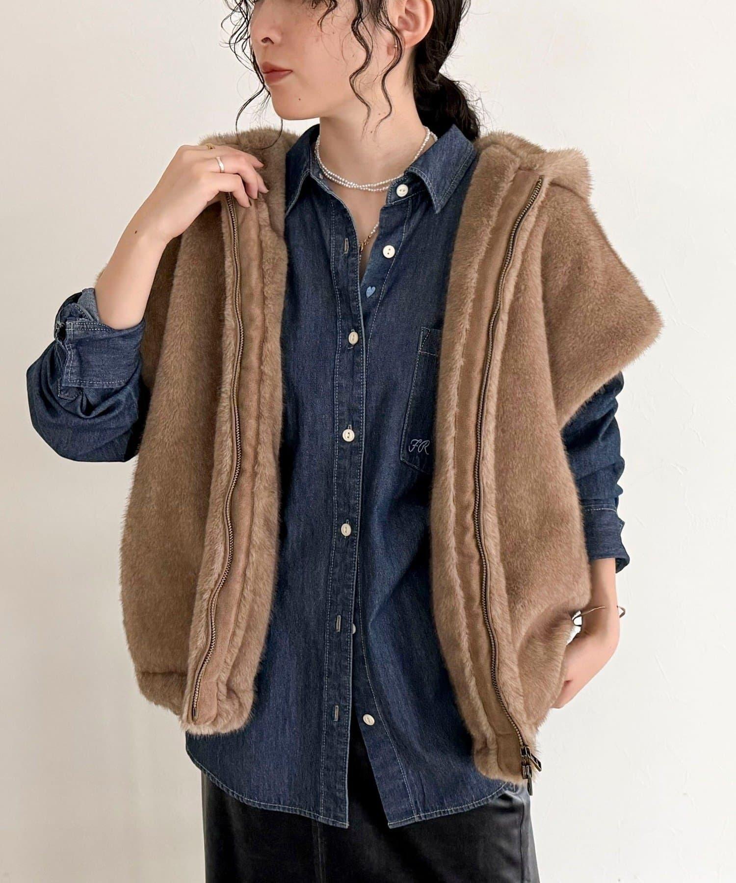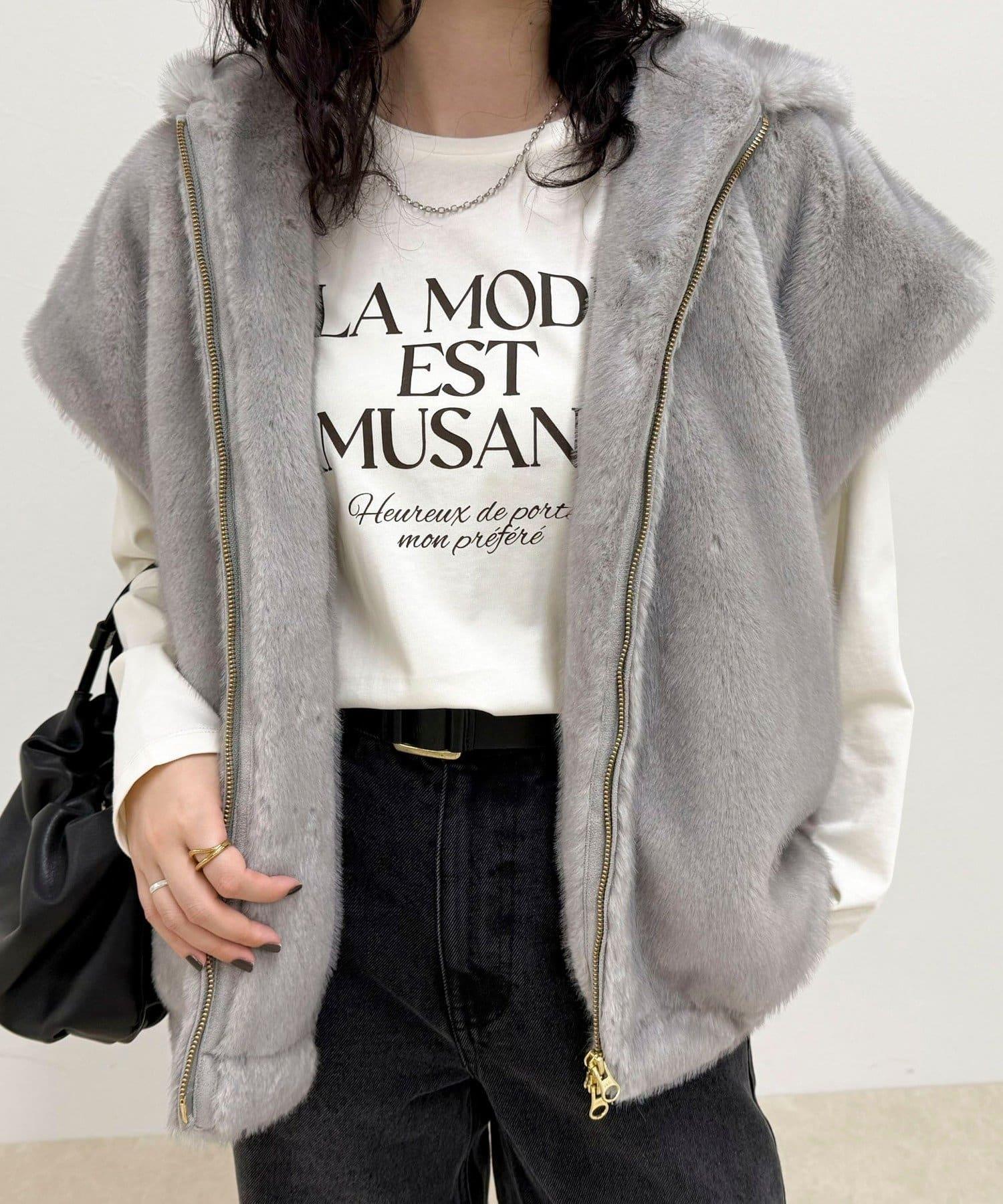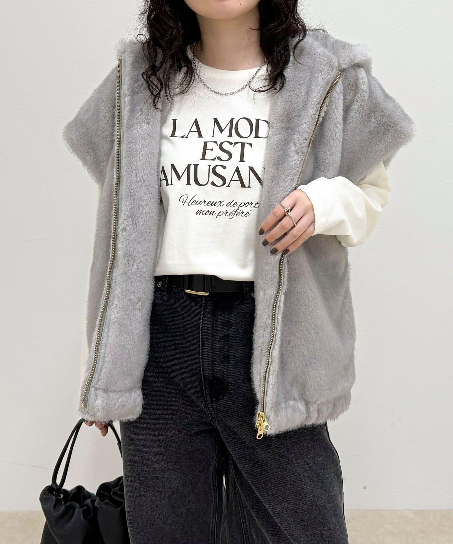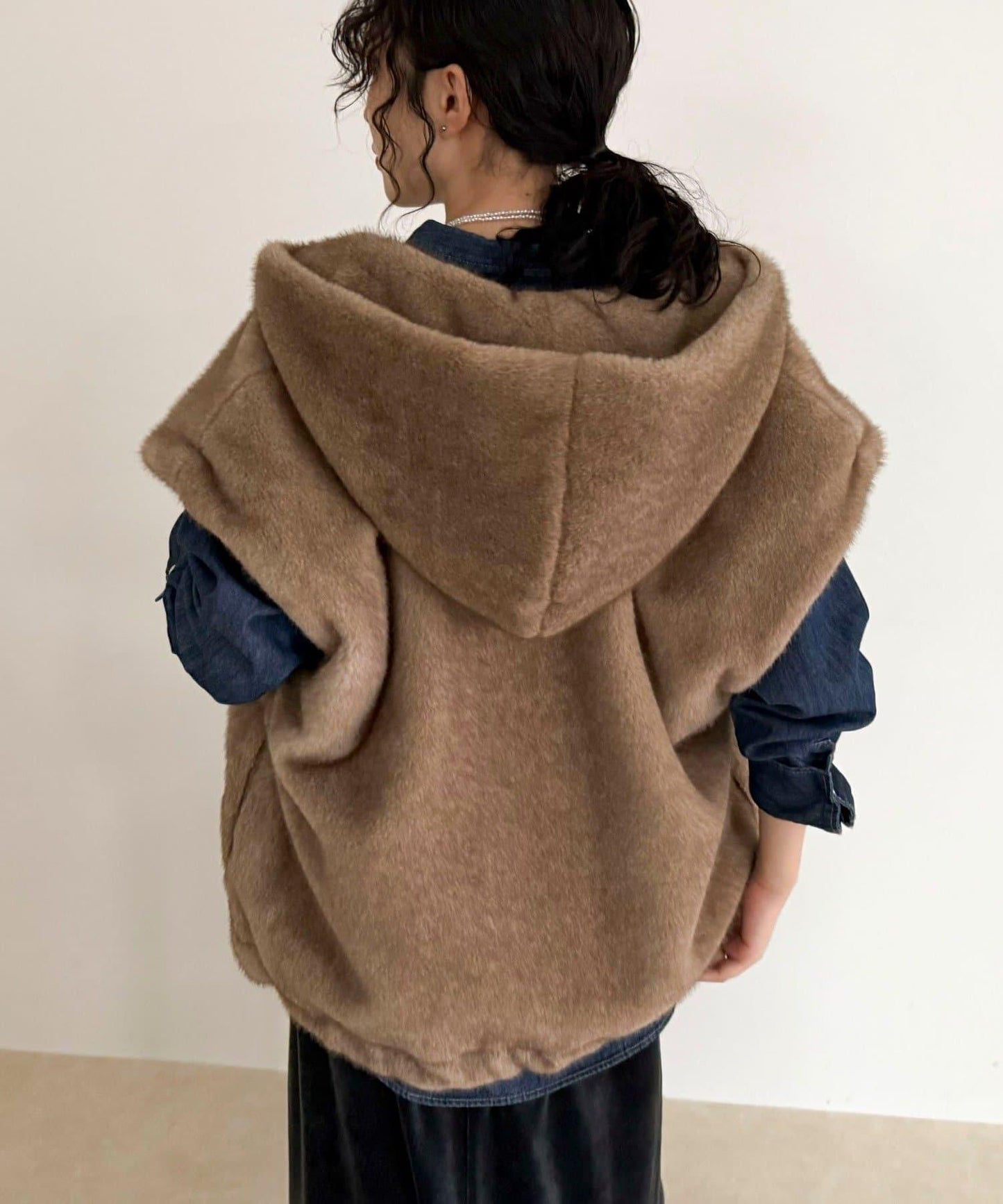 使用人造皮草的連帽馬甲,氣場十足。