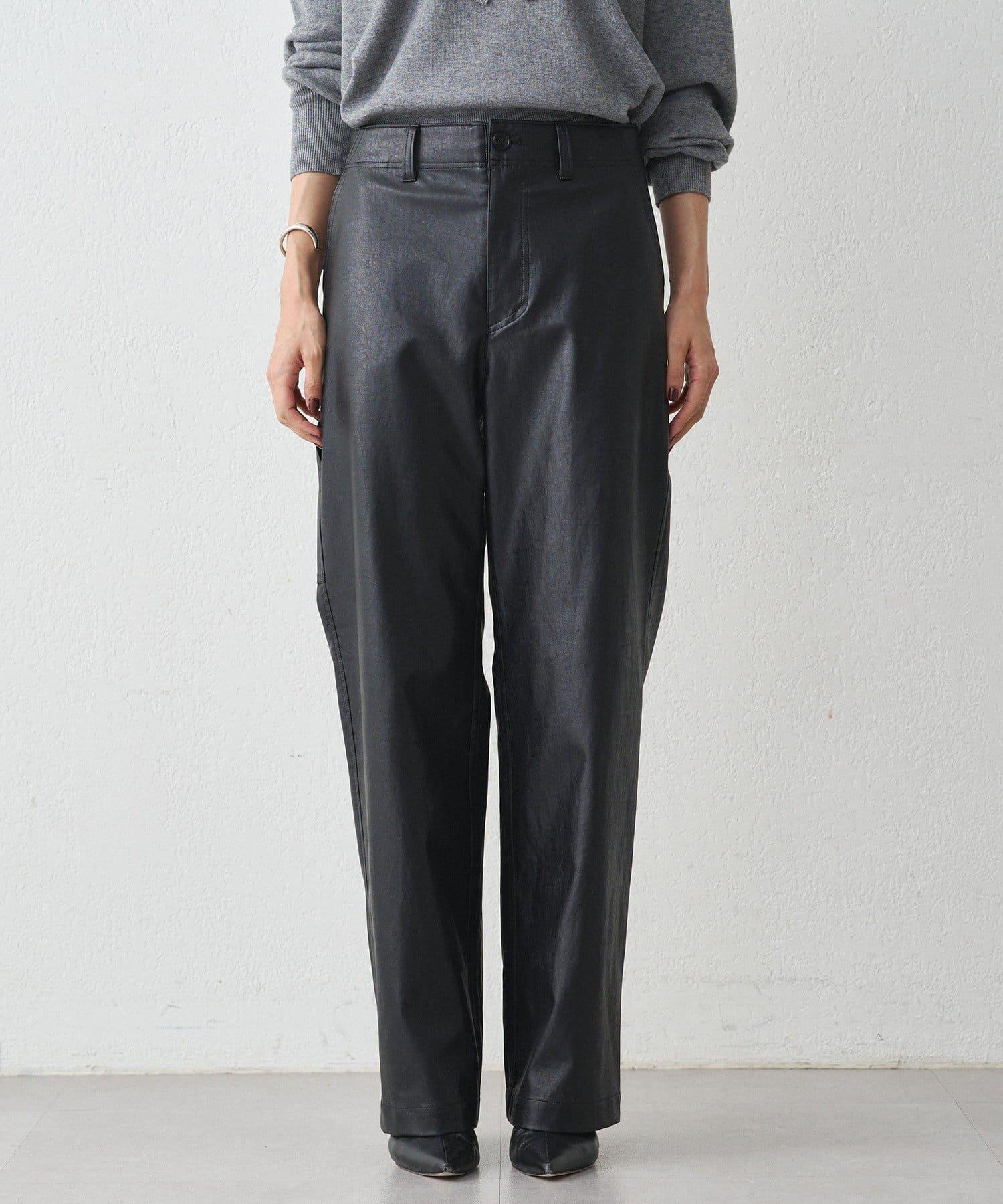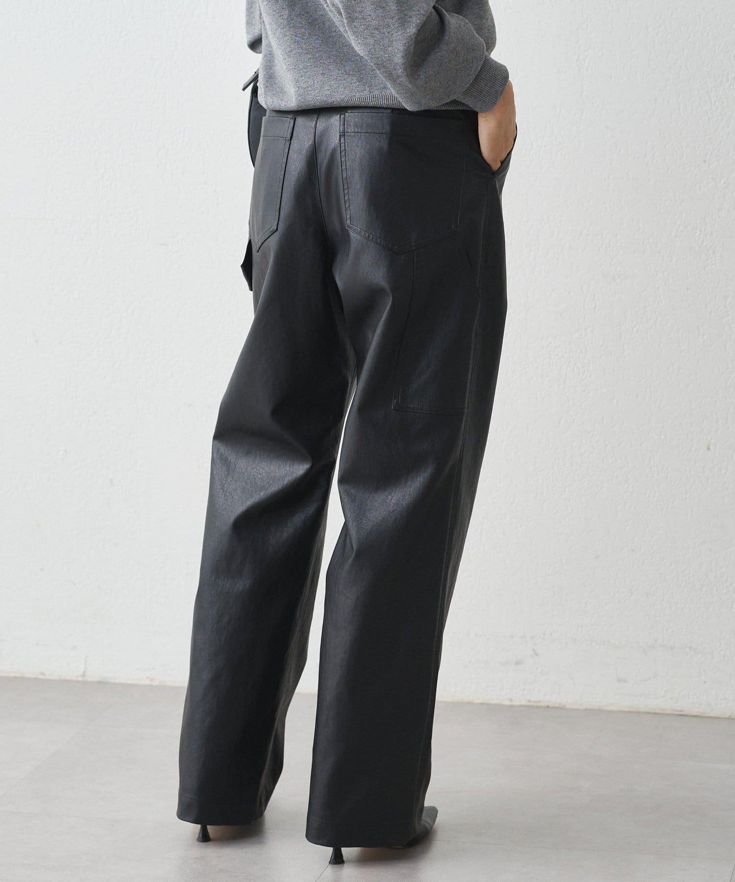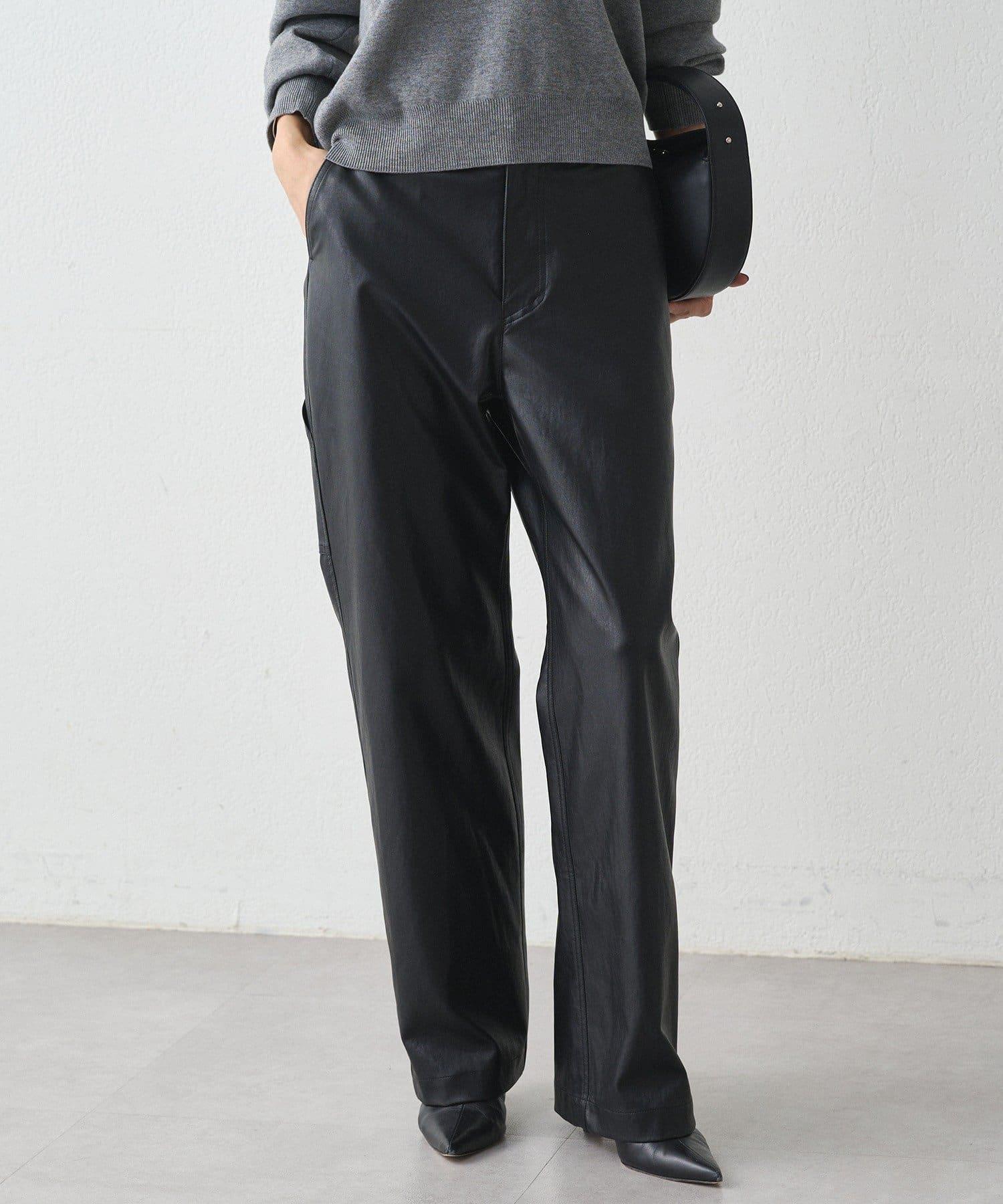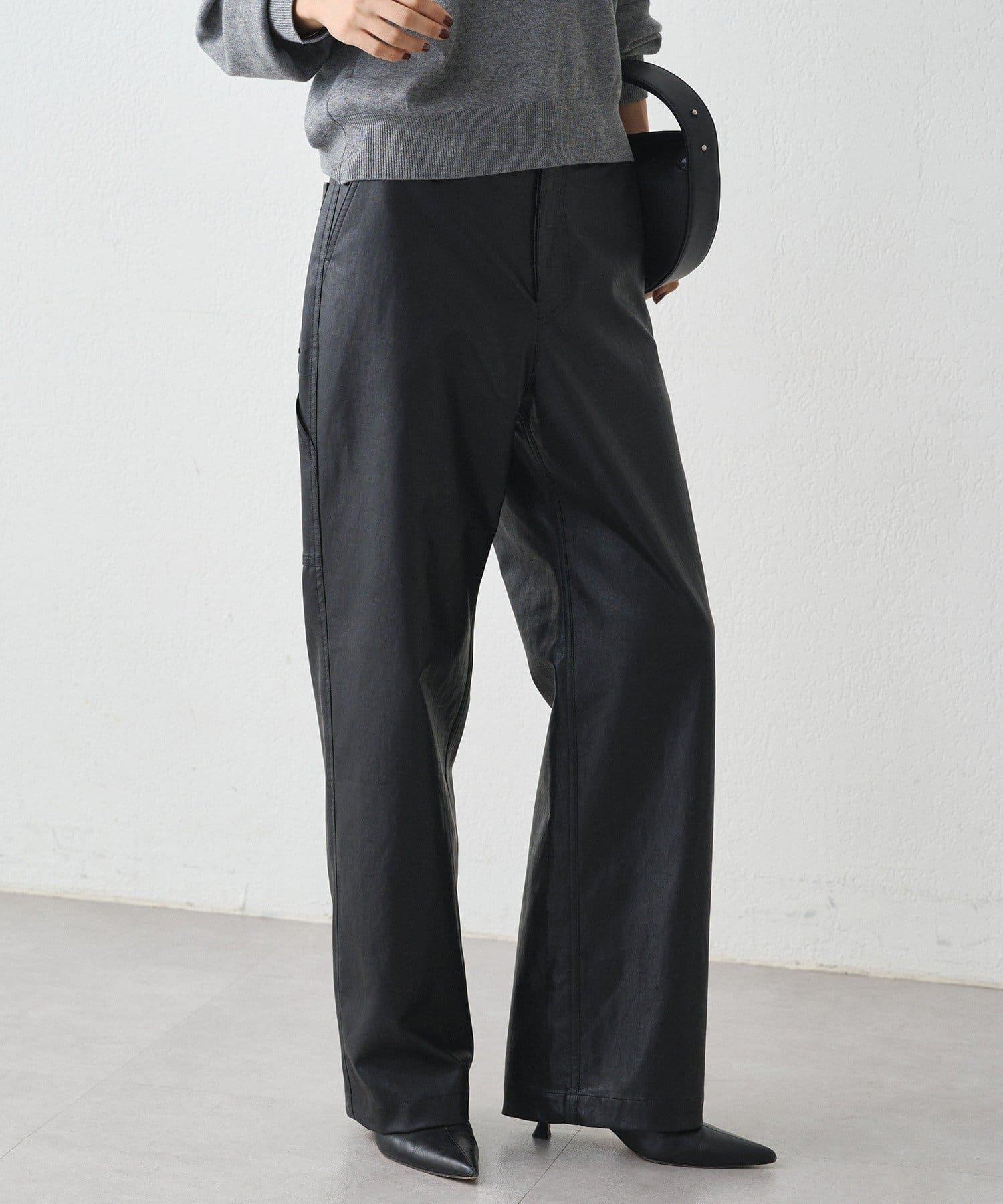 皮革長褲光澤度恰到好處,版型寬鬆。