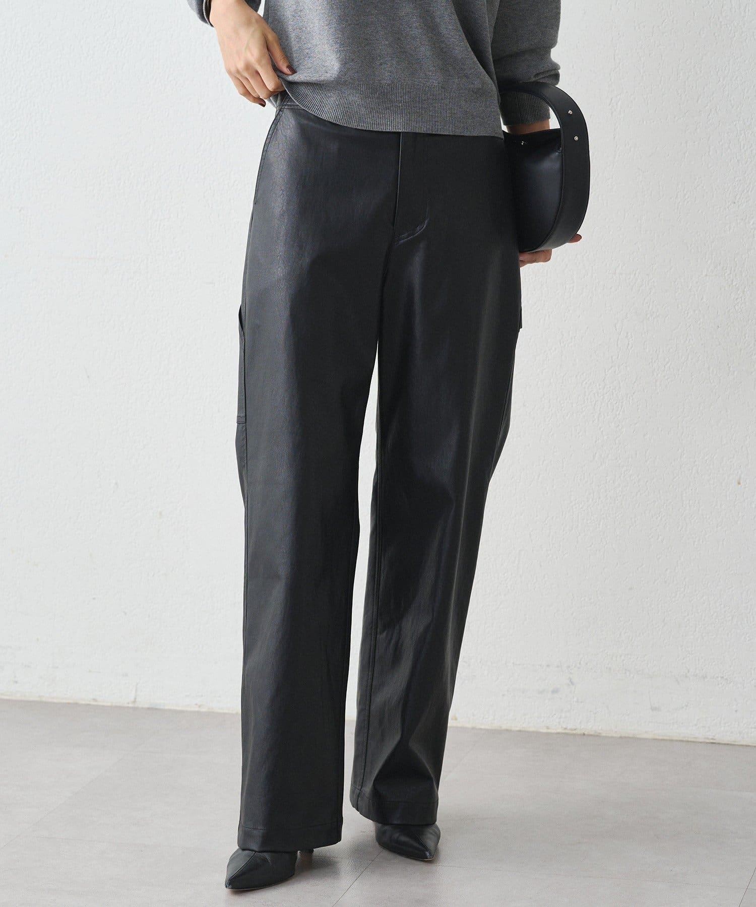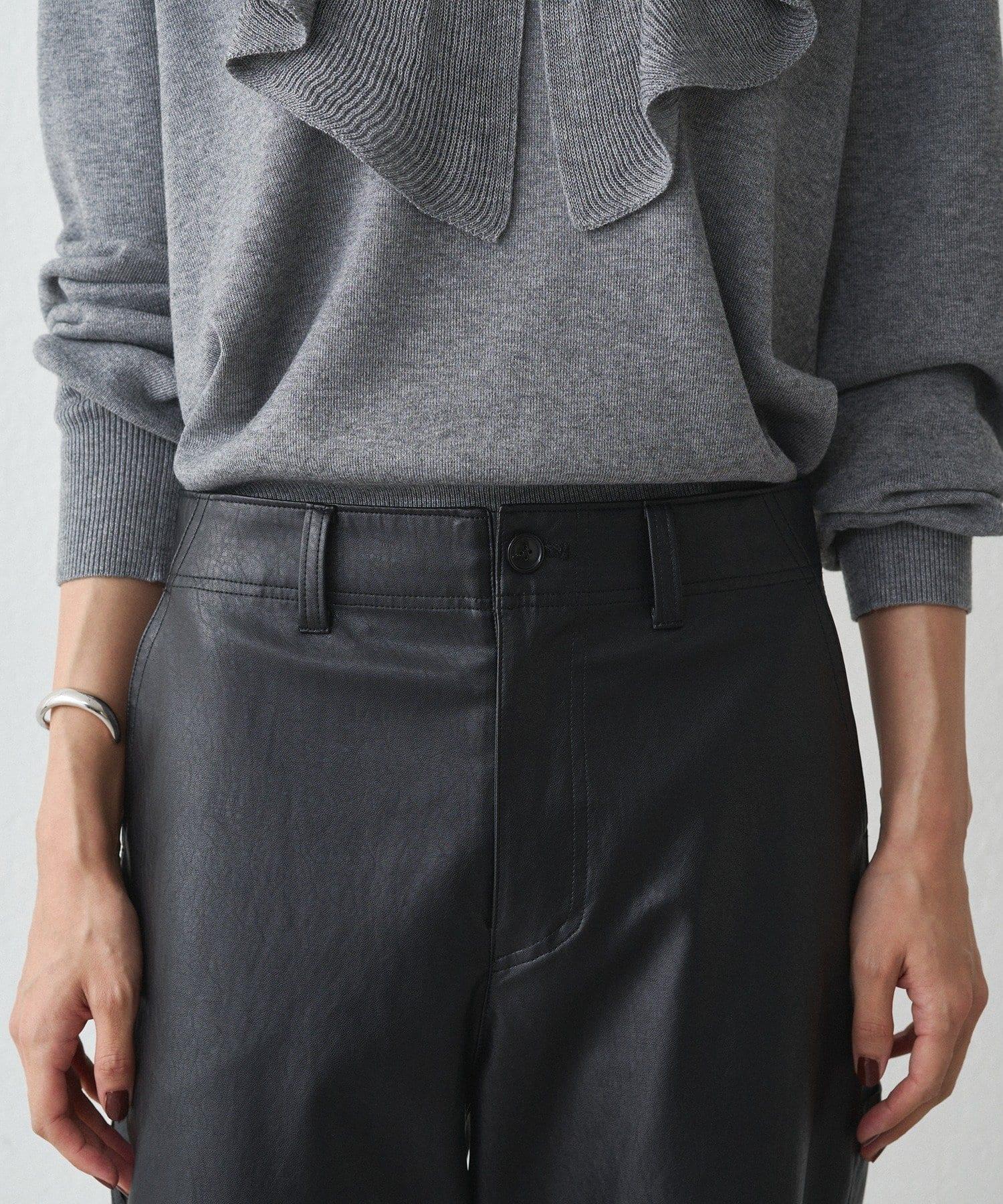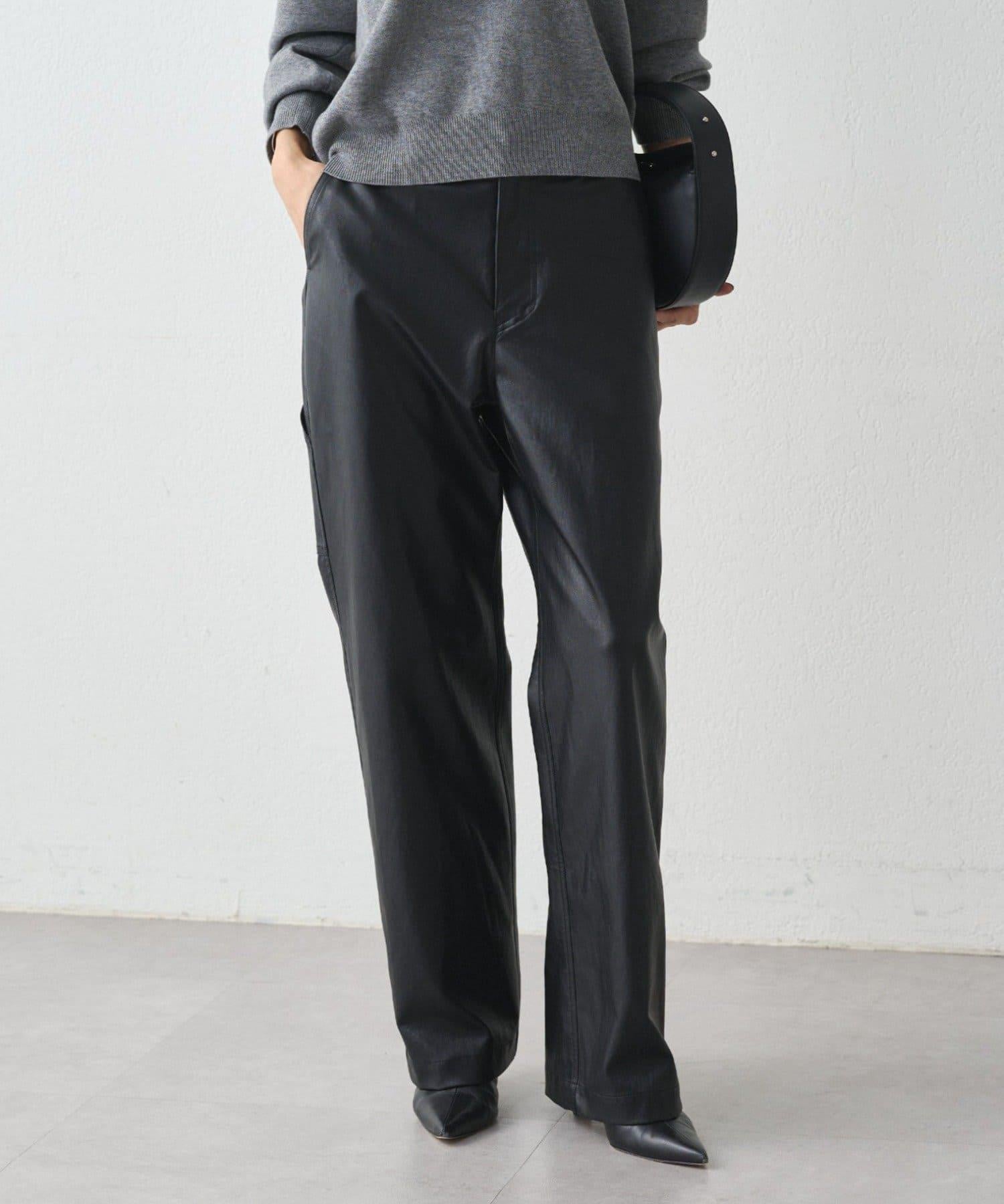 皮革長褲光澤度恰到好處,版型寬鬆。