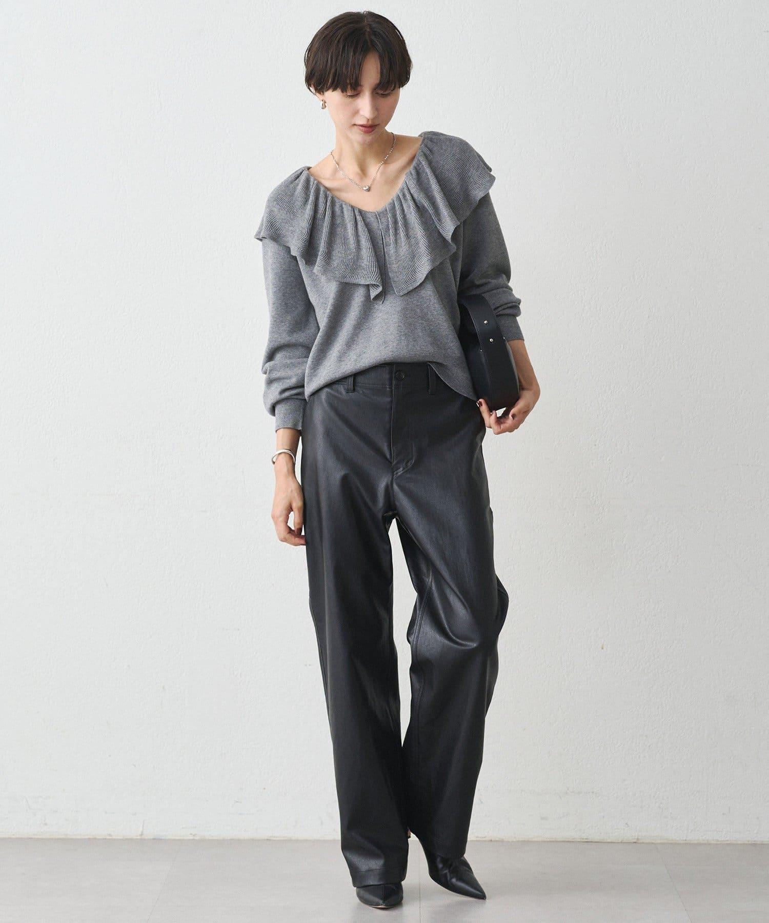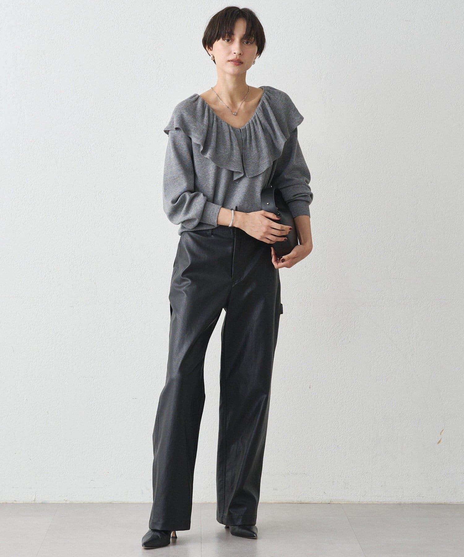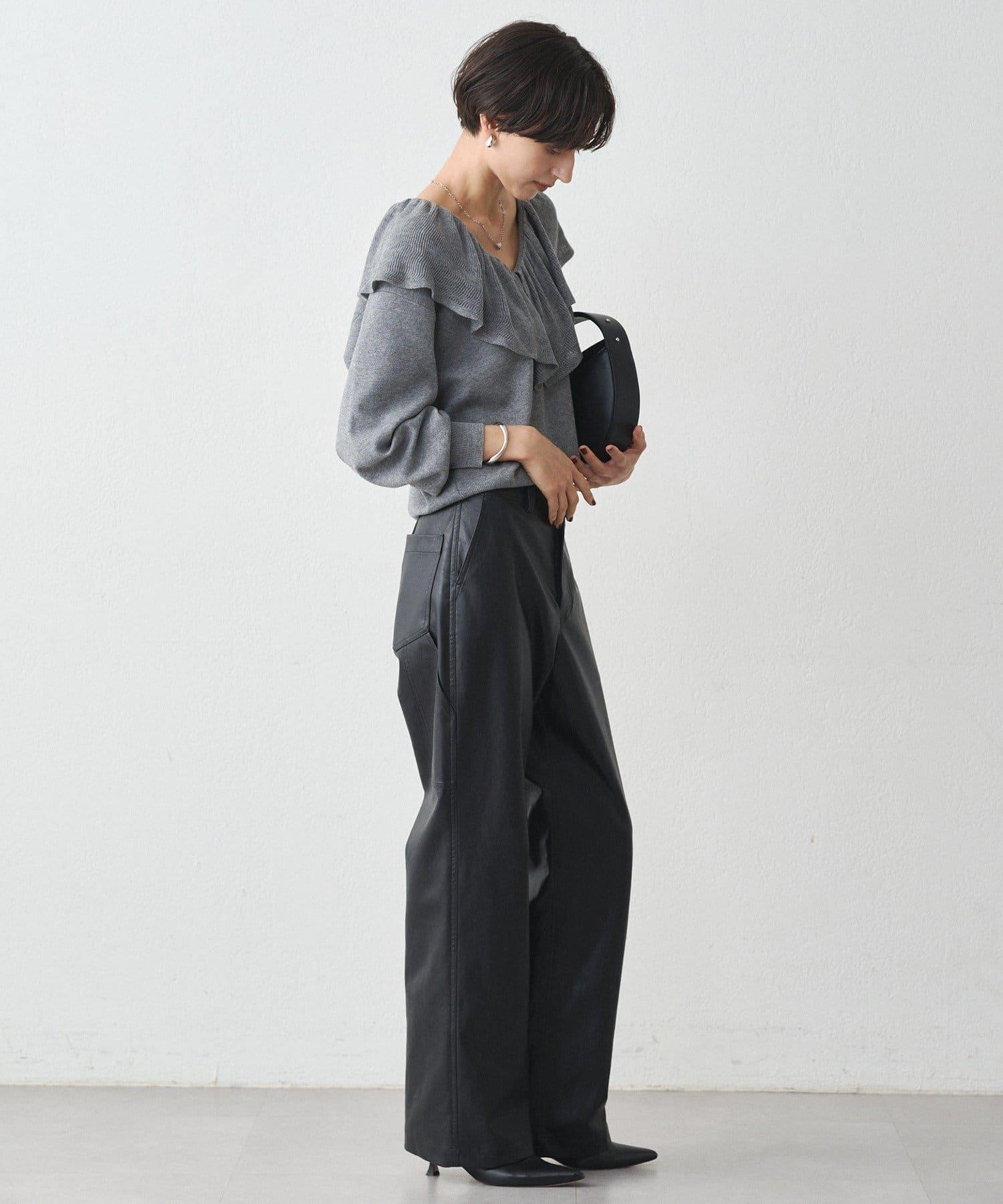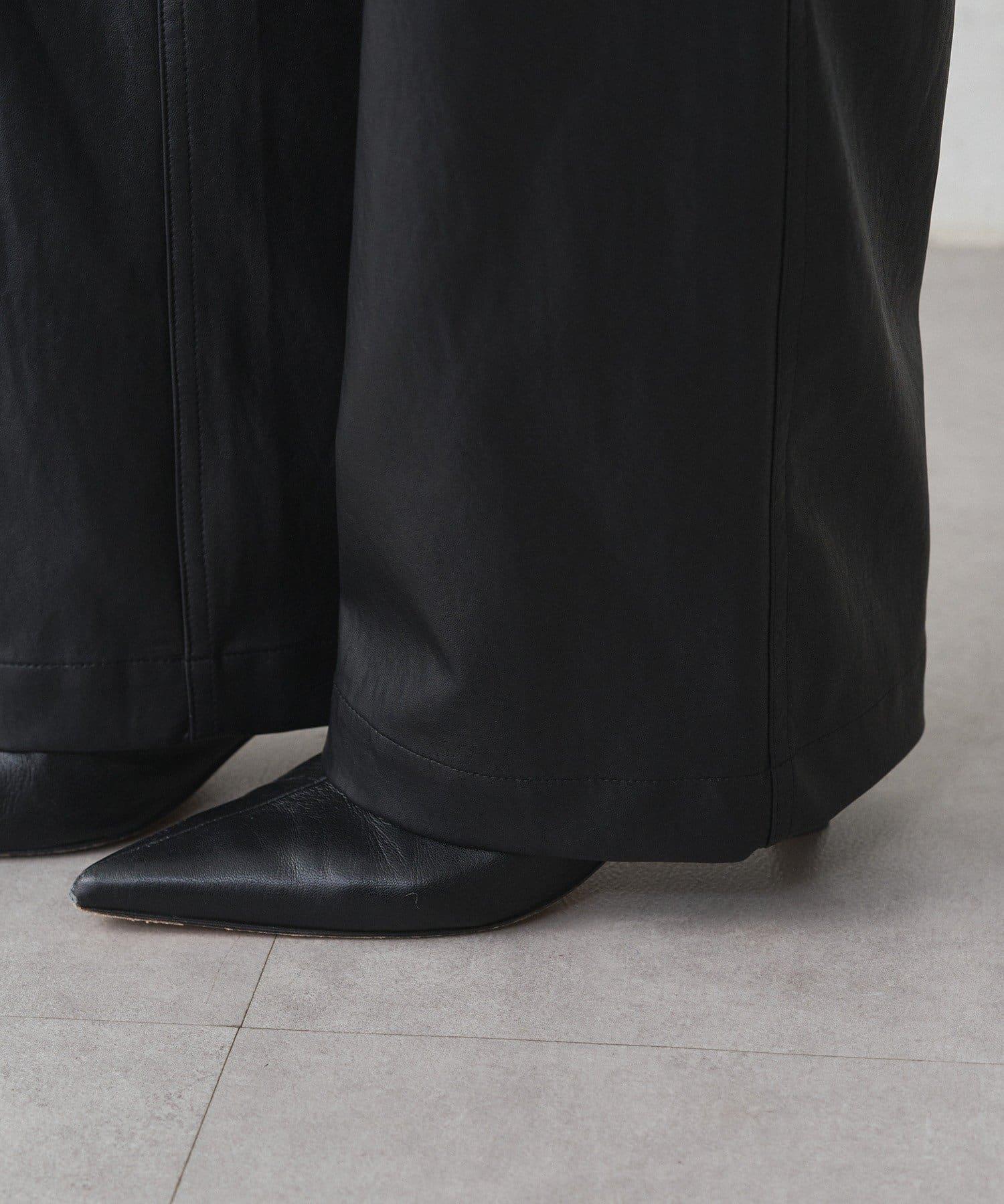 皮革長褲光澤度恰到好處,版型寬鬆。