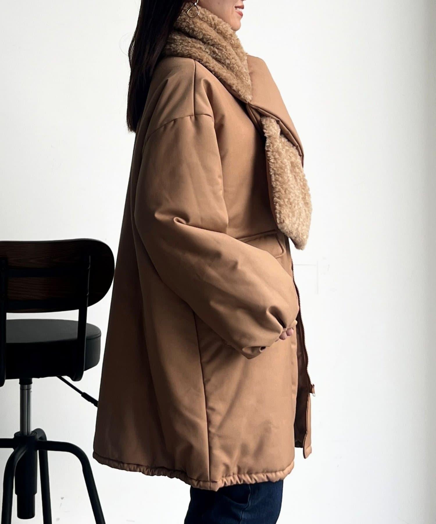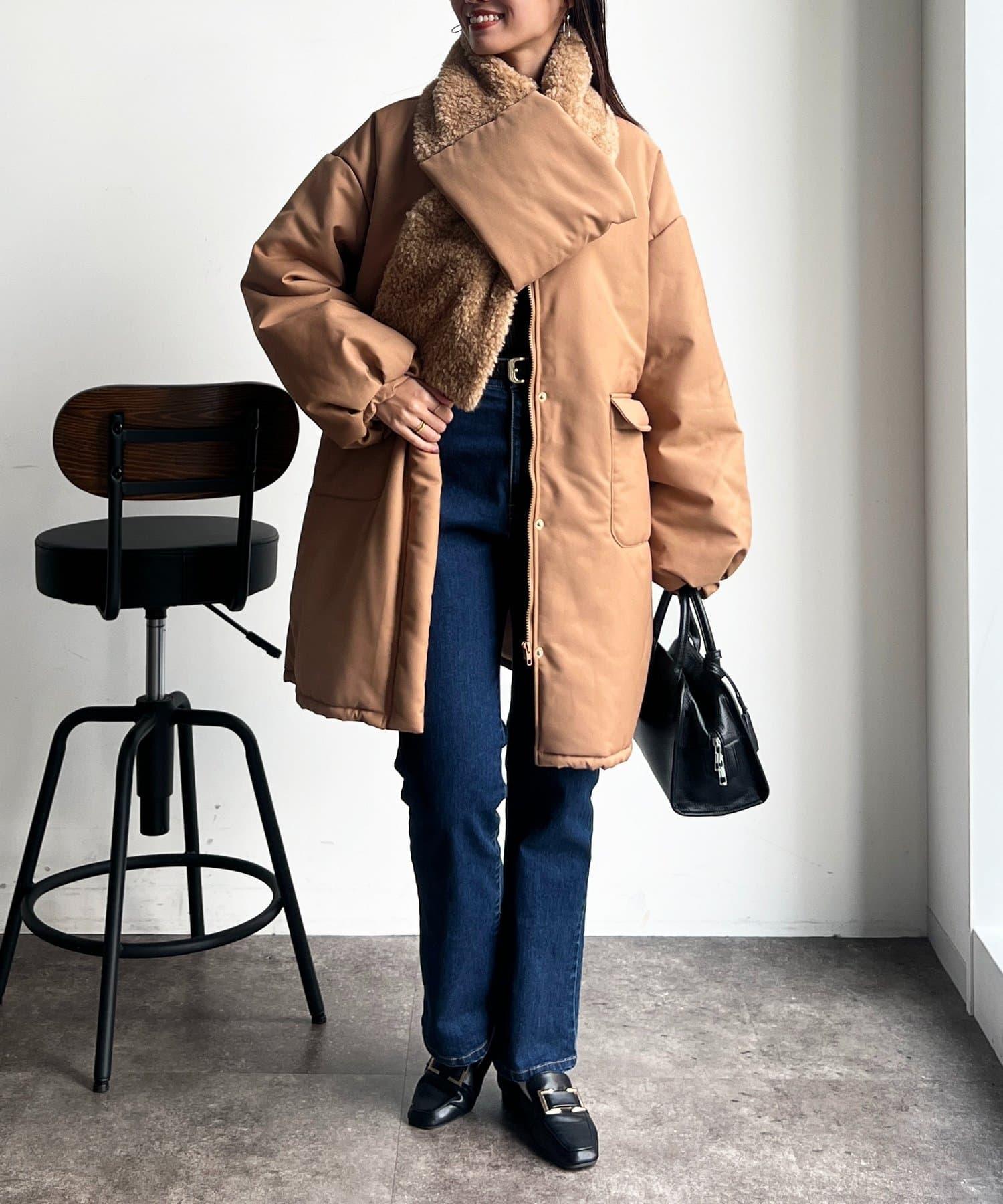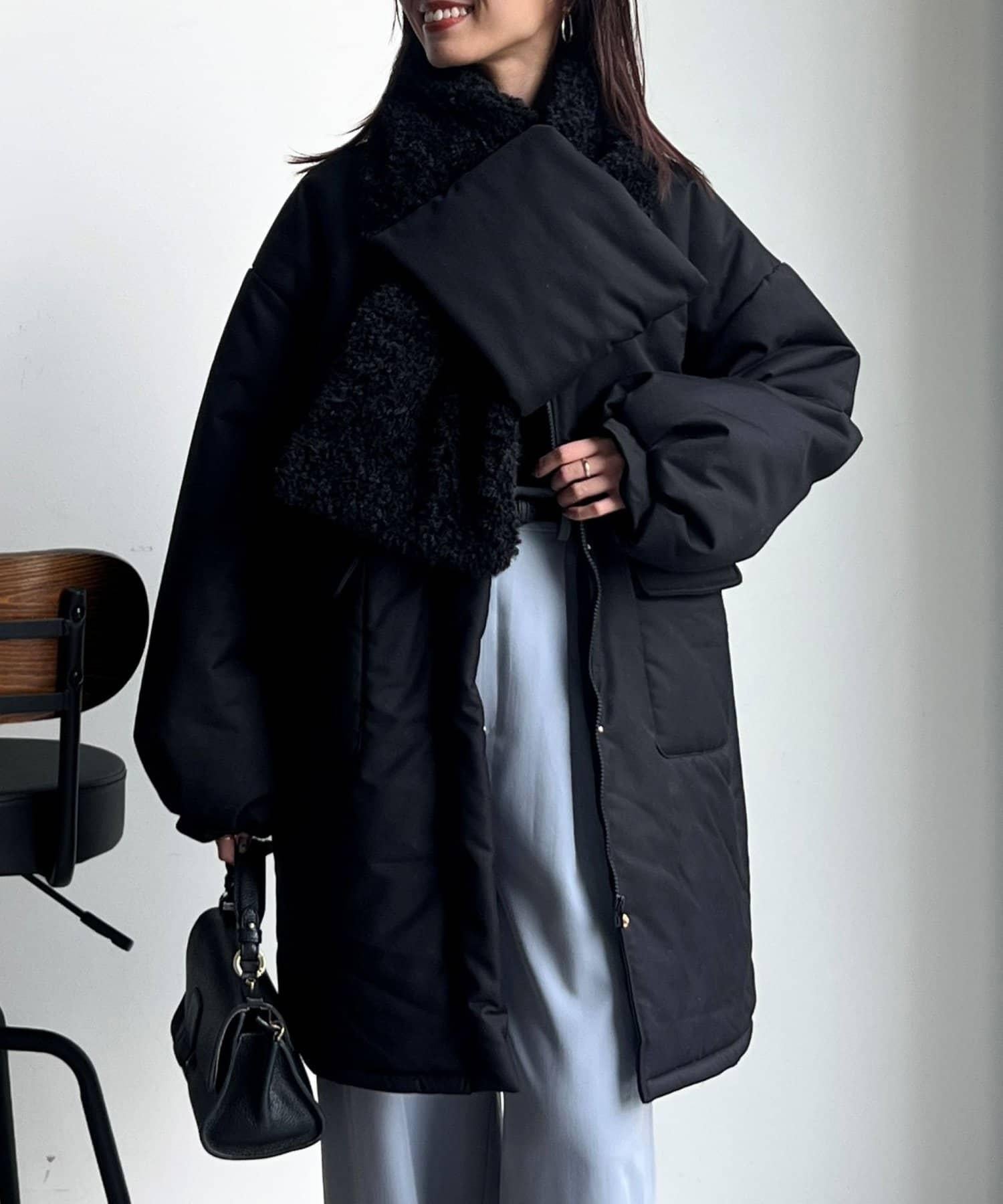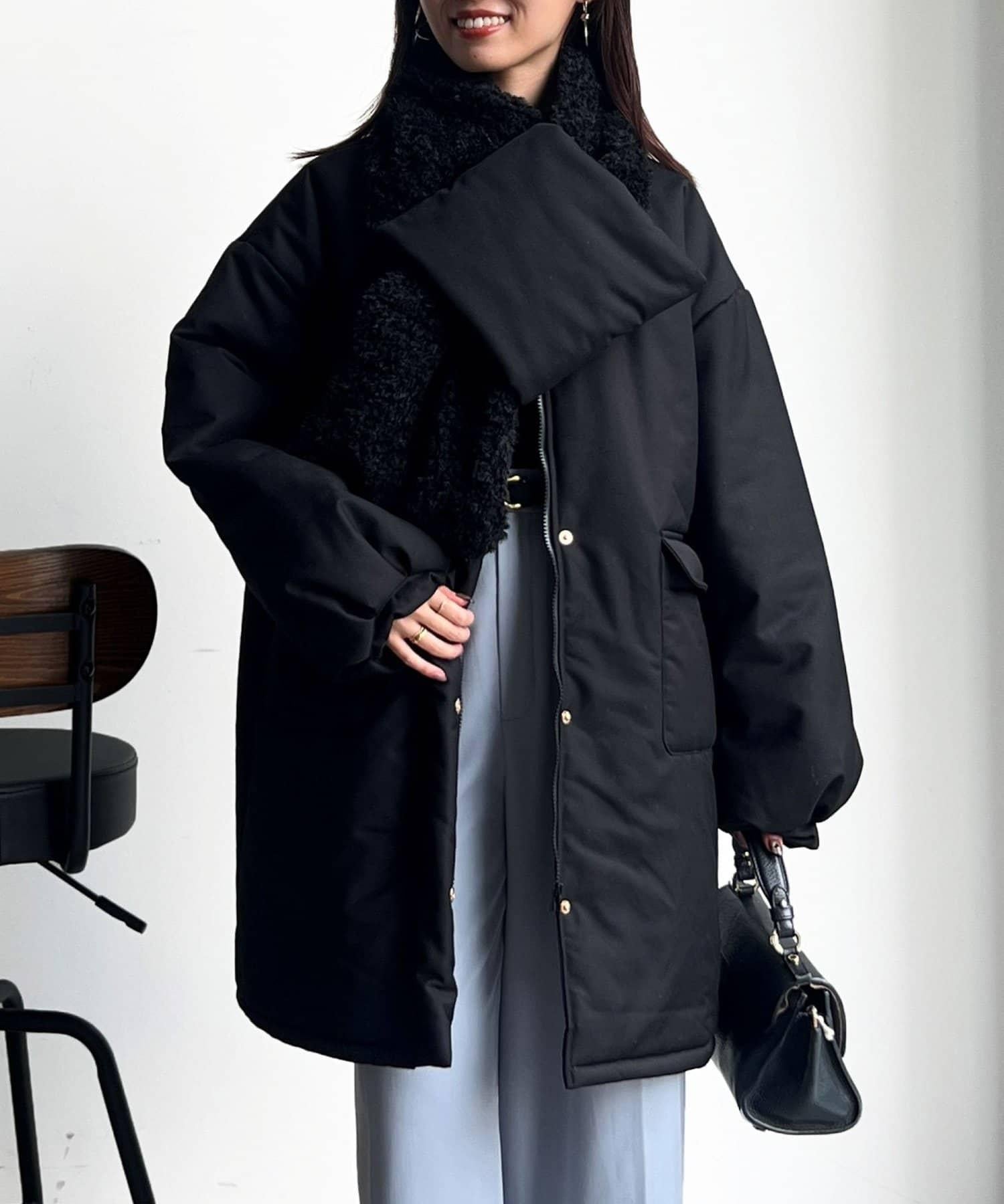 這款單品是一套無領羽絨服和一條羽絨圍巾,非常適合冬季穿著。