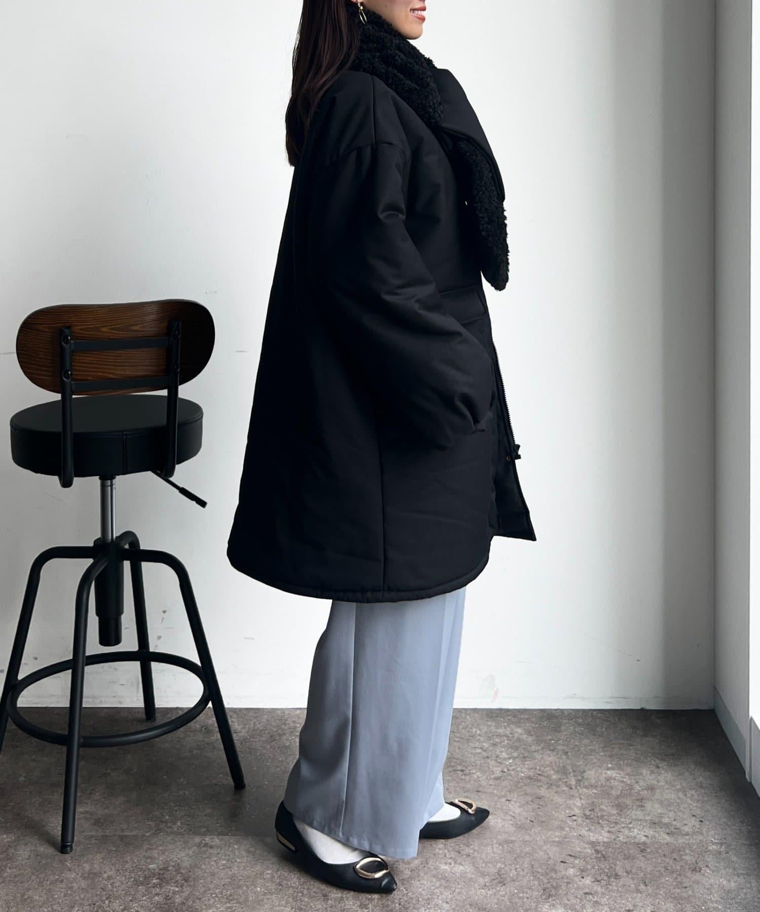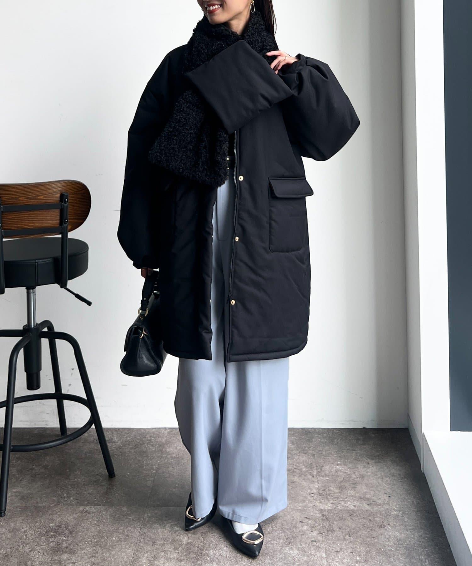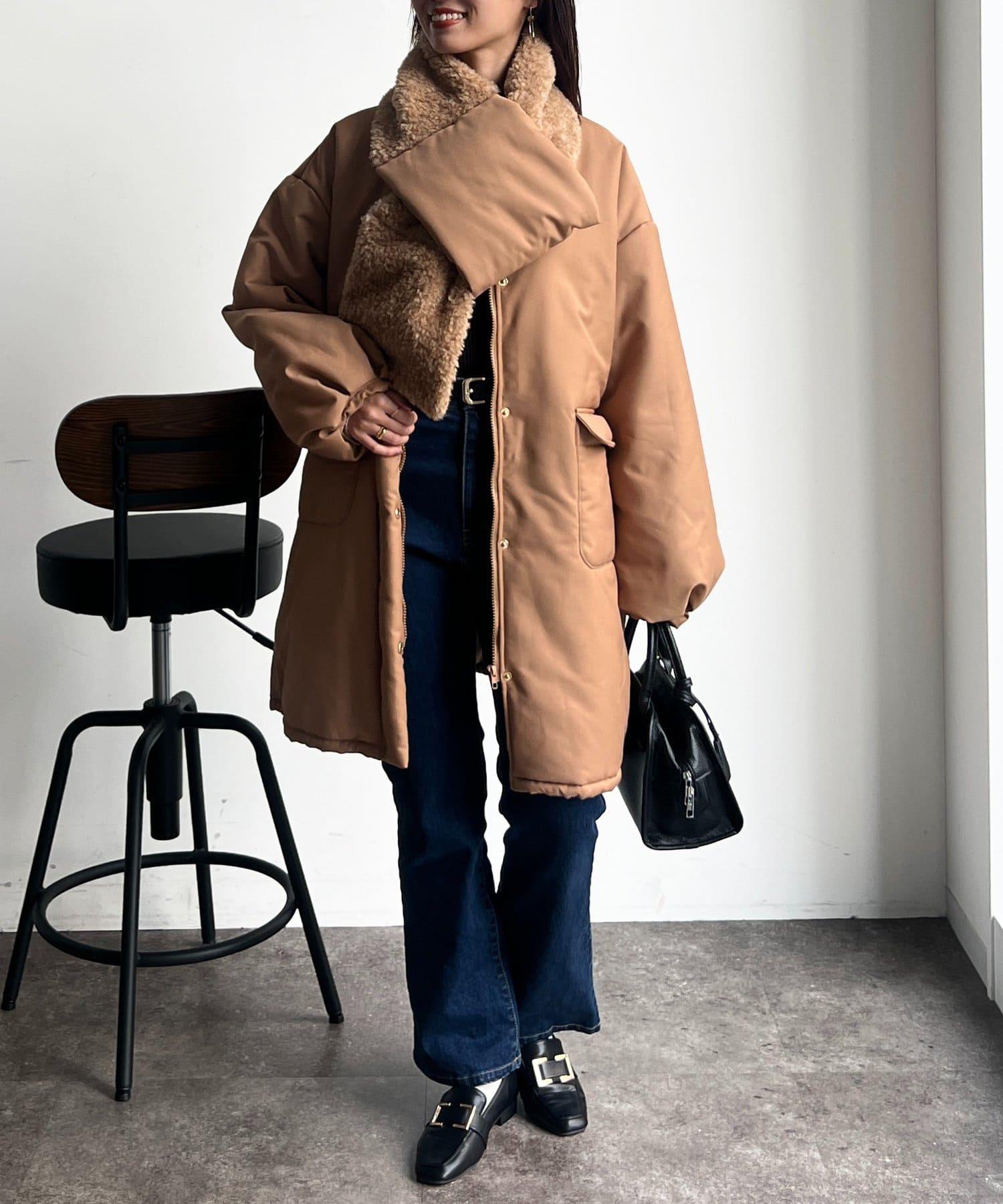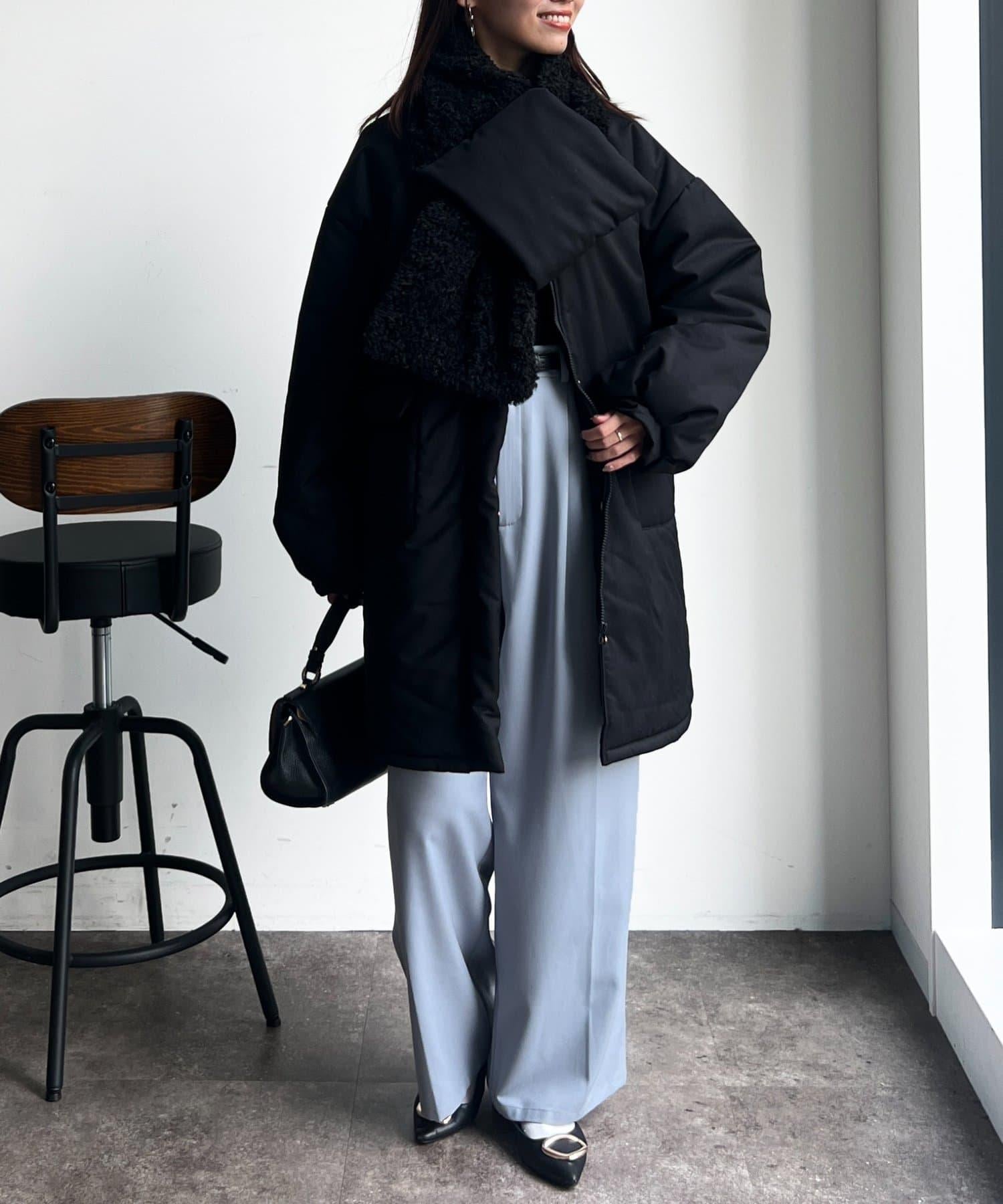 這款單品是一套無領羽絨服和一條羽絨圍巾,非常適合冬季穿著。