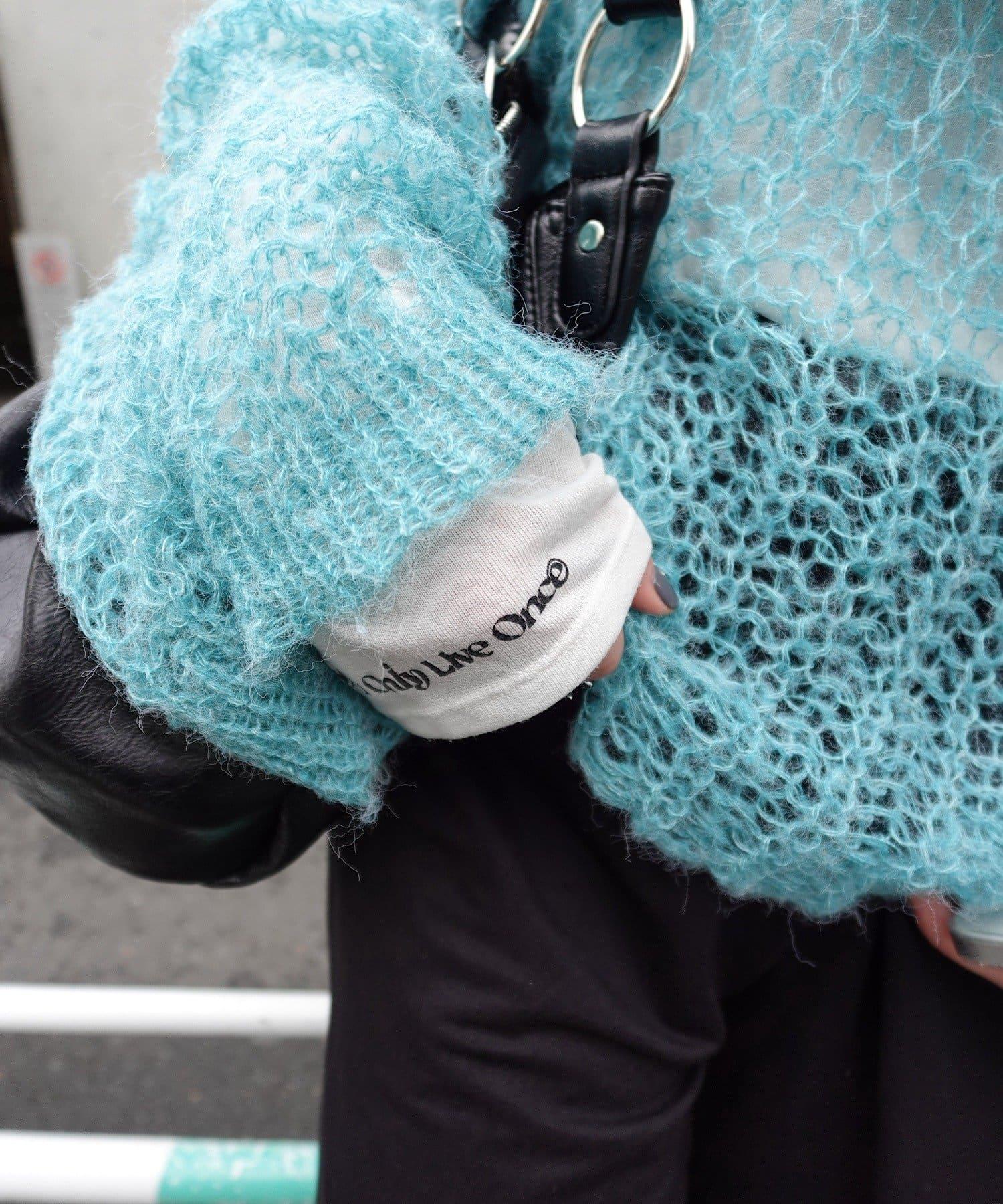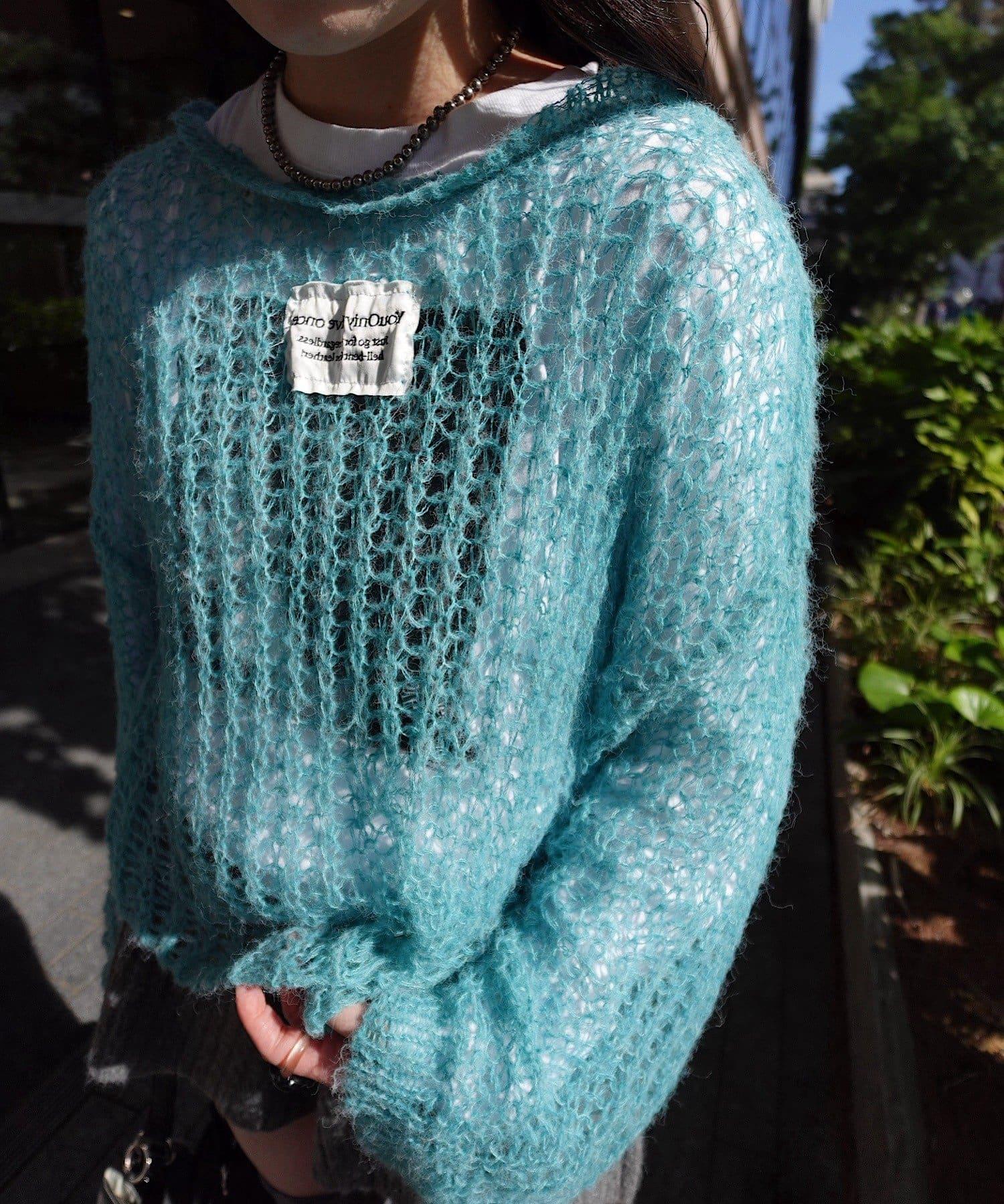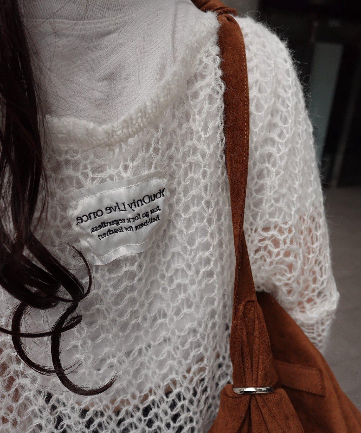 類似馬海毛的針織物,帶有透明針織物和徽標標籤。