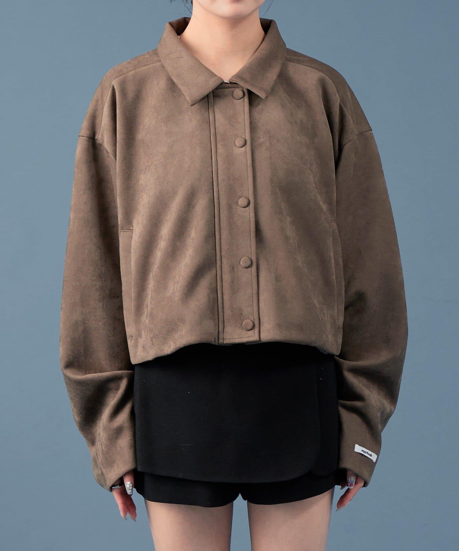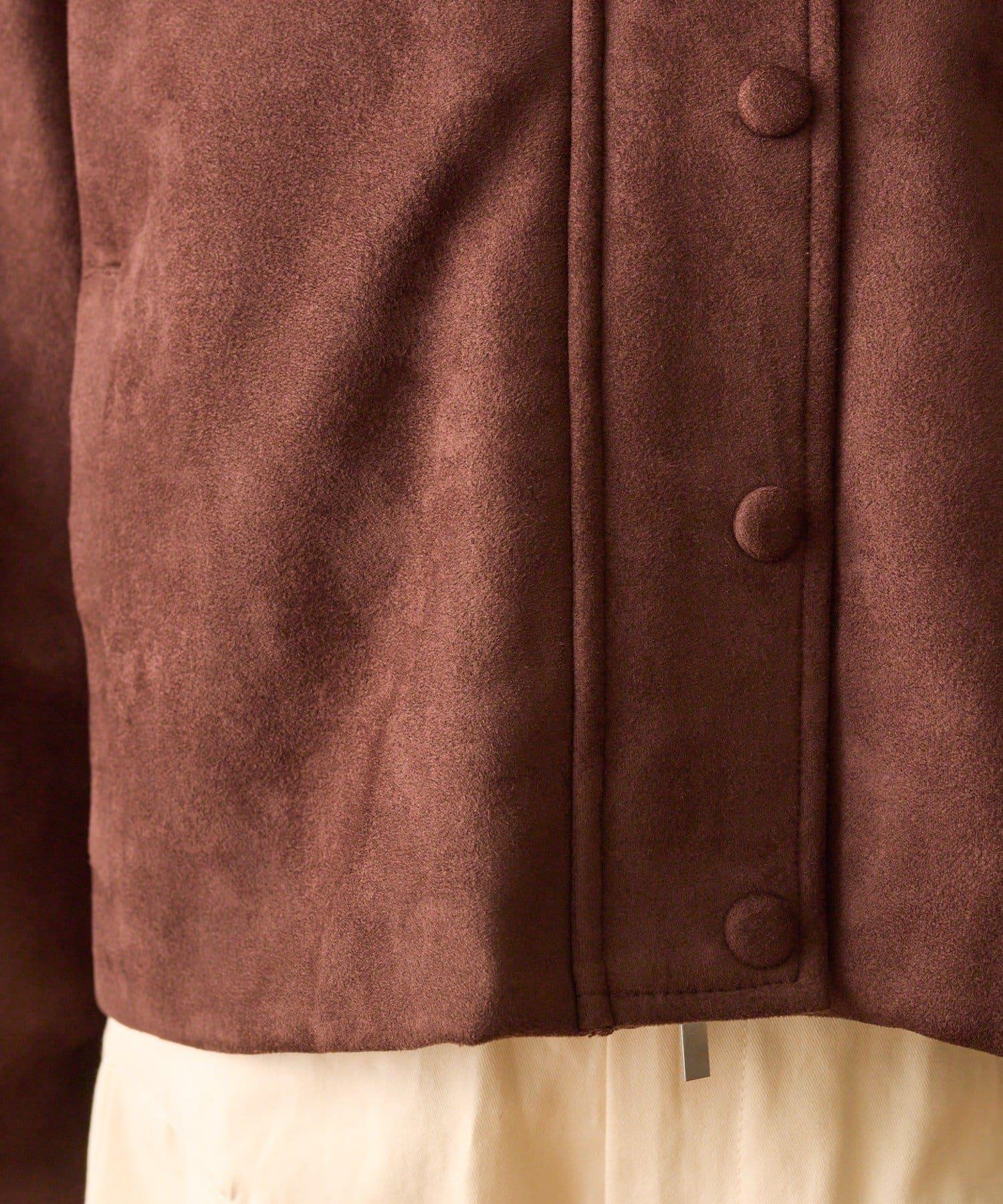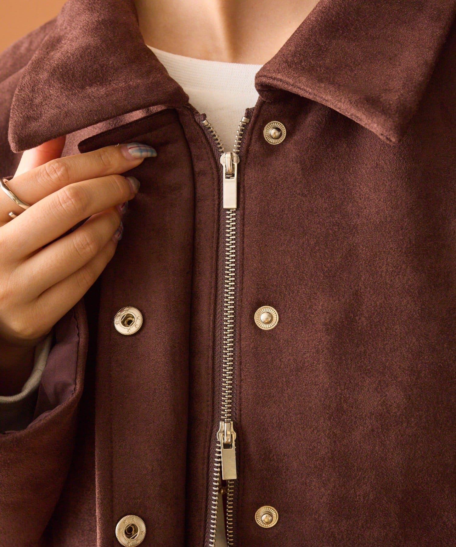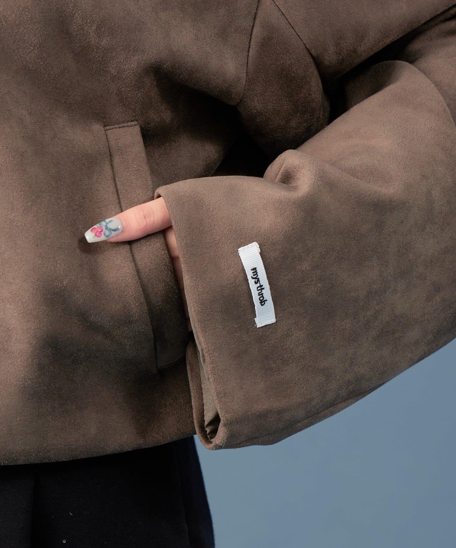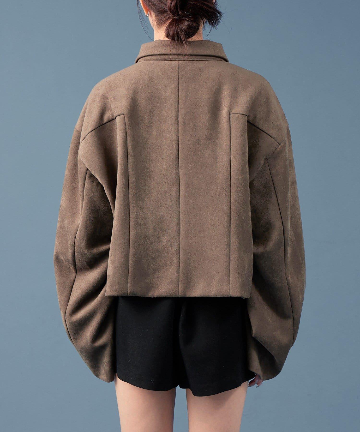 採用仿麂皮絨面料,是一款大氣的短外套。袖子寬大,可寬鬆穿著。