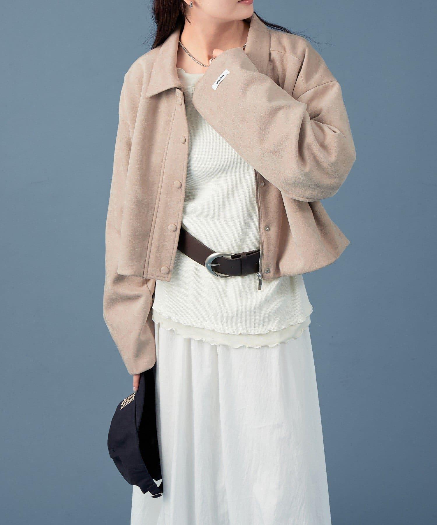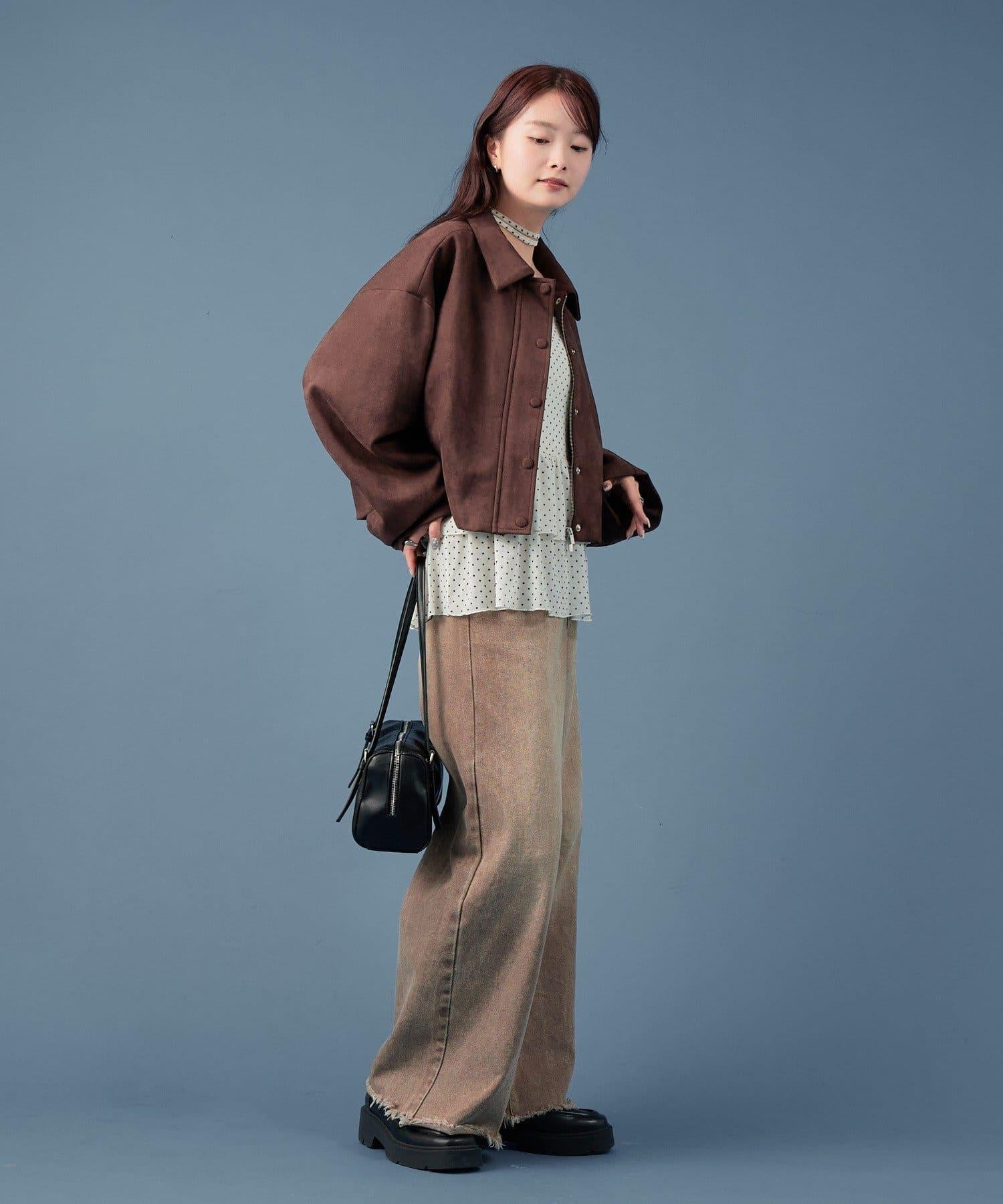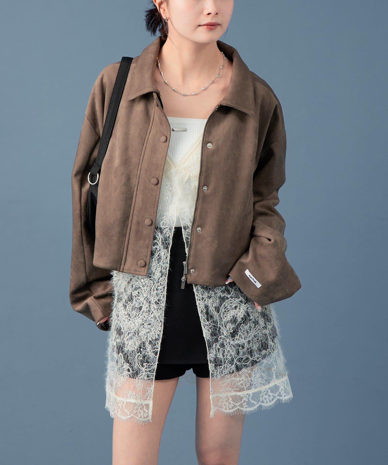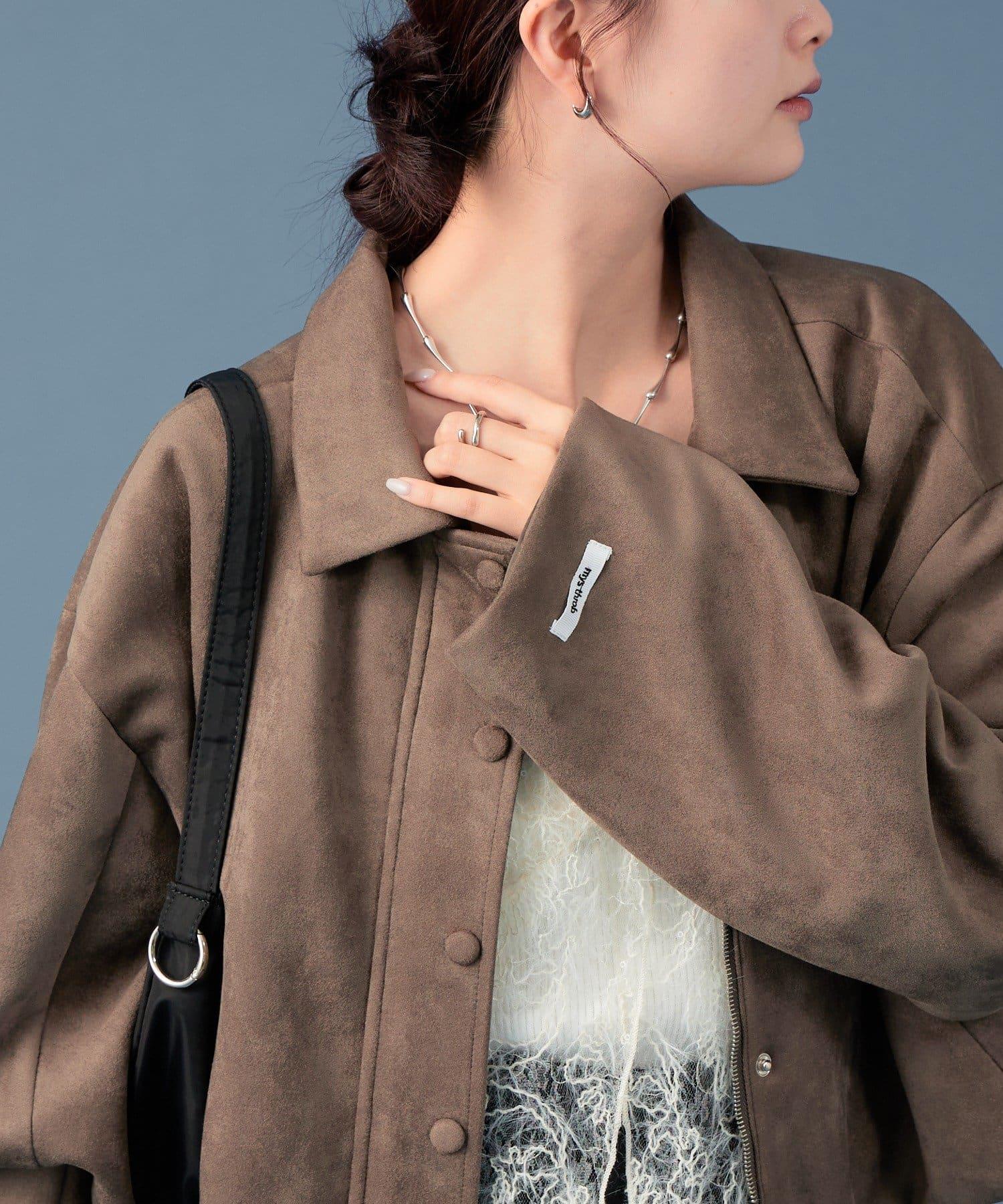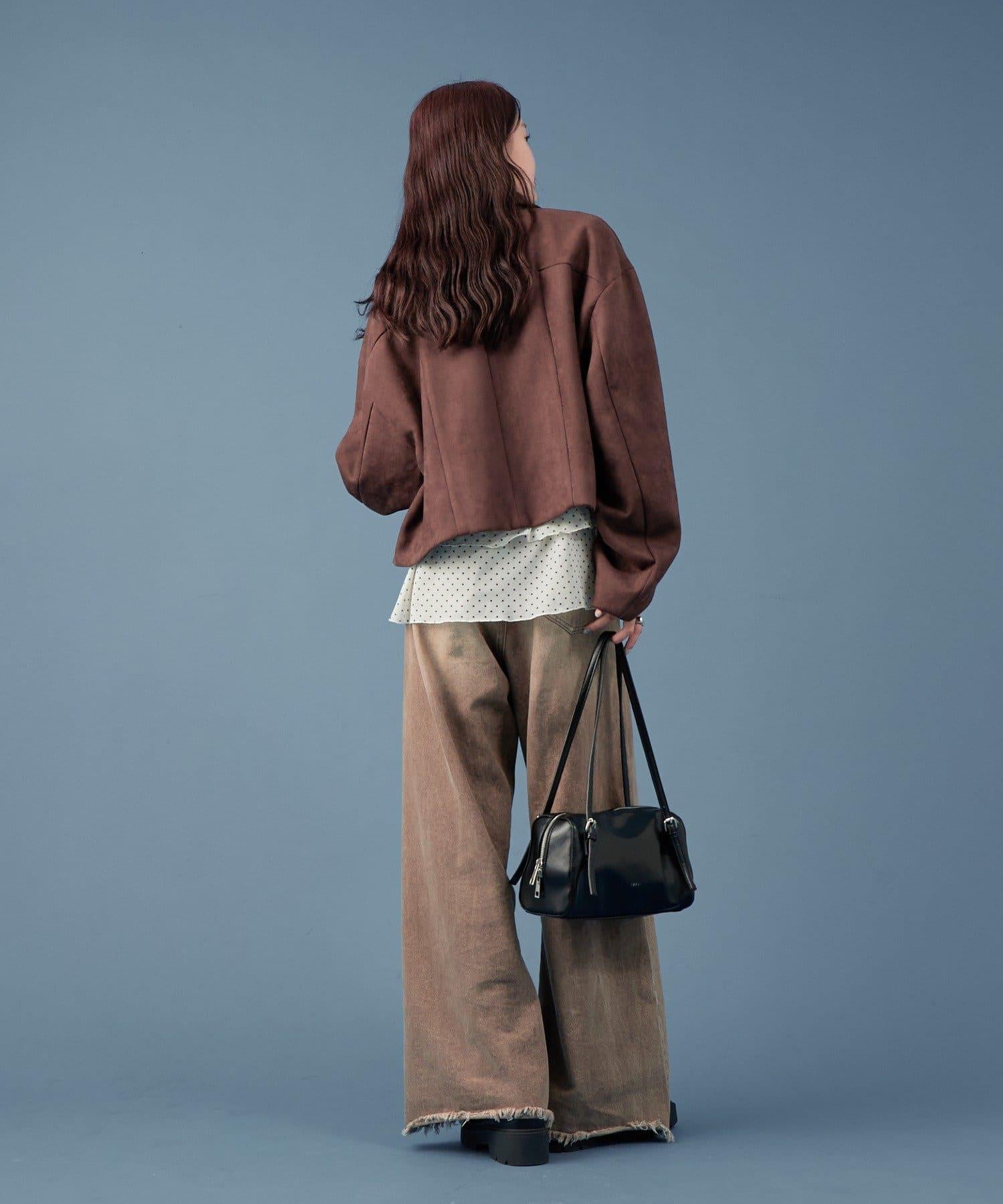 採用仿麂皮絨面料,是一款大氣的短外套。袖子寬大,可寬鬆穿著。