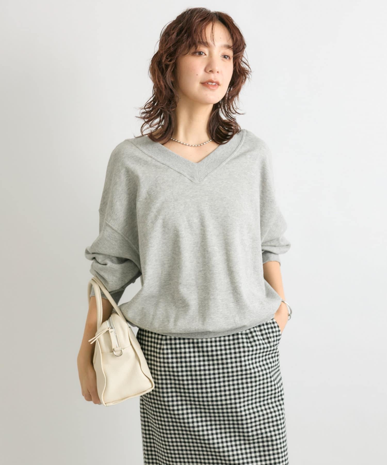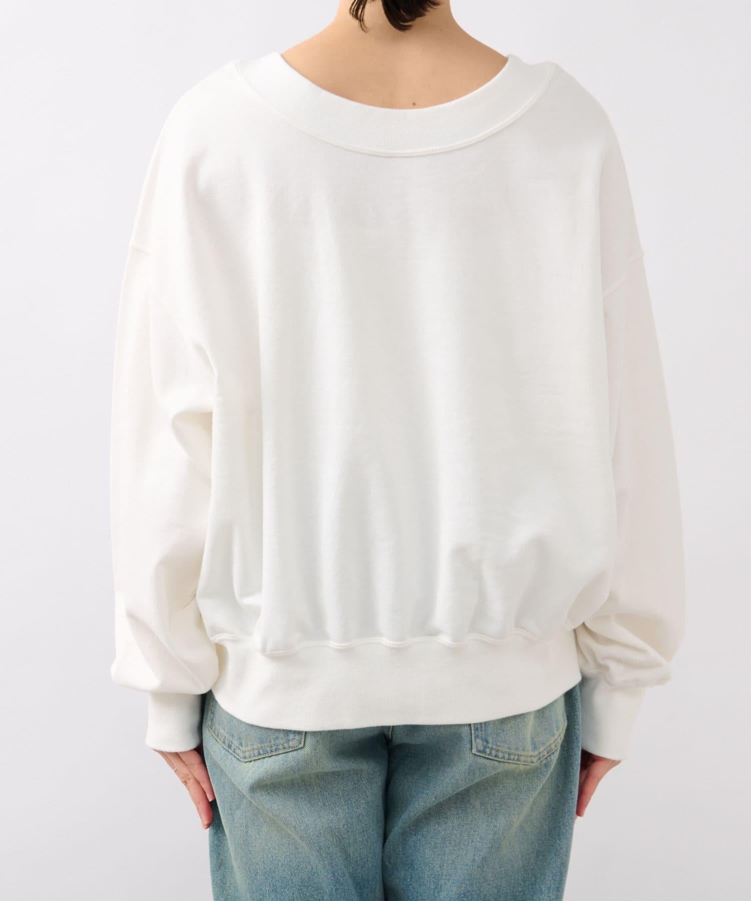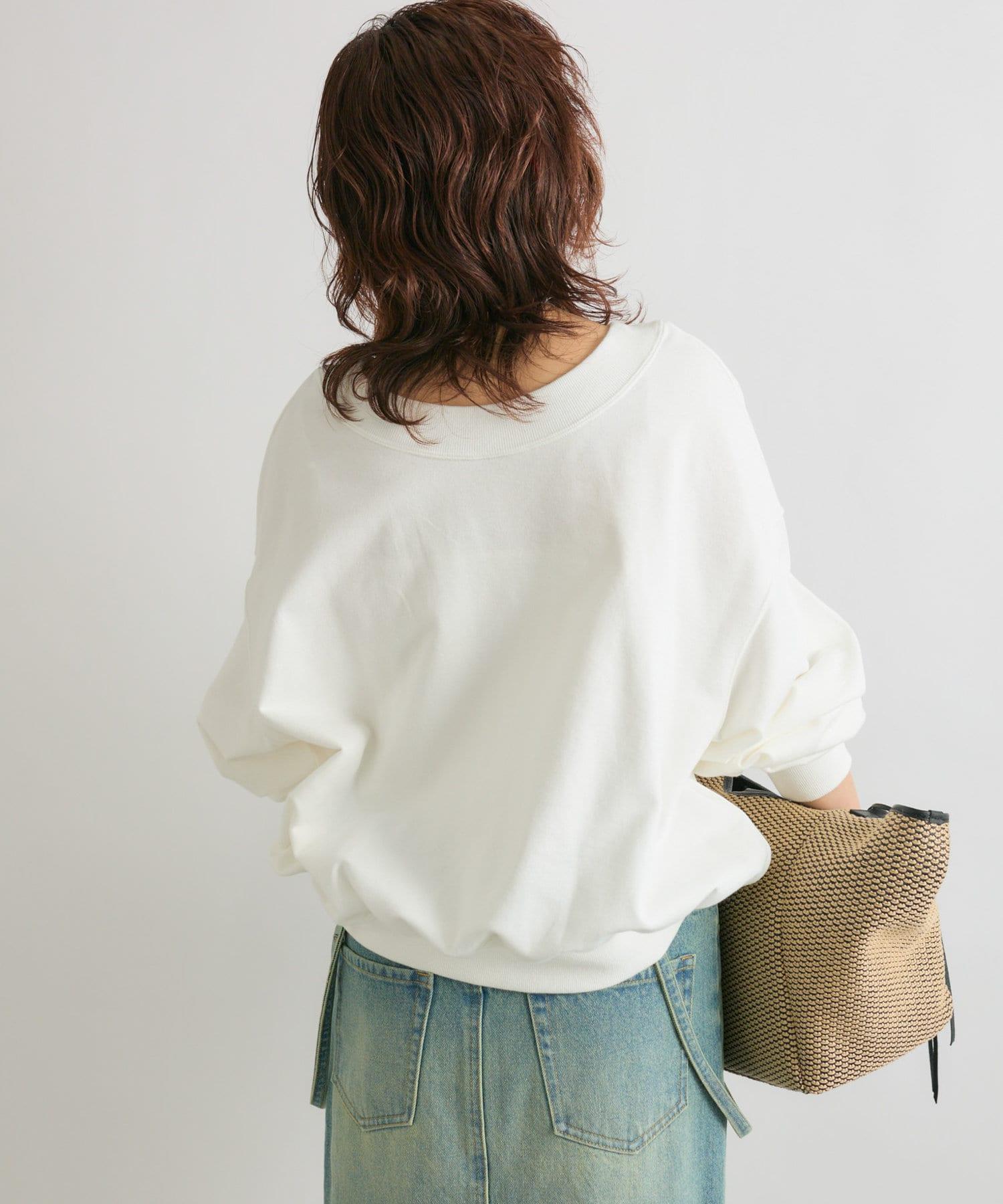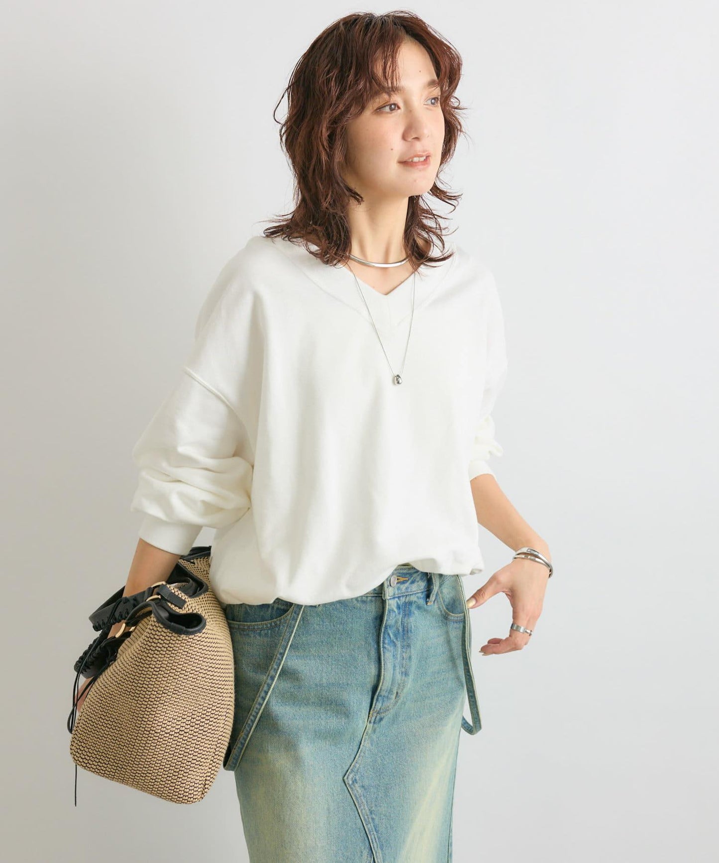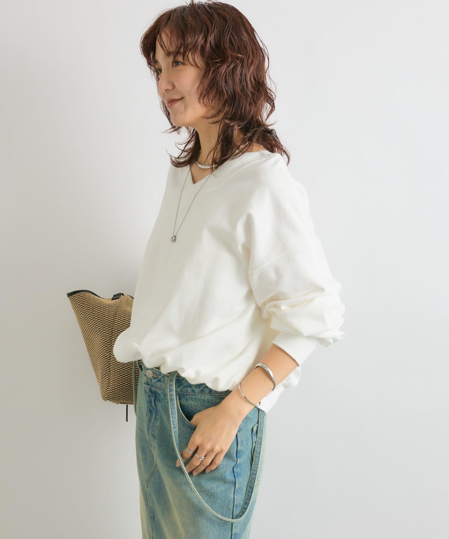 領口寬鬆開闊,建議將一側肩膀下垂,呈現寬鬆感。