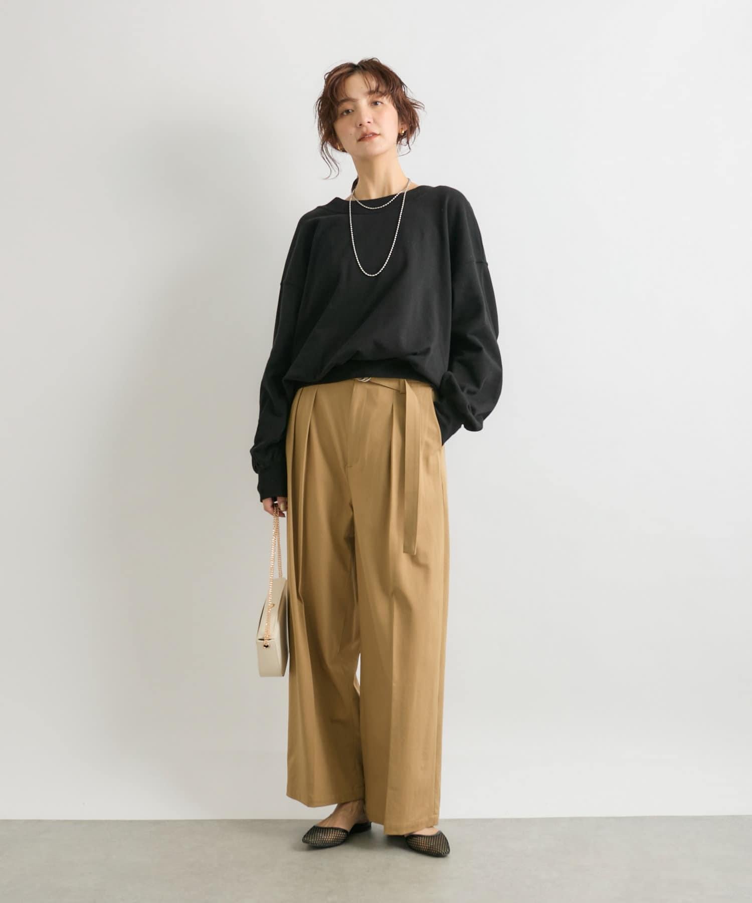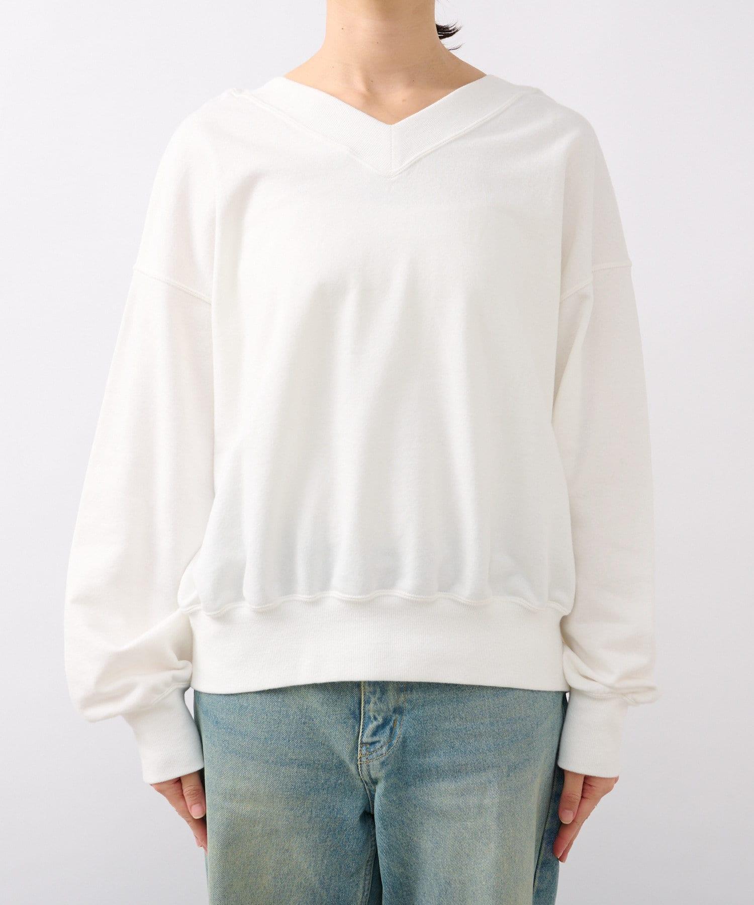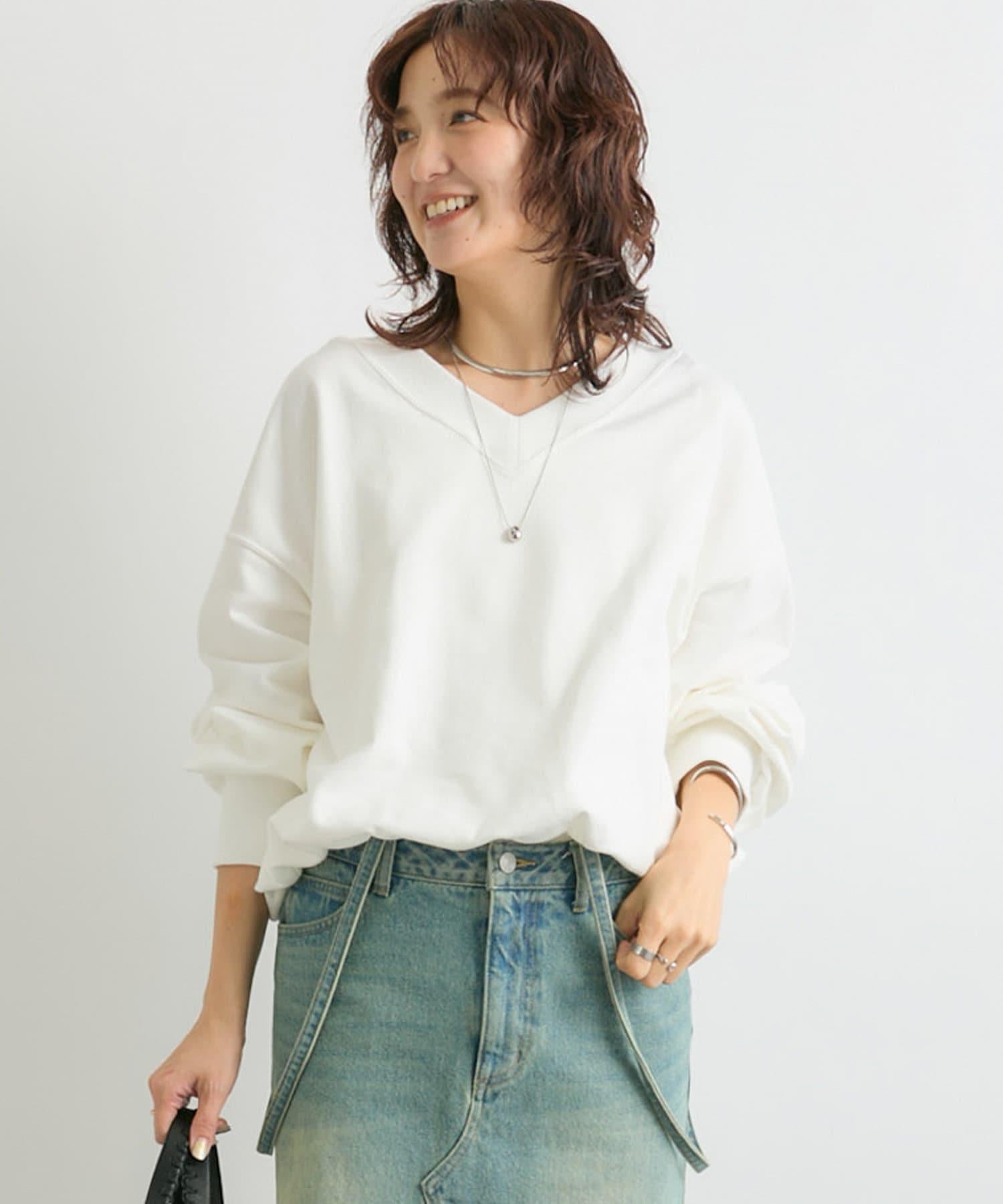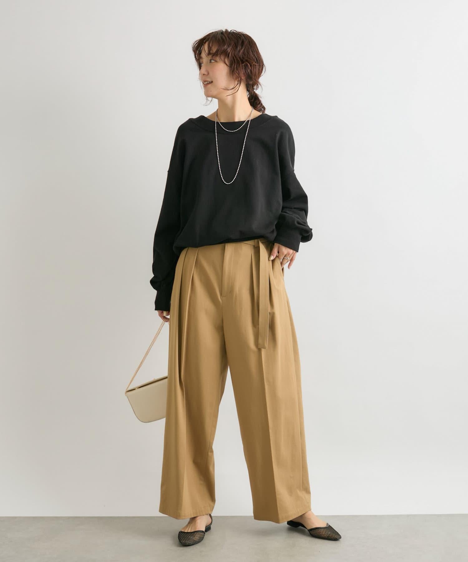 領口寬鬆開闊,建議將一側肩膀下垂,呈現寬鬆感。
