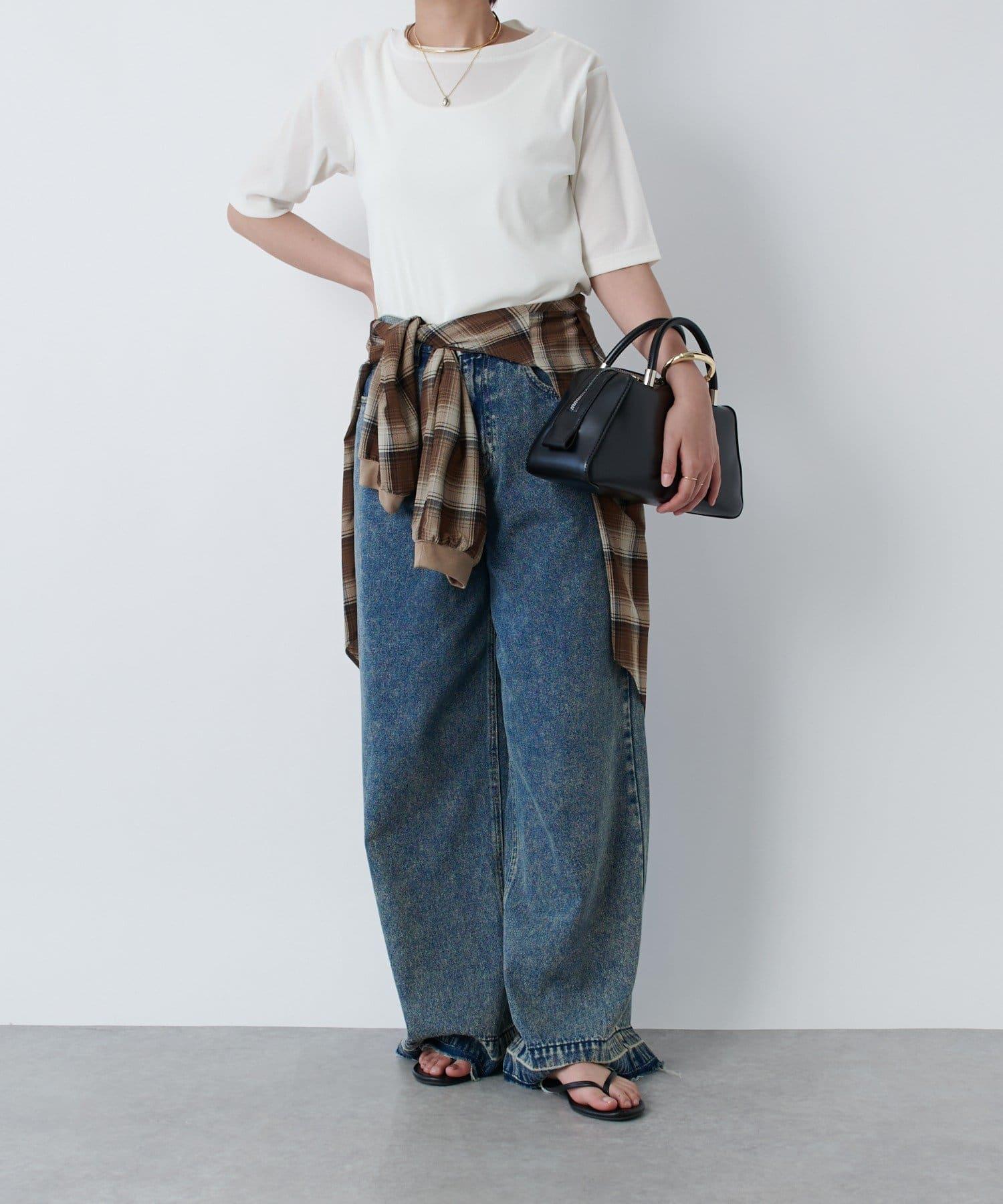 這款半袖剪裁縫製服裝採用簡單而微妙的透明面料,營造出精緻的氛圍。