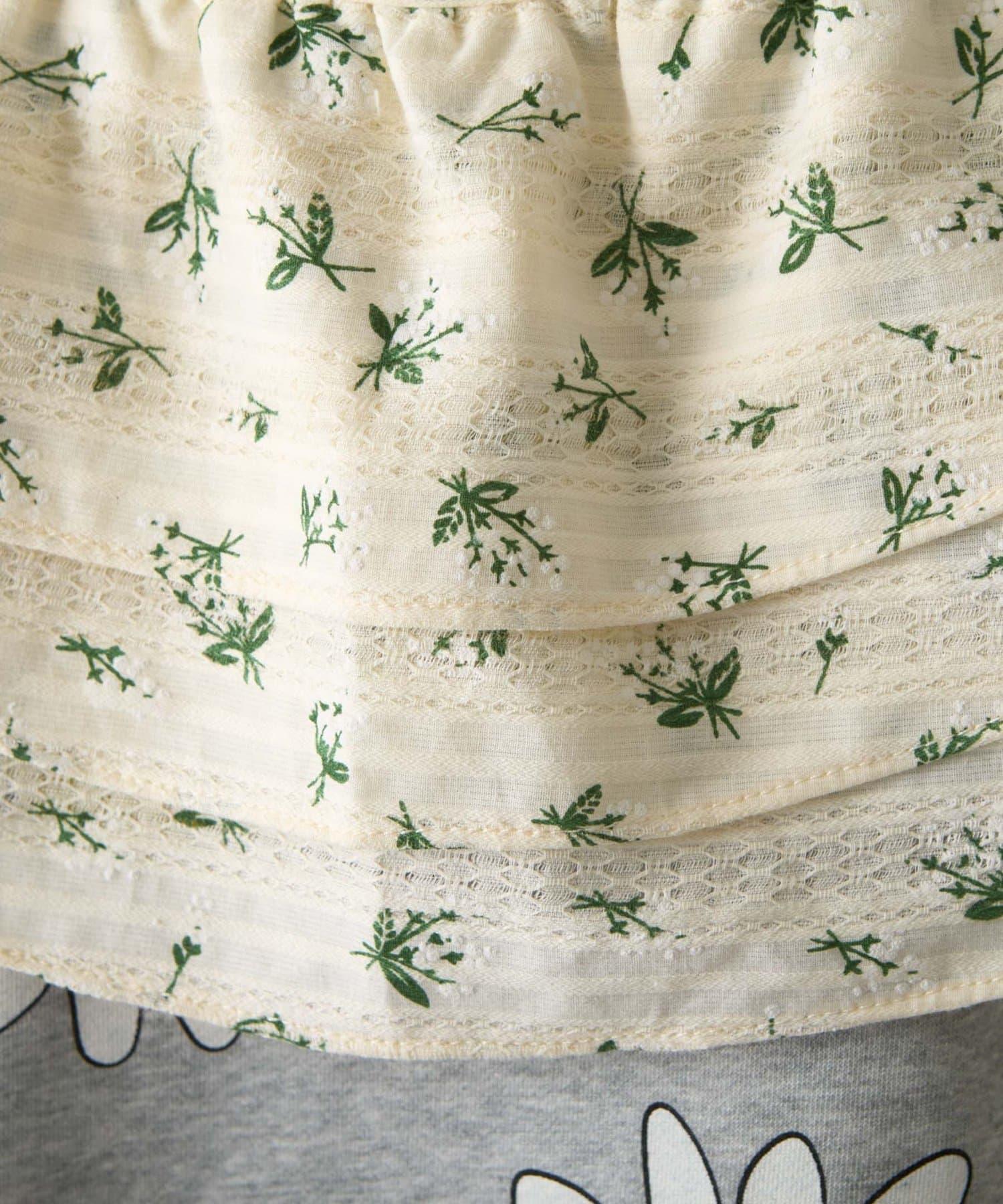花朵圖案的蕾絲面料和柔和的配色是這款連衣裙褶邊的重點!