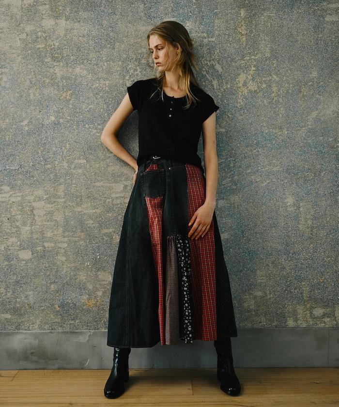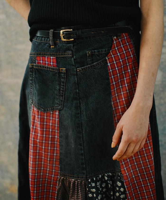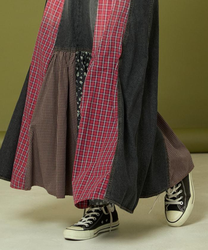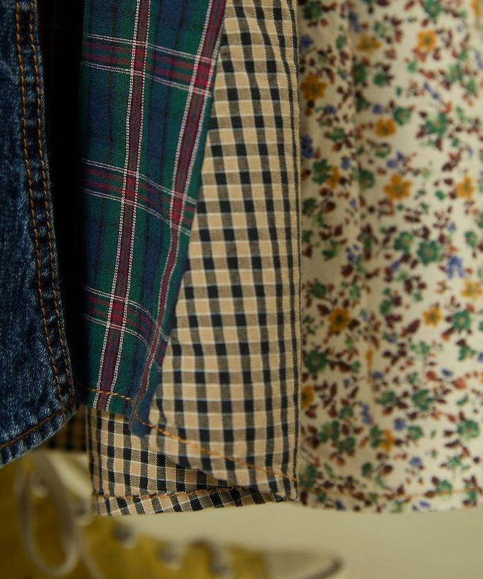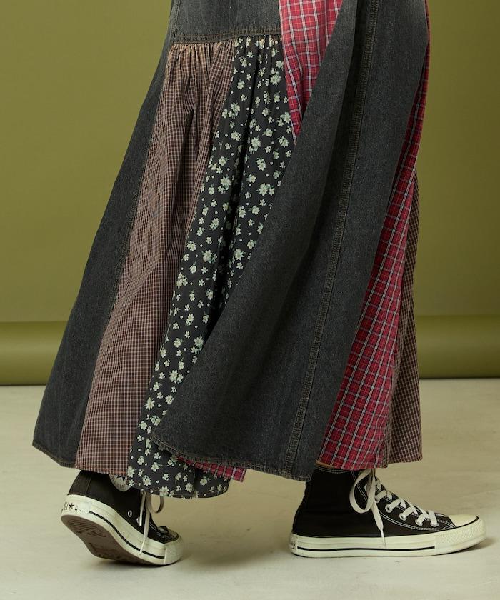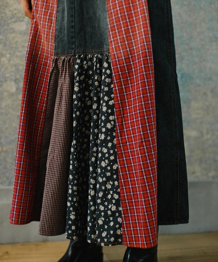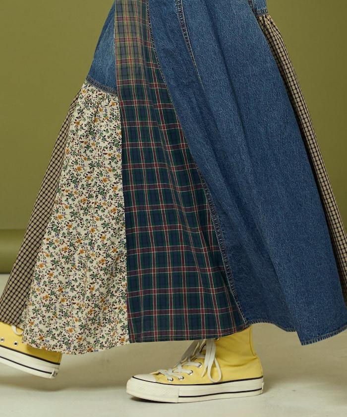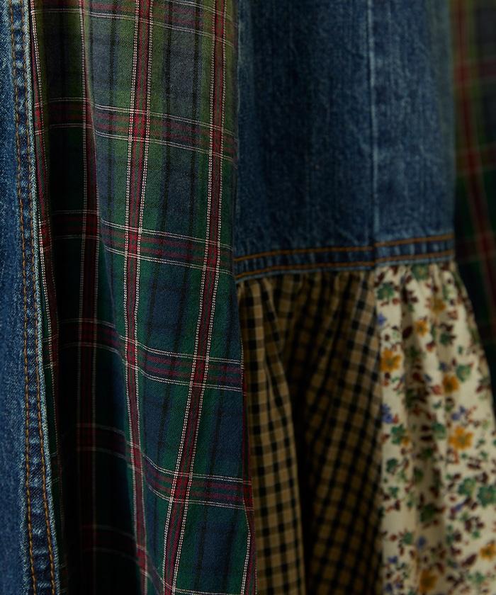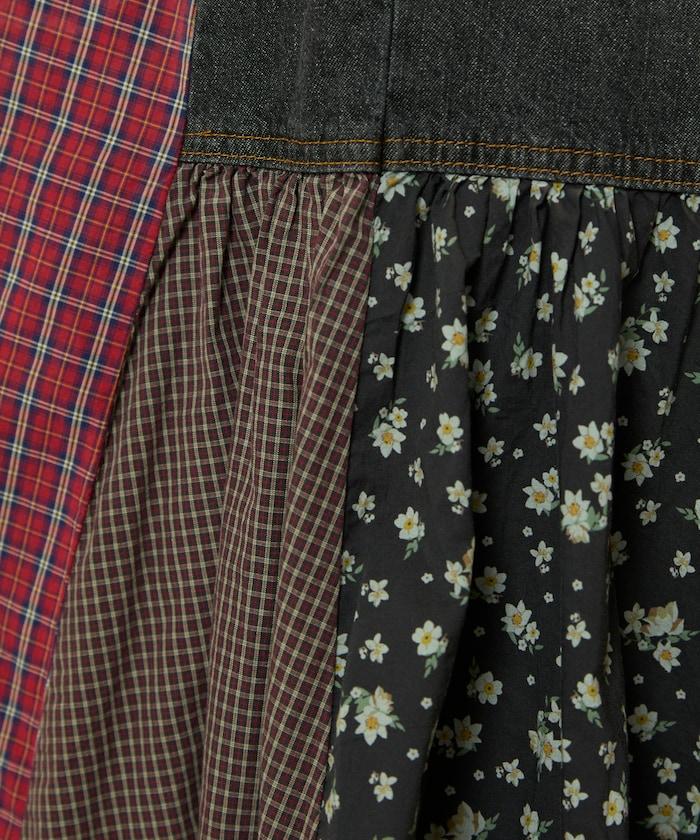 這款拼接裙融合了牛仔布料和圖案面料。本季採用了更為複雜的拼接,將牛仔布、格紋和花卉圖案混合在一起,營造出一種喚起季節情緒的外觀。