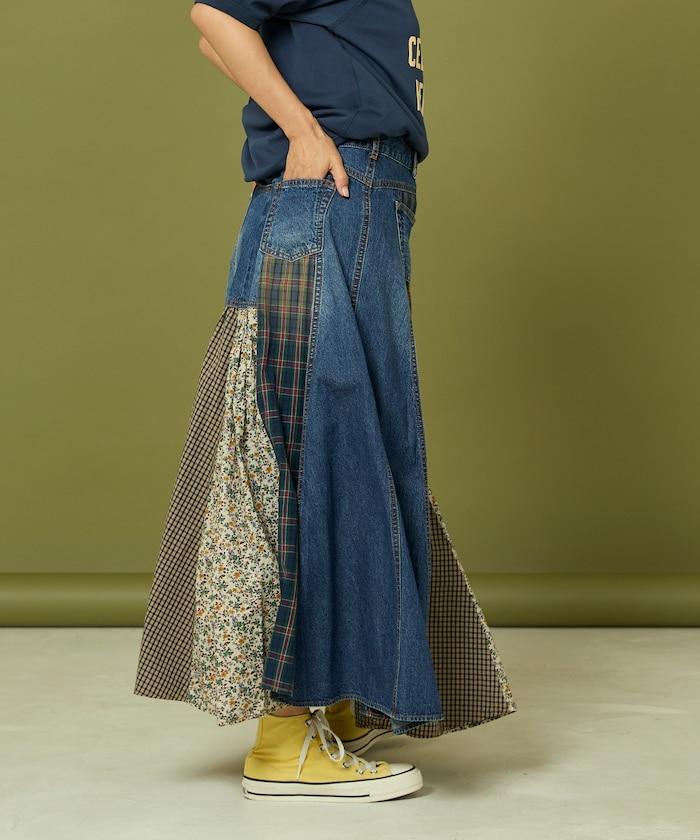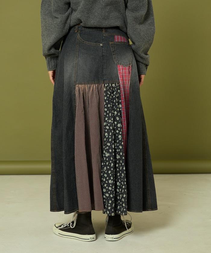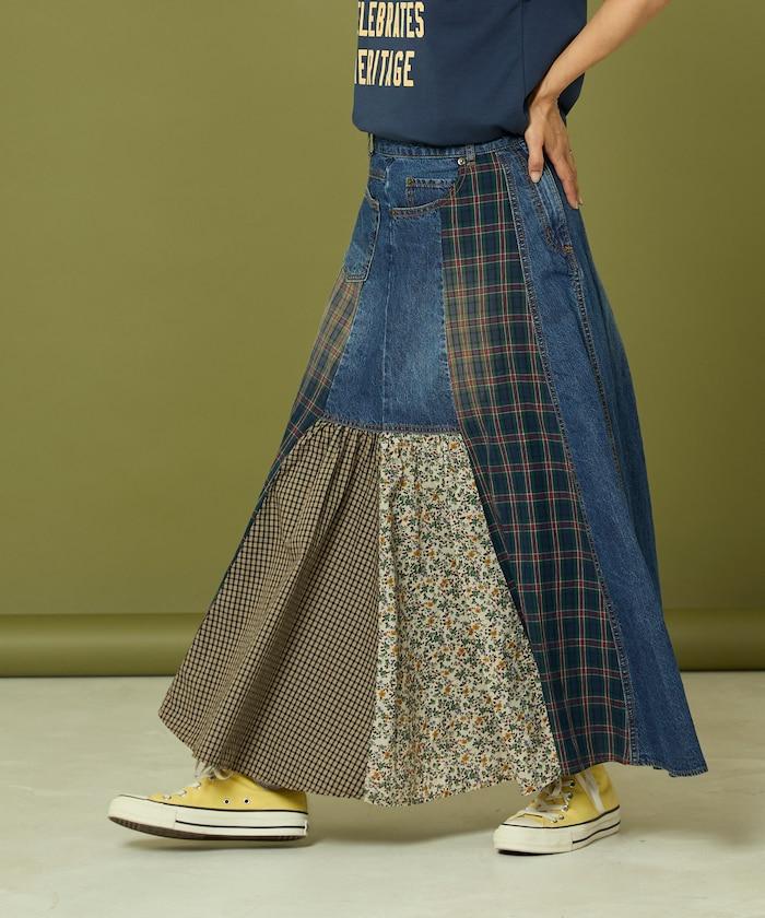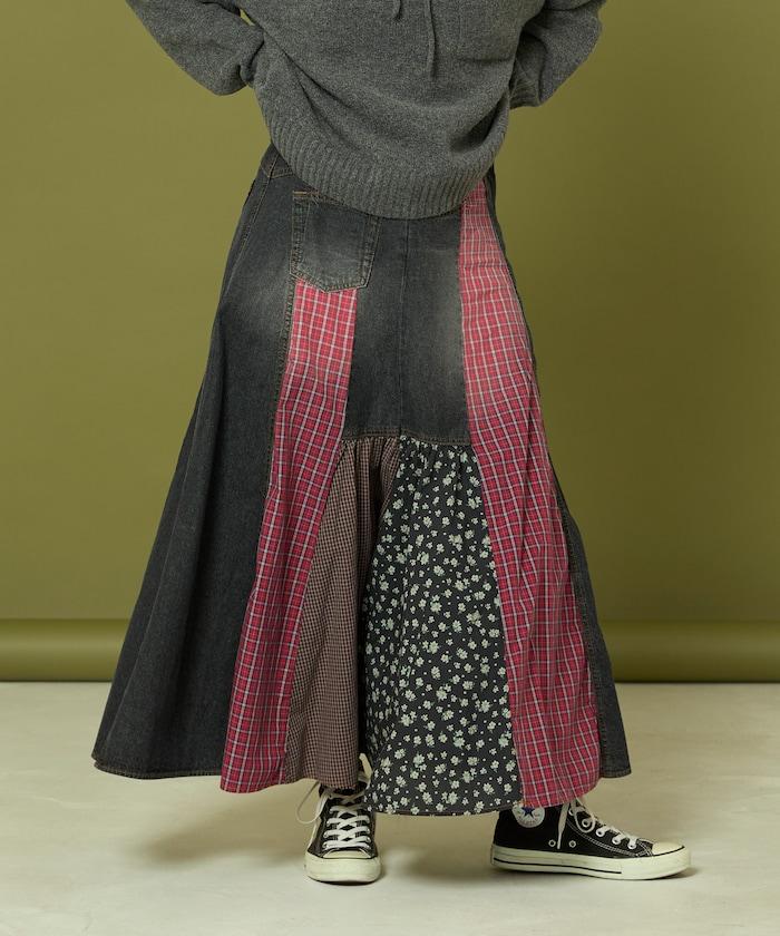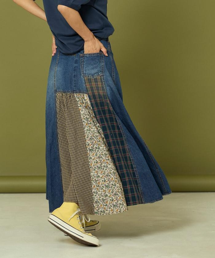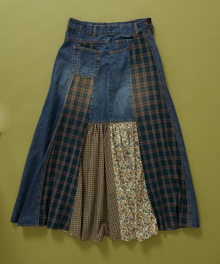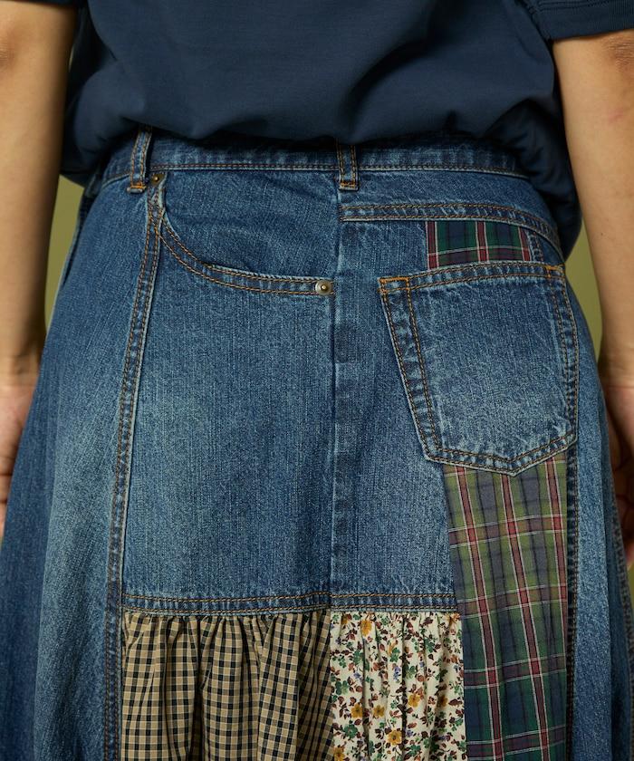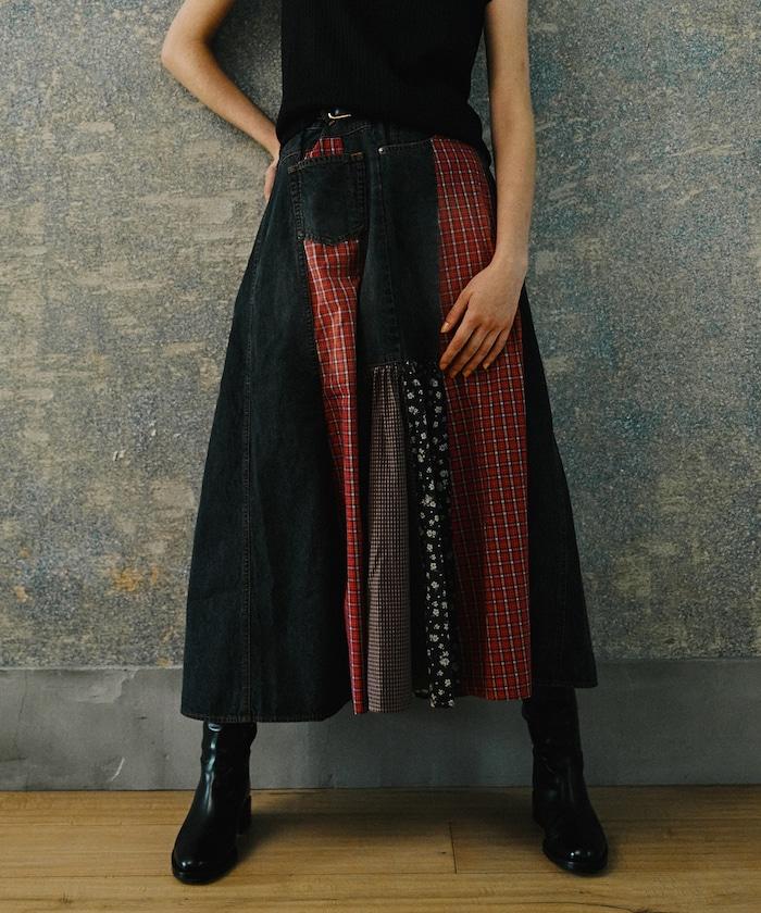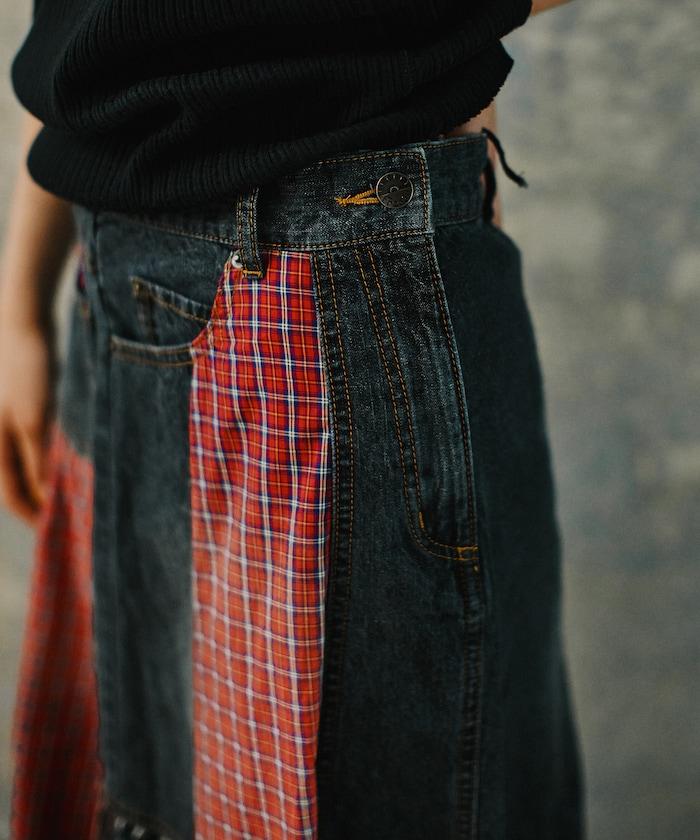 這款拼接裙融合了牛仔布料和圖案面料。本季採用了更為複雜的拼接,將牛仔布、格紋和花卉圖案混合在一起,營造出一種喚起季節情緒的外觀。