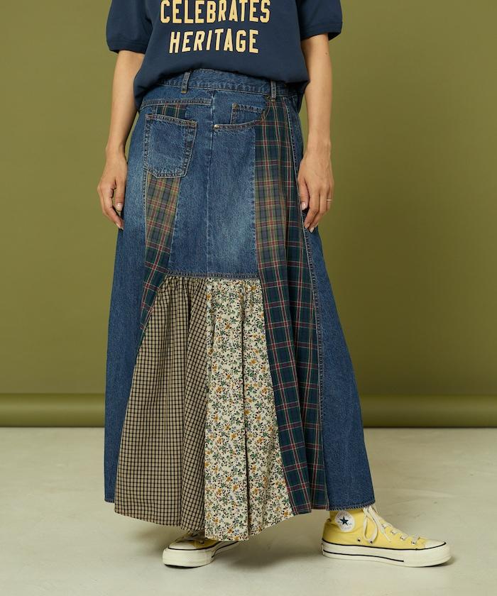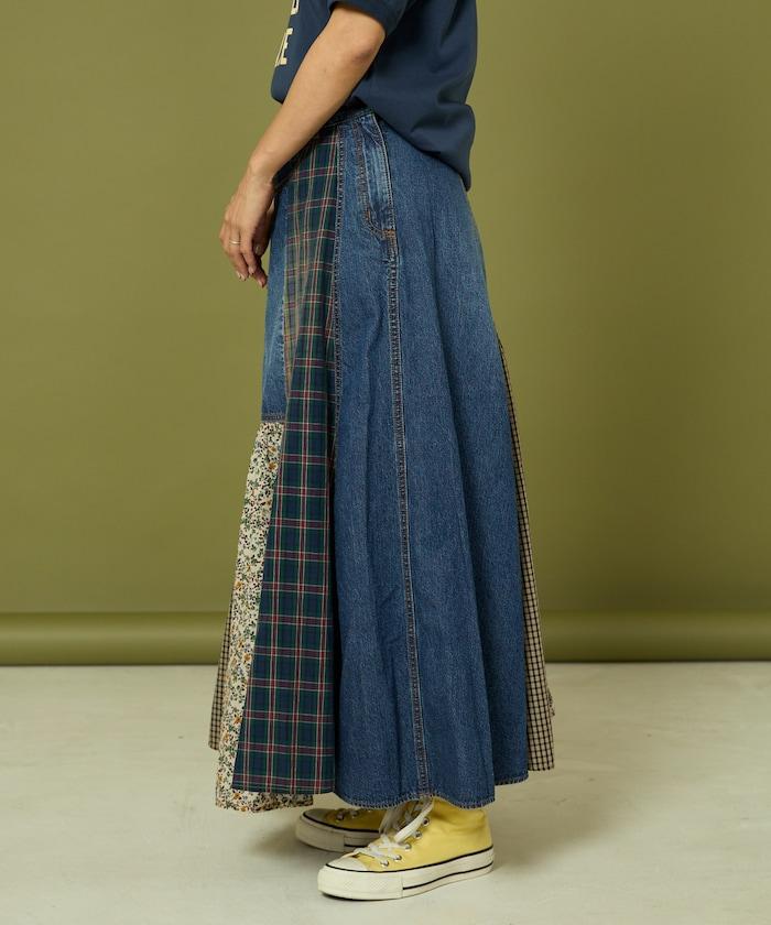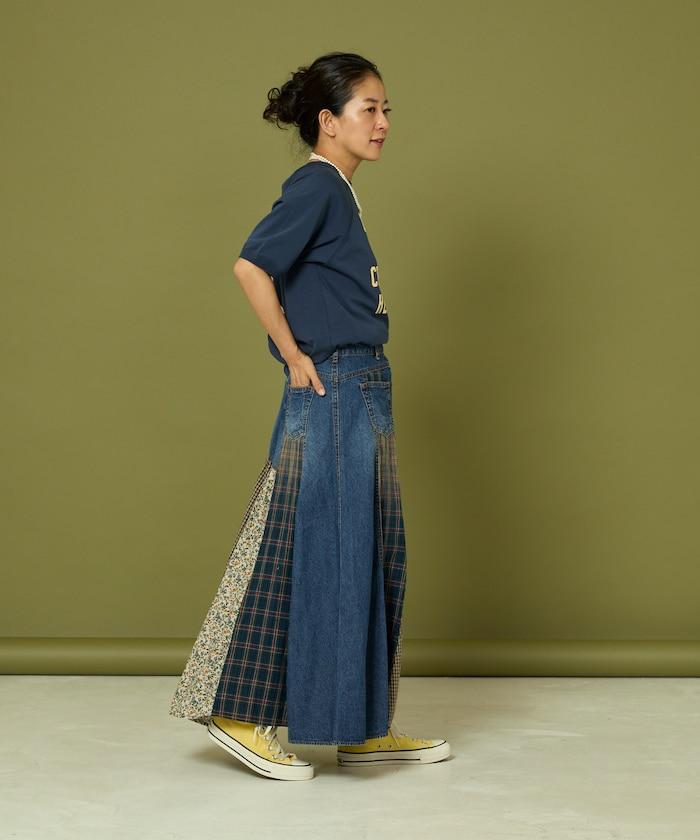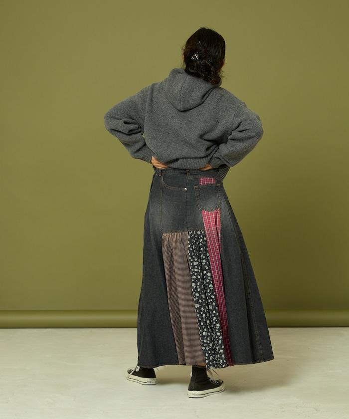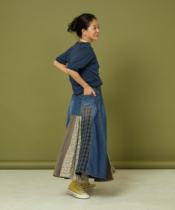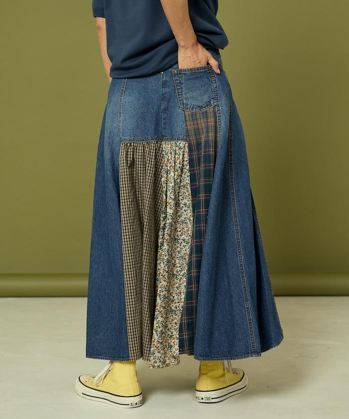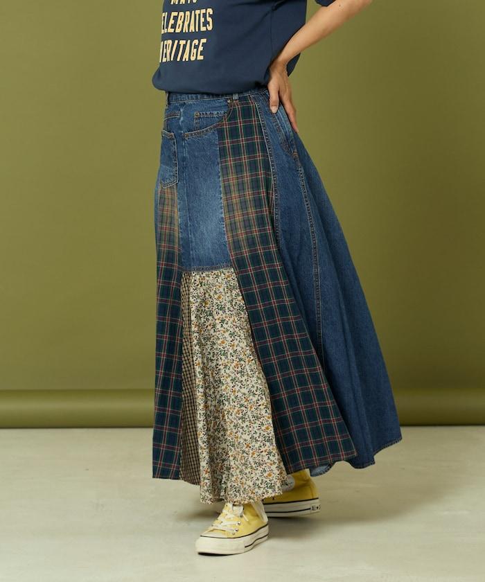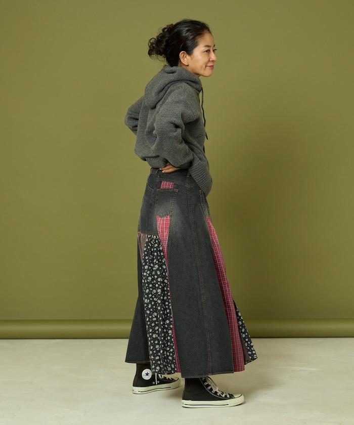 這款拼接裙融合了牛仔布料和圖案面料。本季採用了更為複雜的拼接,將牛仔布、格紋和花卉圖案混合在一起,營造出一種喚起季節情緒的外觀。