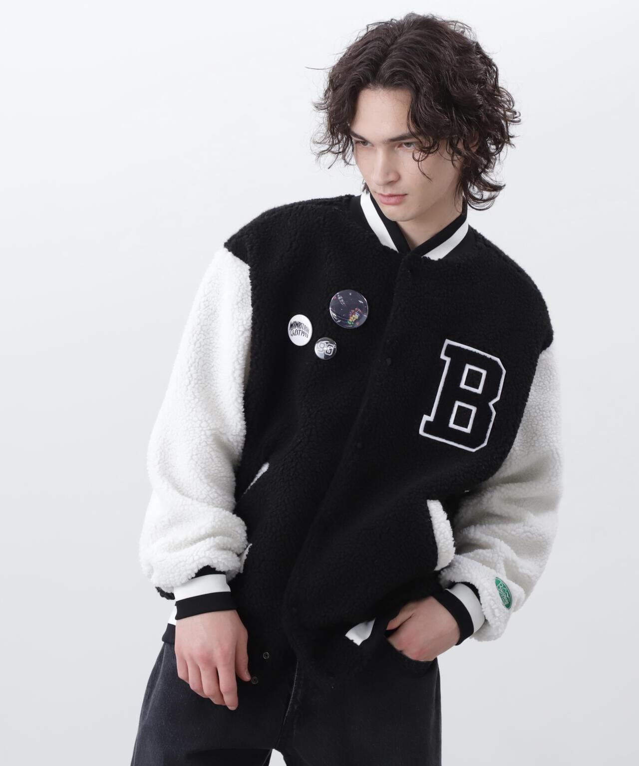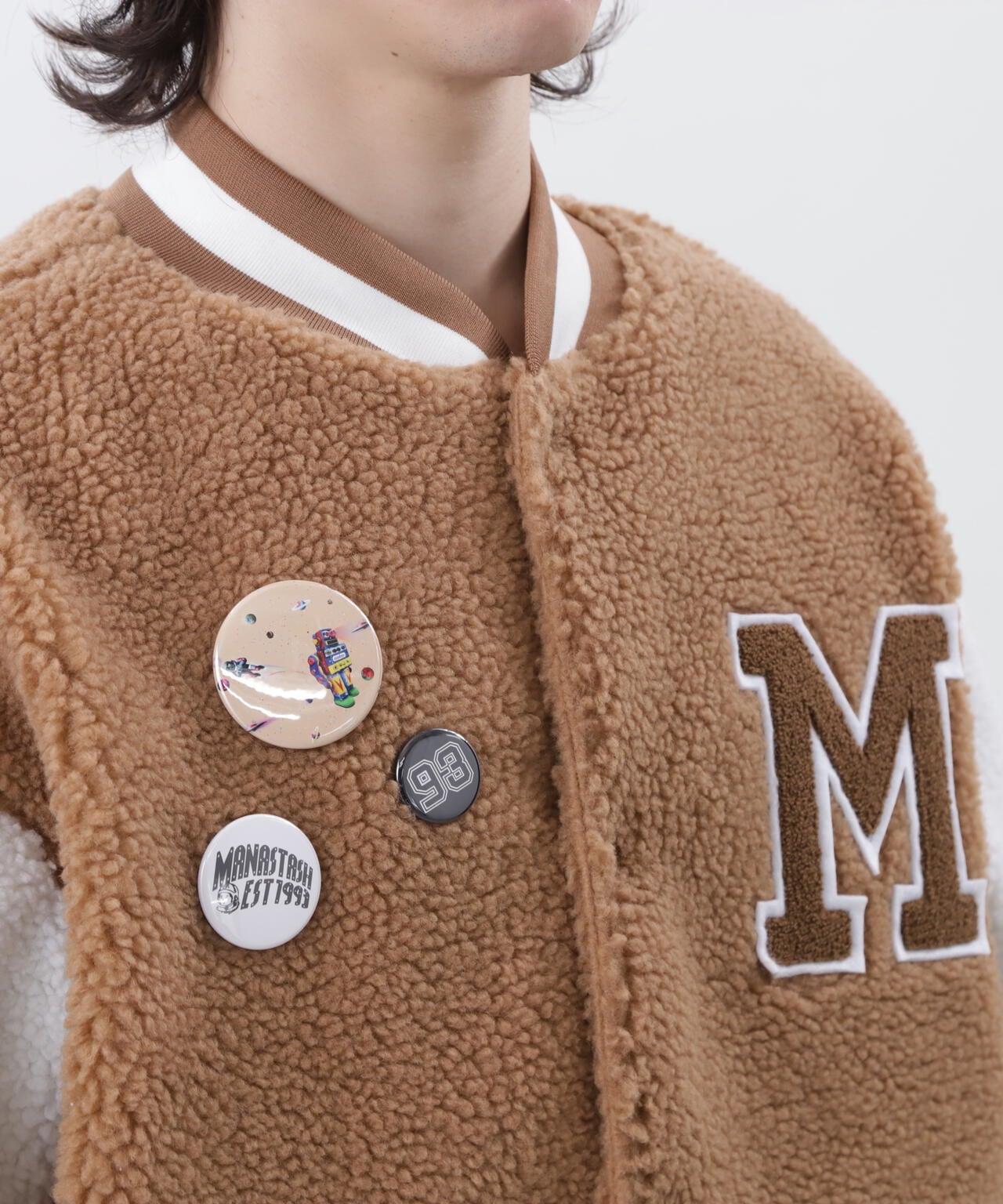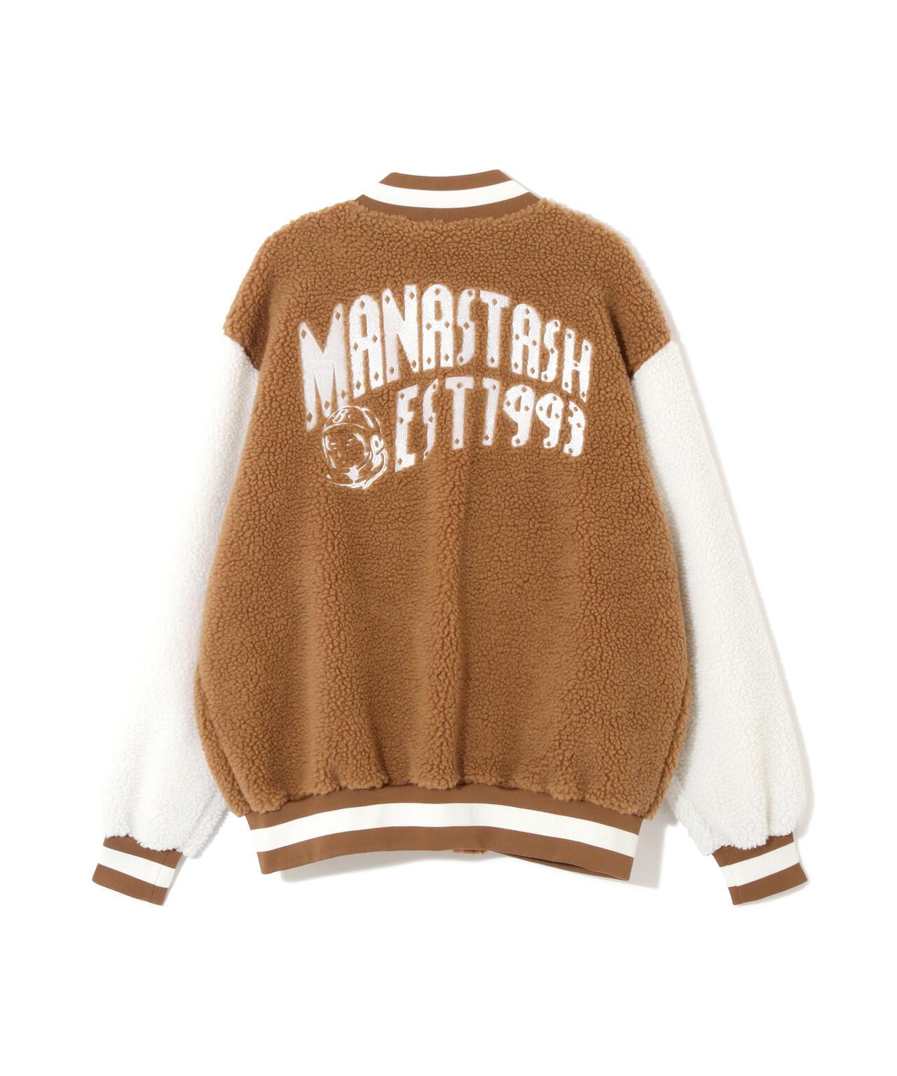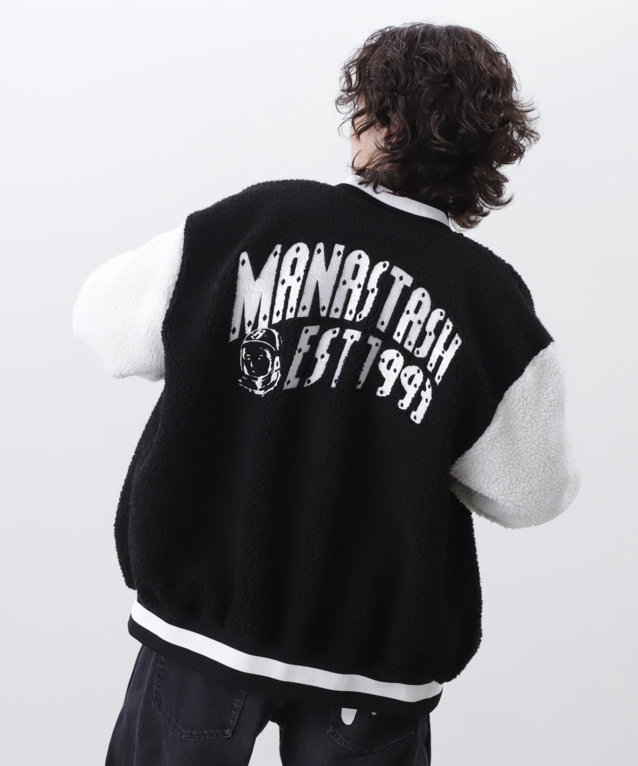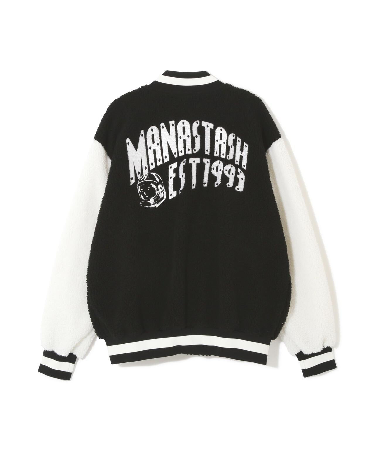 ×The VARSITY JACKET WITH BADG 是 BBC 標準校服夾克的特別款,採用蟒蛇皮材質。正面的徽章為特殊規格,黑色徽章上有一個 B,米色徽章上有一個 M。背面是一個從 BBC 的 OG 徽標到 MANASTASH 排列的大徽標,左袖上是一個從 MANASTASH 原始徽標到 BBC 徽標排列的刺繡徽標。此外,還附有四個為此次合作設計的徽章,可以自由拆卸和佩戴、