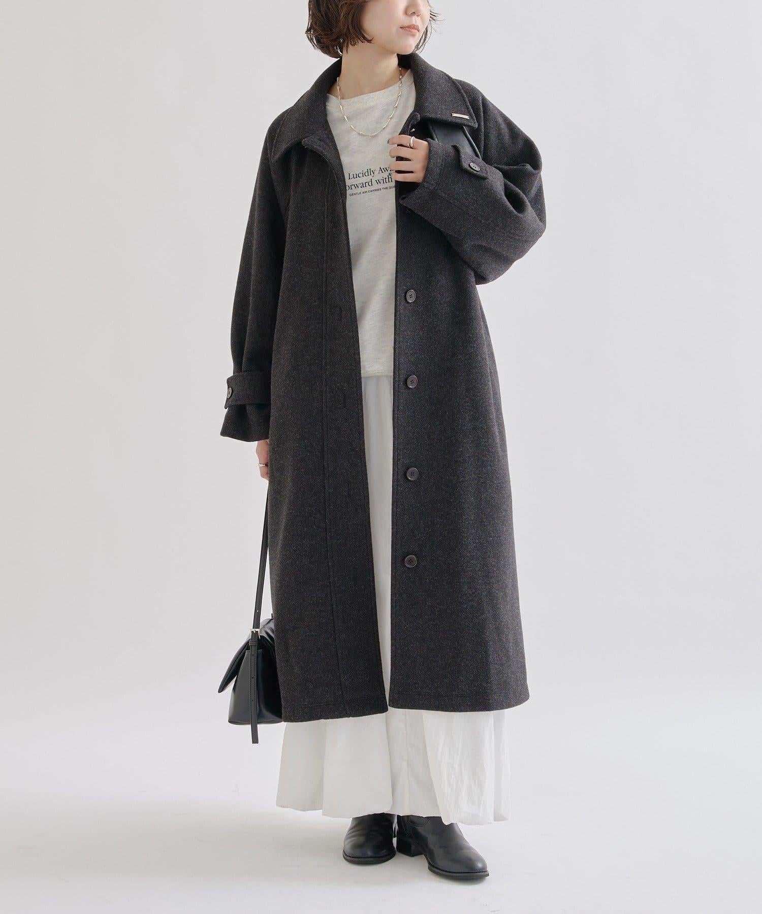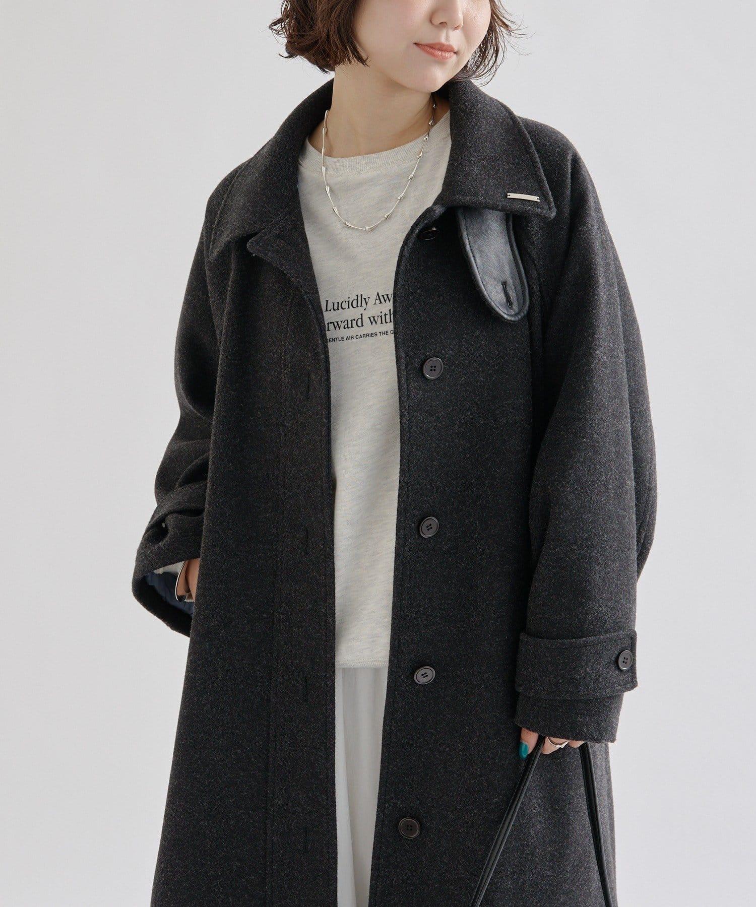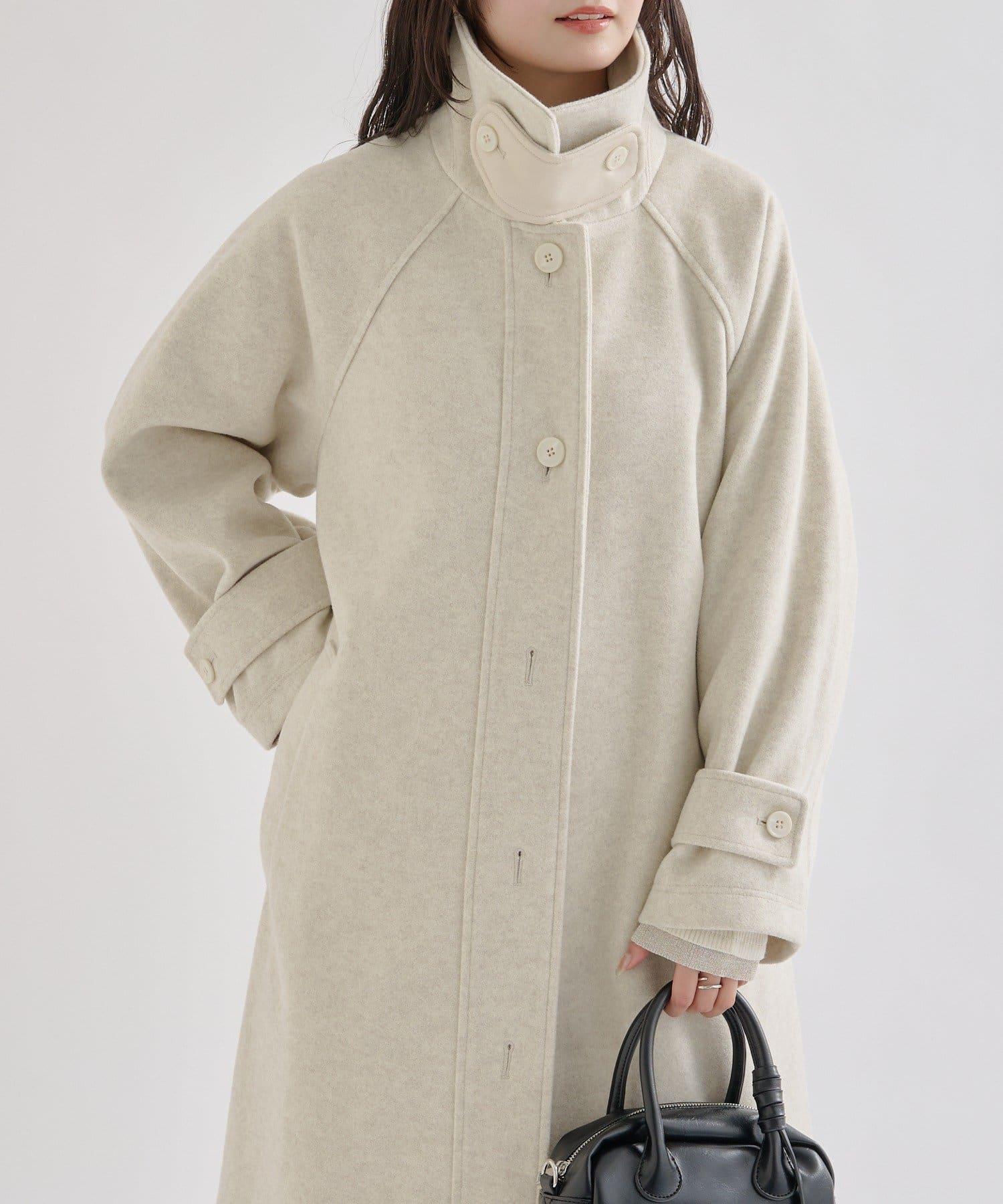 這款長款大衣的領子可作為立領使用,面料使其外觀高貴。領子上的小飾片是優雅的點睛之筆。