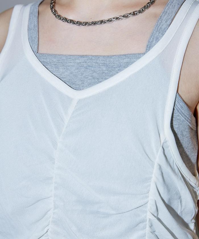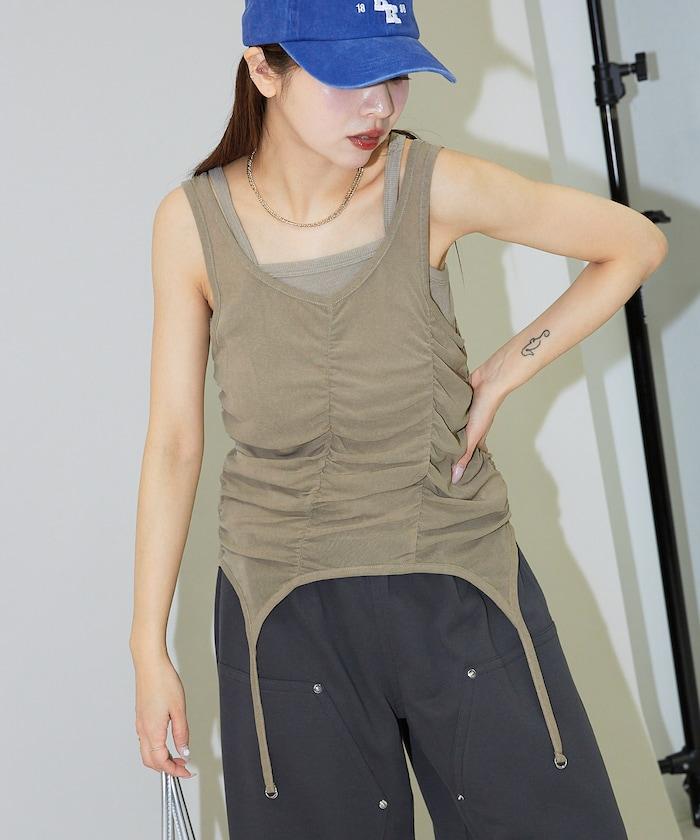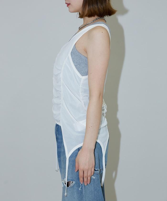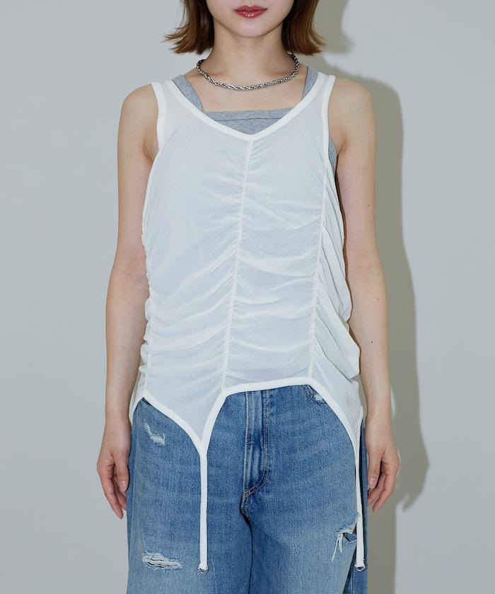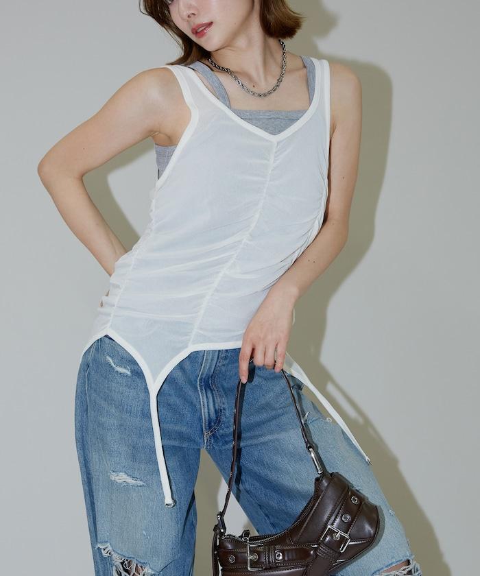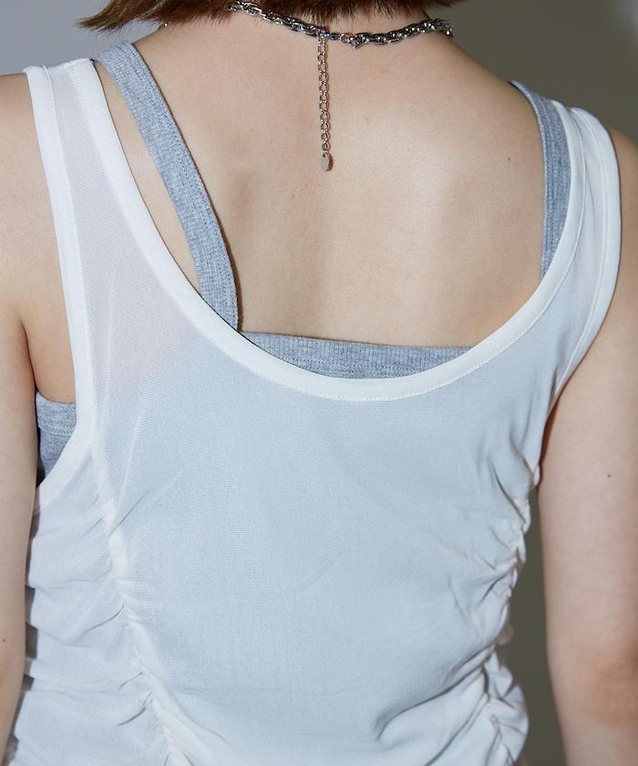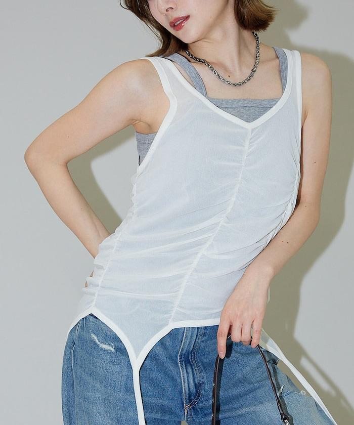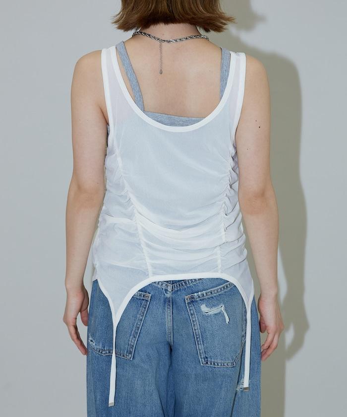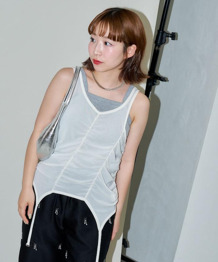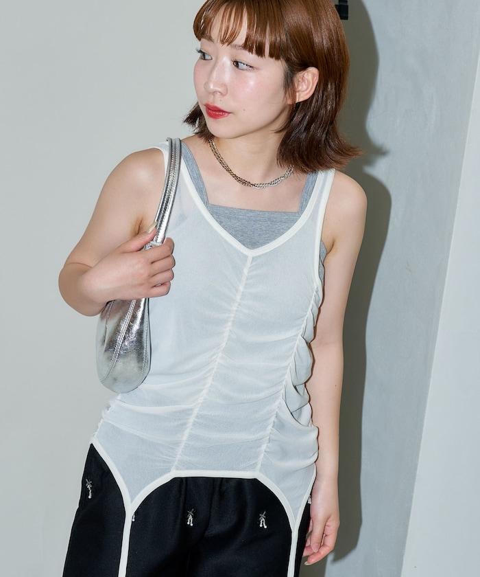 羅紋面料的吊帶背心和透明強力網眼面料的透視背心組合在一起。