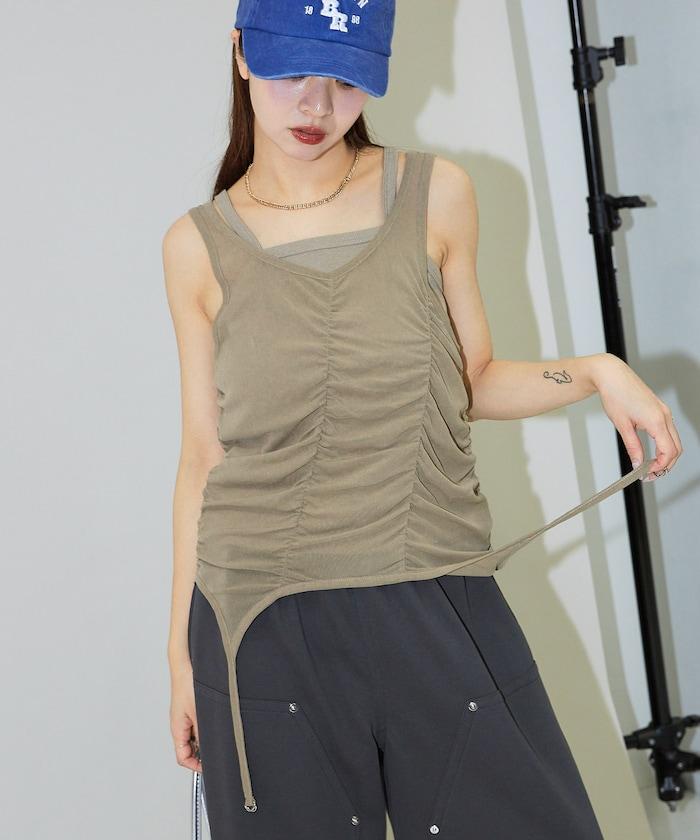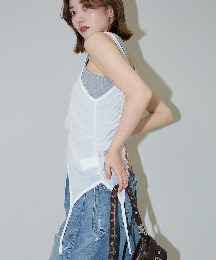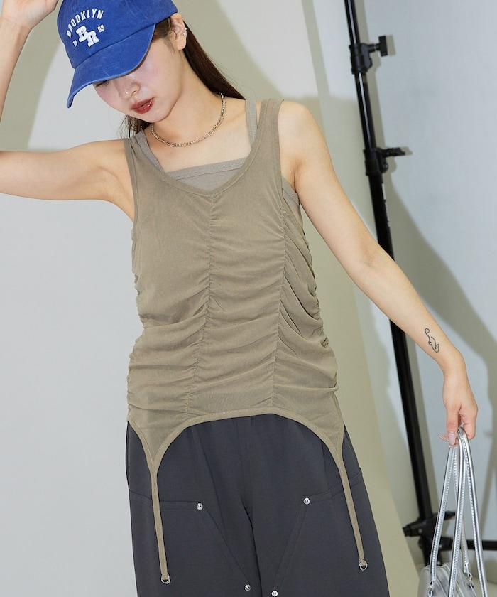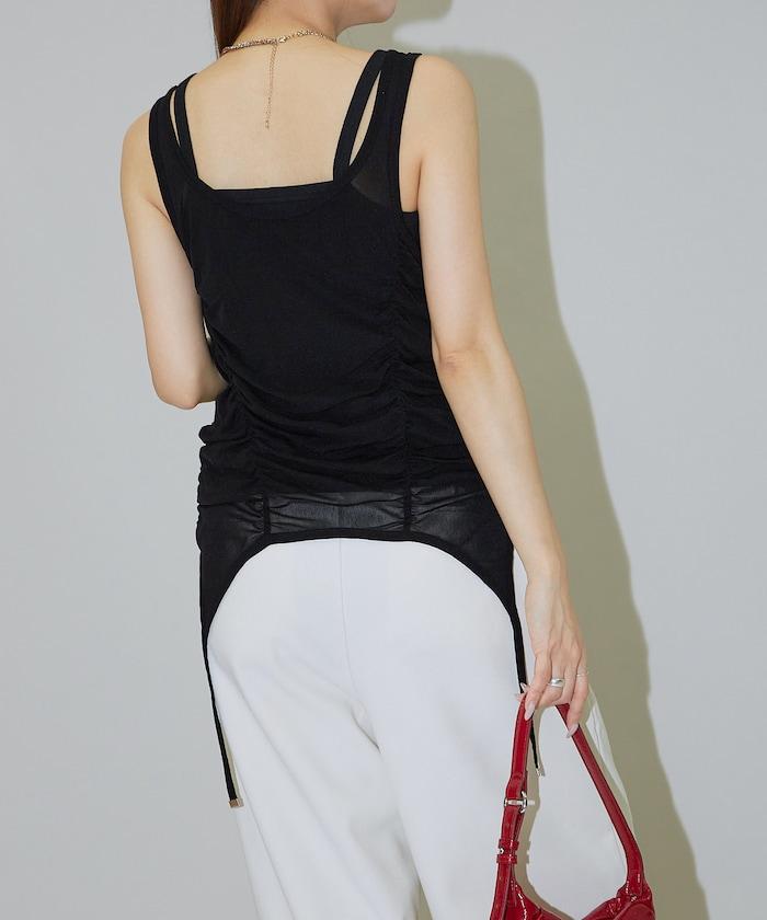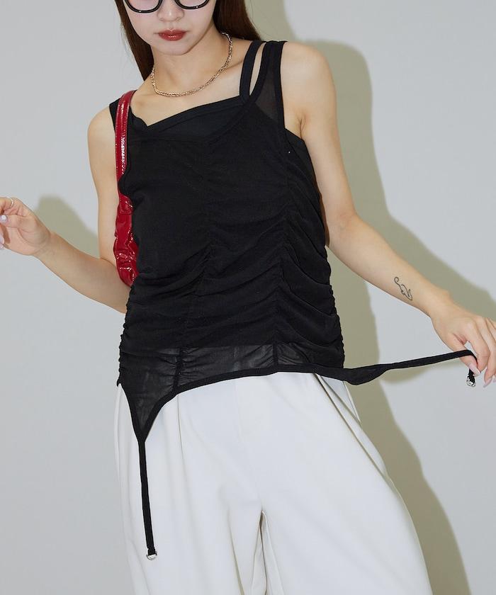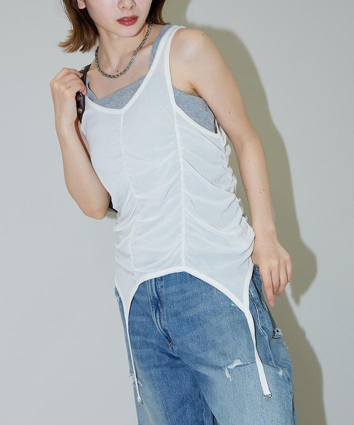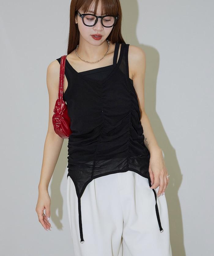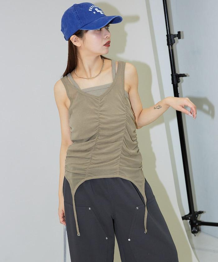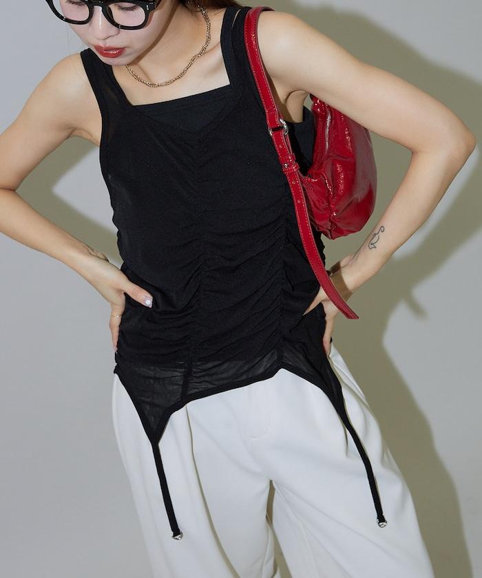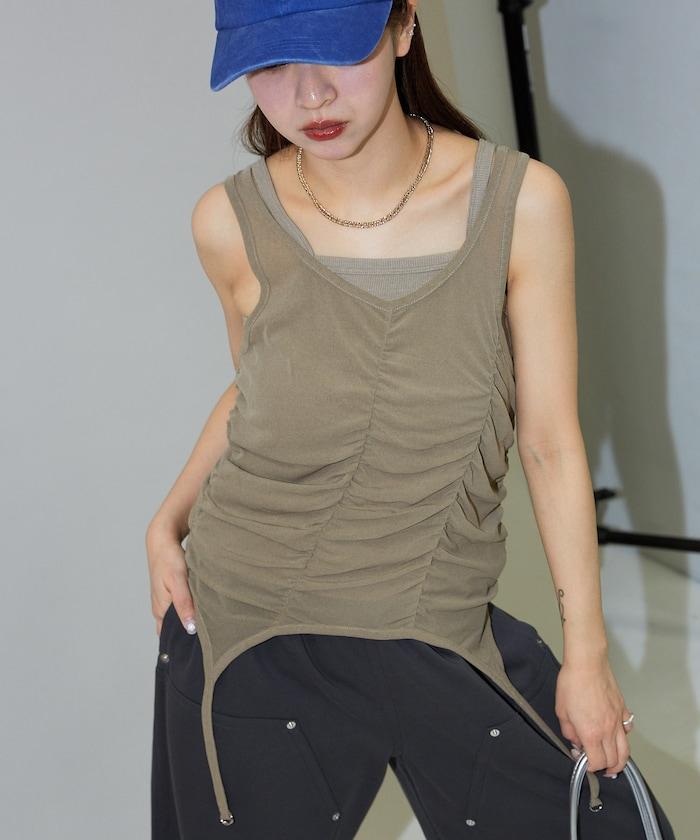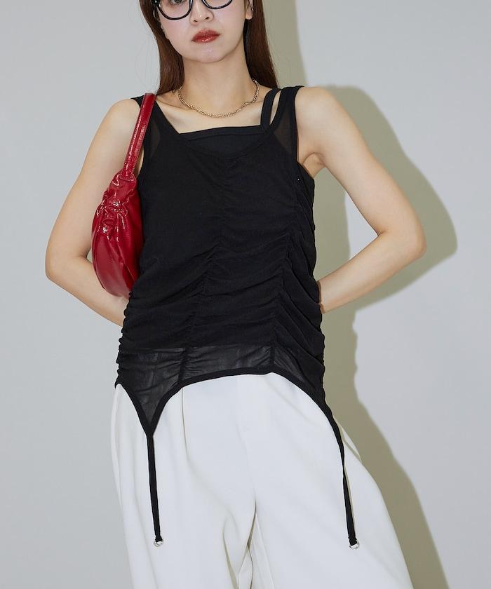 羅紋面料的吊帶背心和透明強力網眼面料的透視背心組合在一起。