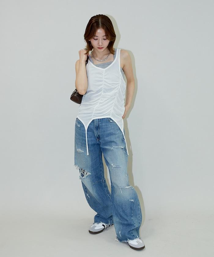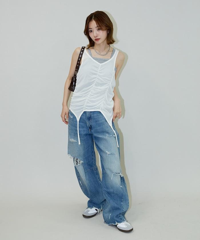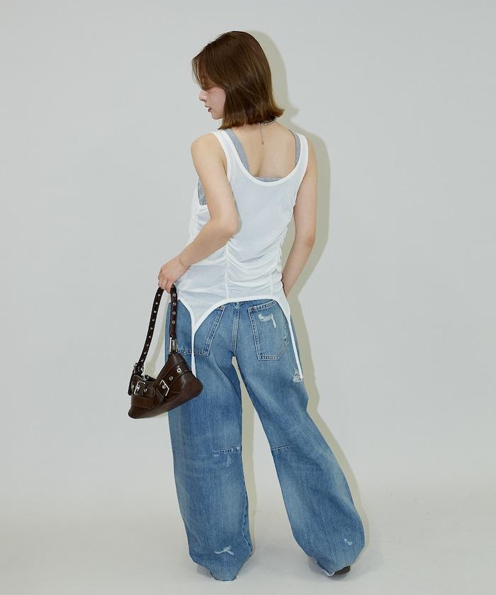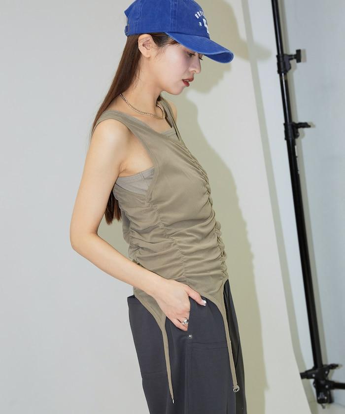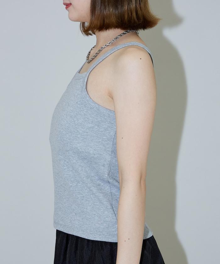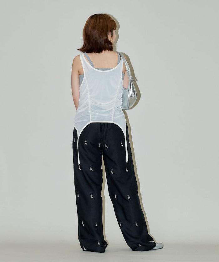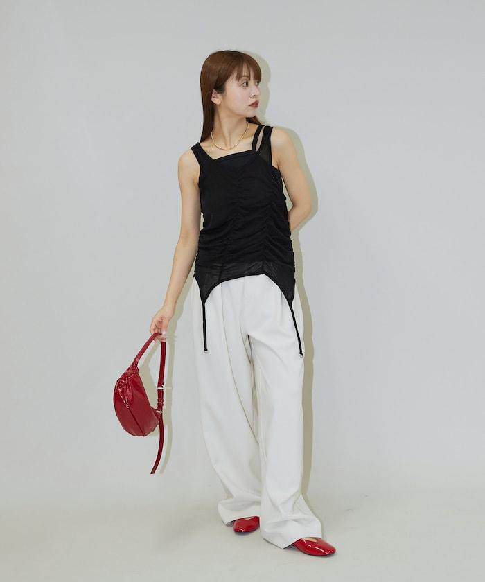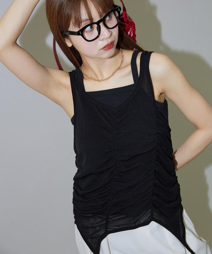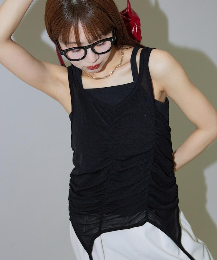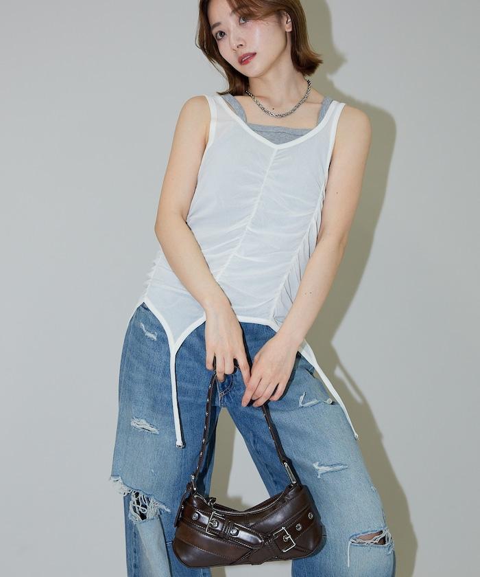 羅紋面料的吊帶背心和透明強力網眼面料的透視背心組合在一起。