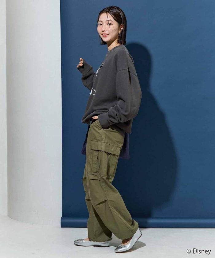 挑選米老鼠褲子的顏色,與包包和鞋子統一搭配,給人時尚的印象。