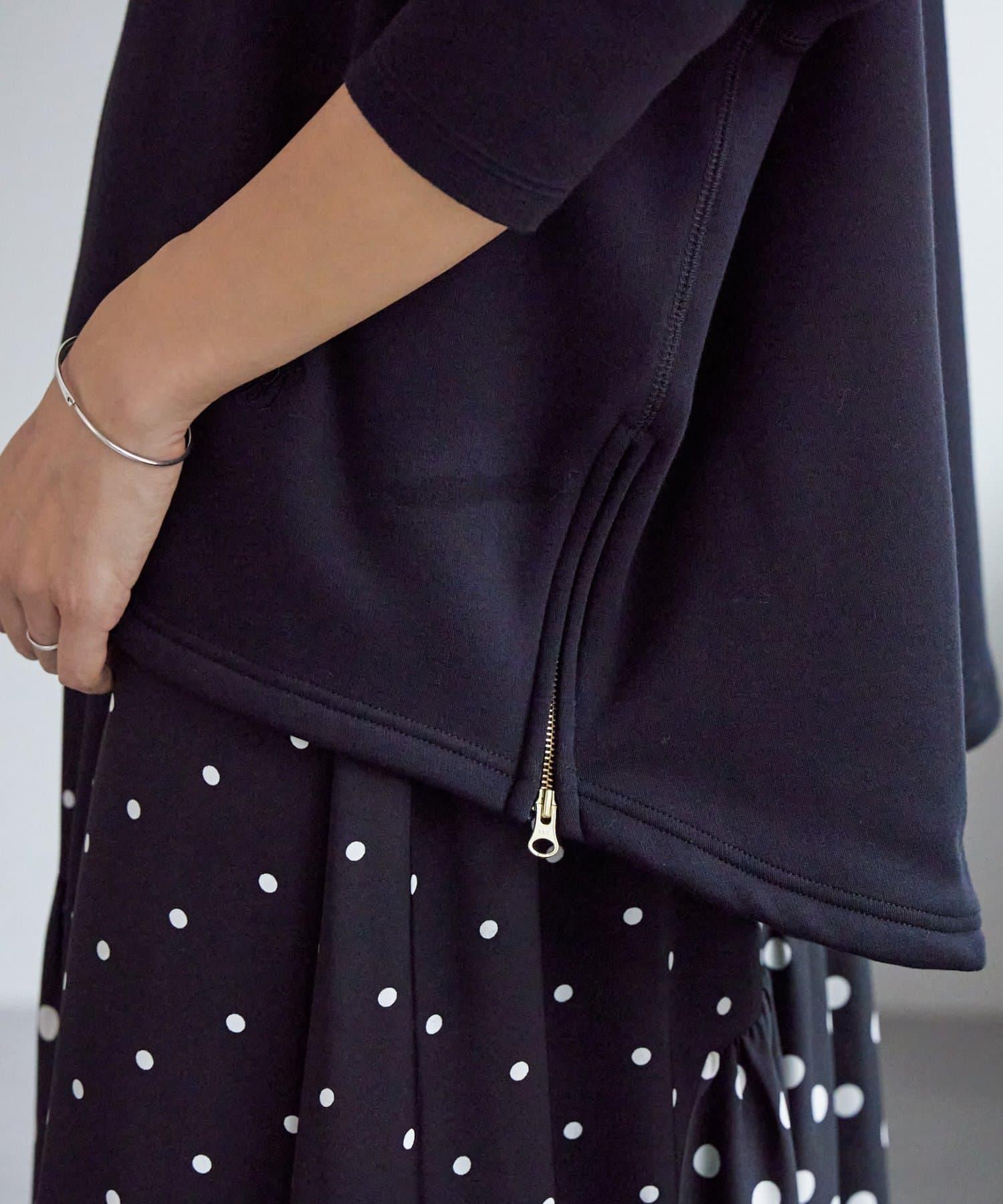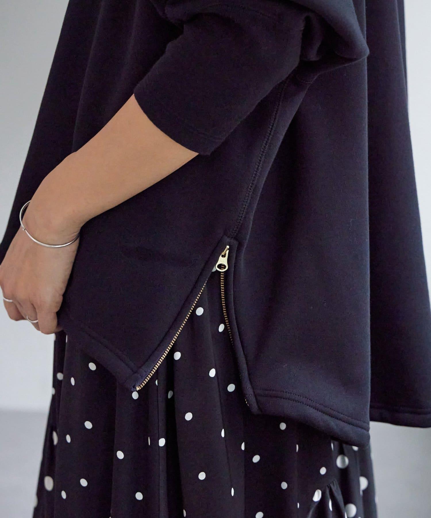 下襬為圓形剪裁,兩側有金色拉鍊,開衩可調節,非常適合疊穿。
