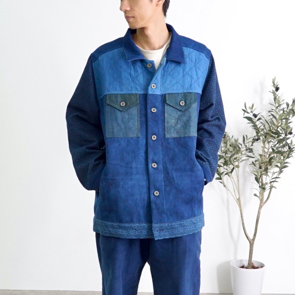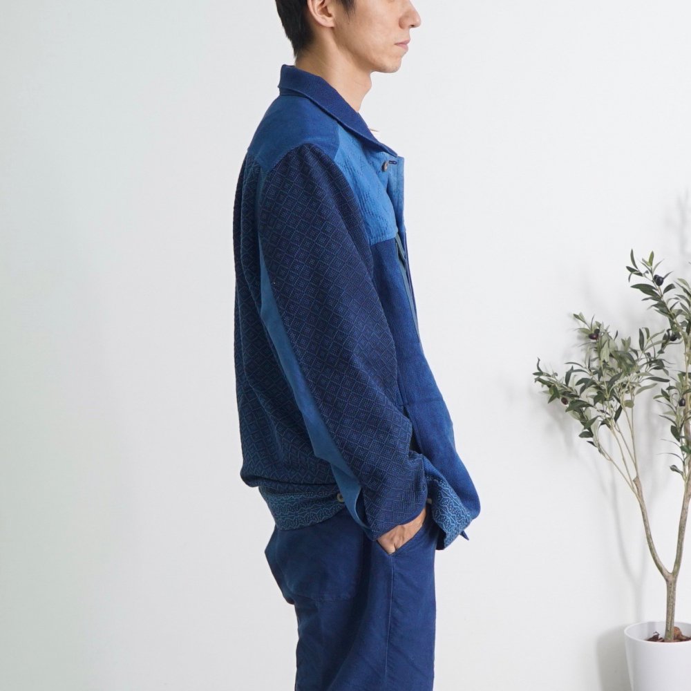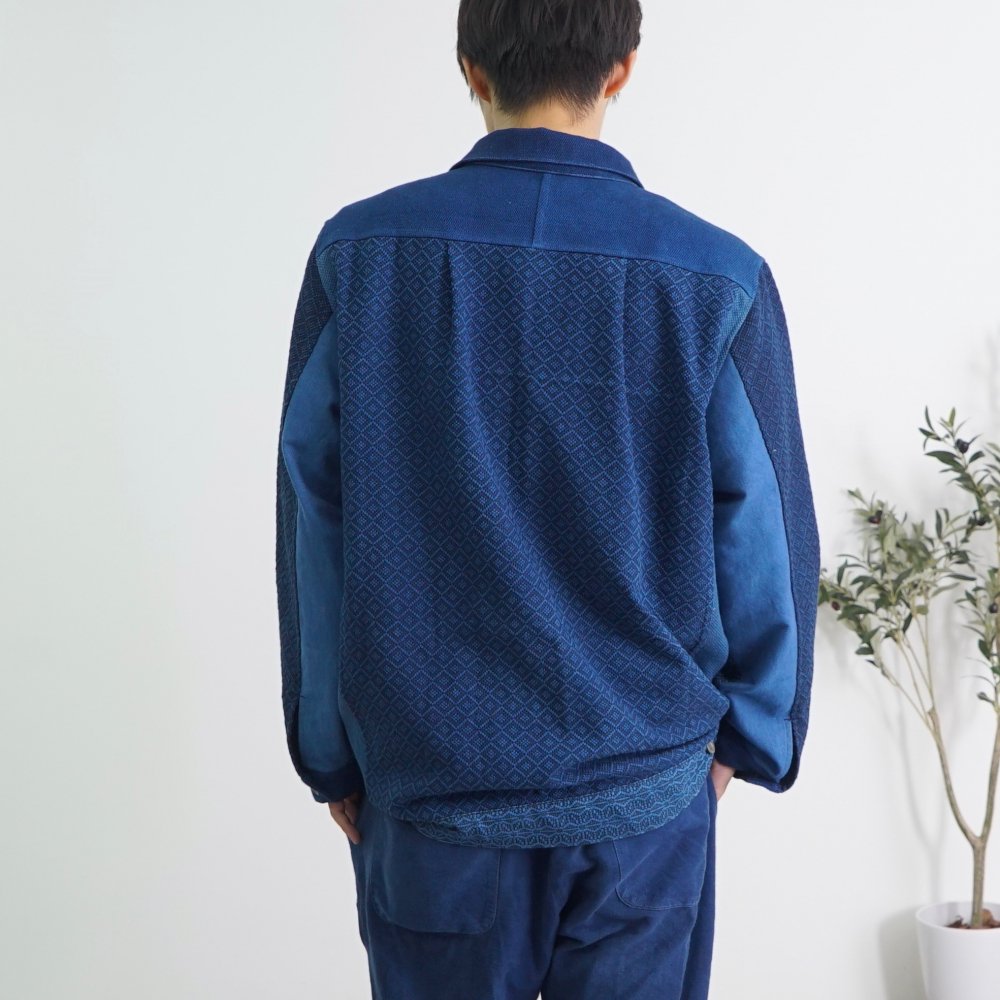 這是用👍的心血製作出來的👍的商品。:雖然不是大衣,但是長度很好的夾克 :用不同的染色花紋和濃淡的三川棉線編織的Packwork :剪裁和更多的縫製,讓人看起來特別的夾克【雖然不是大衣,但是長度很好的夾克】。