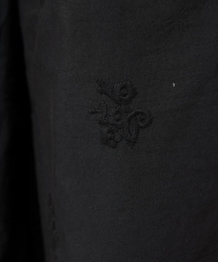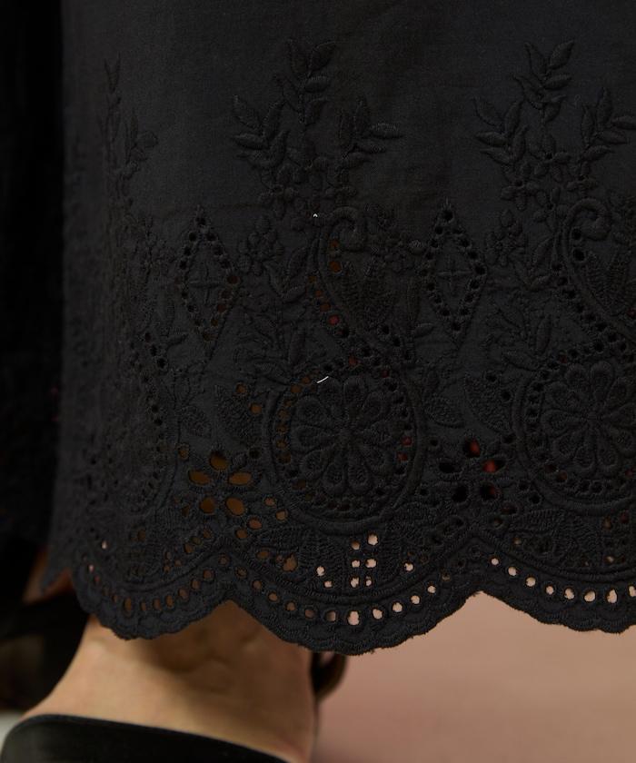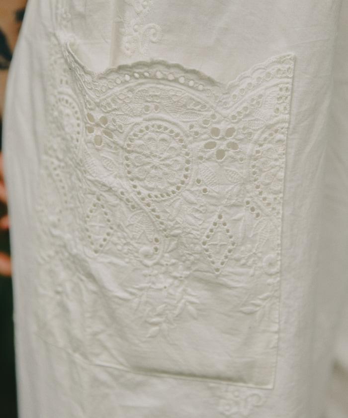 所有部分均採用奢華刺繡面料,下襬部分採用扇形刺繡。刺繡布邊縫成扇貝形狀,所以下襬不是直的,這也是一個特點。