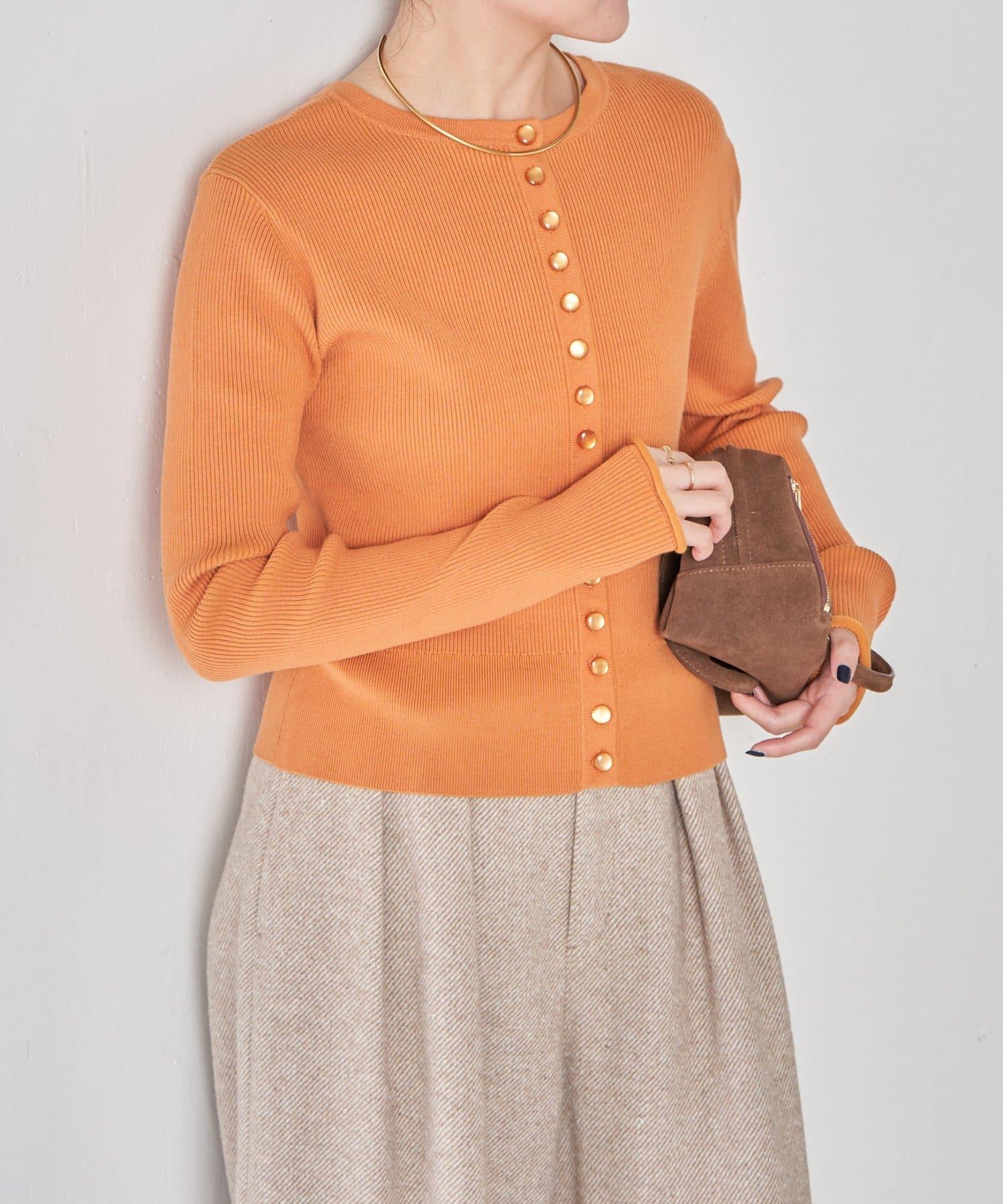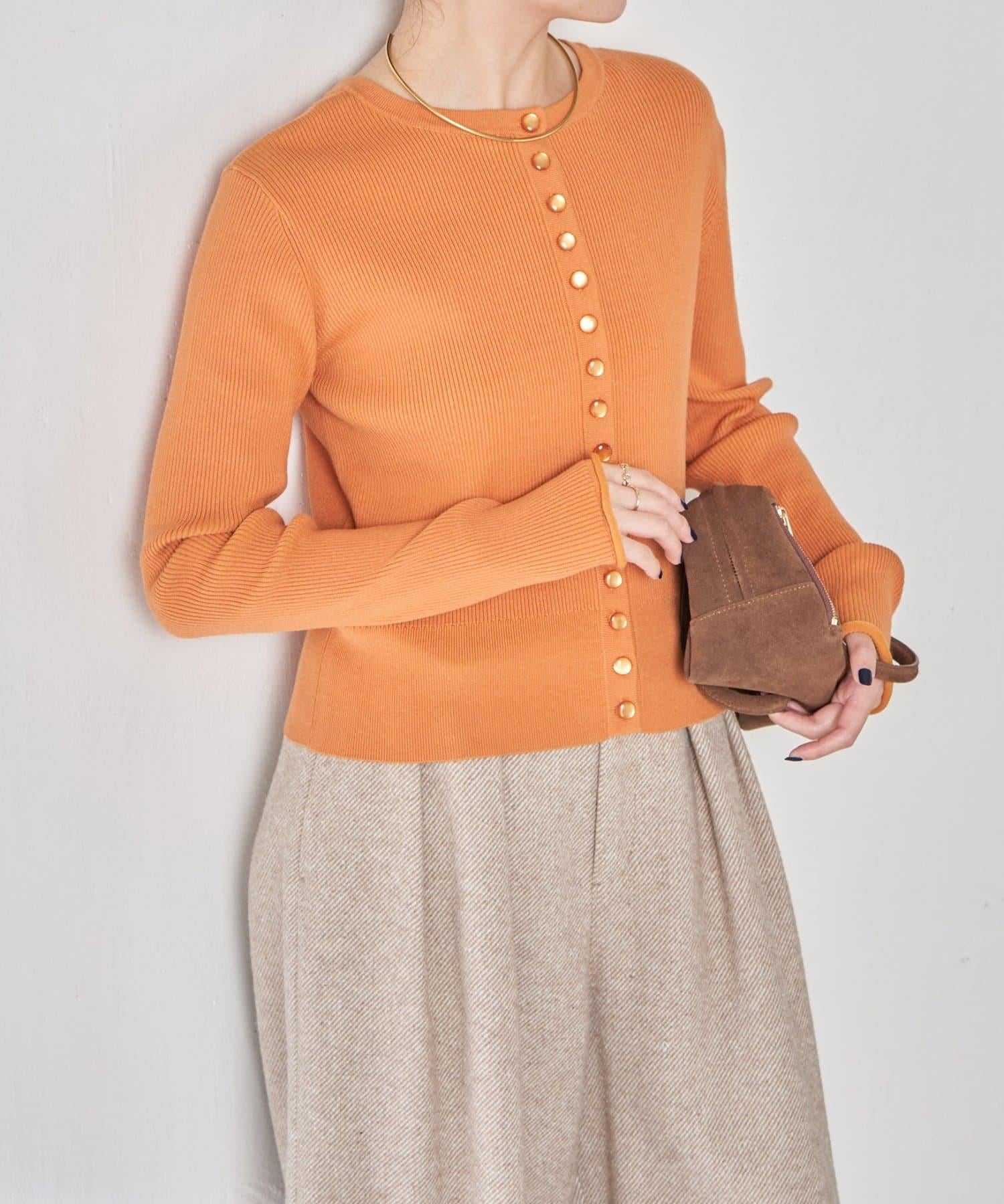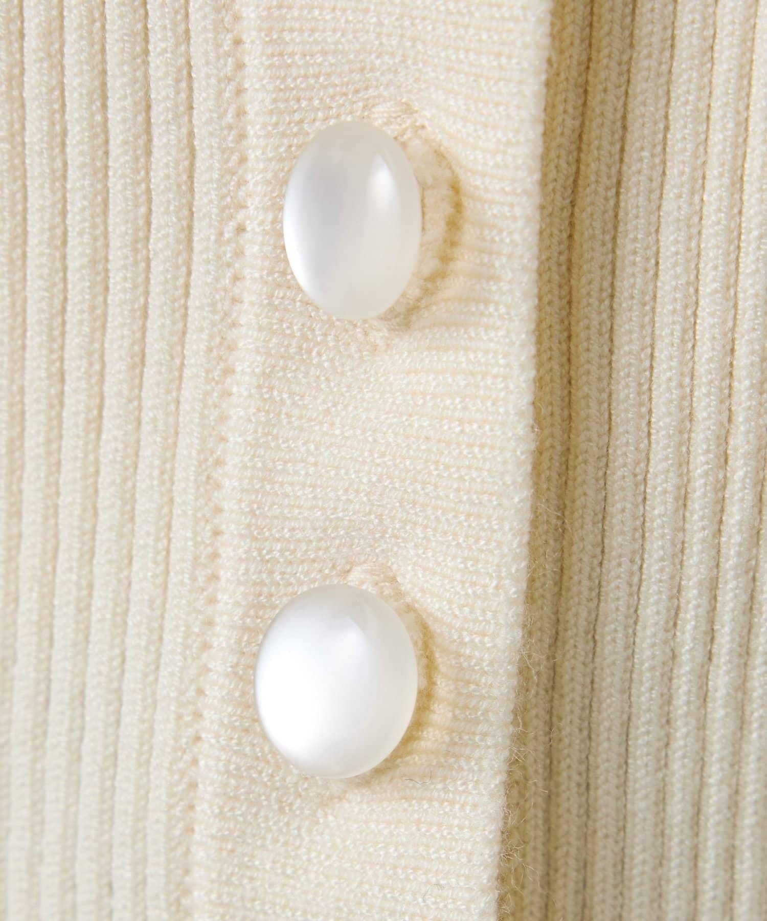 這款開襟羊毛衫的紐扣閃亮優雅。