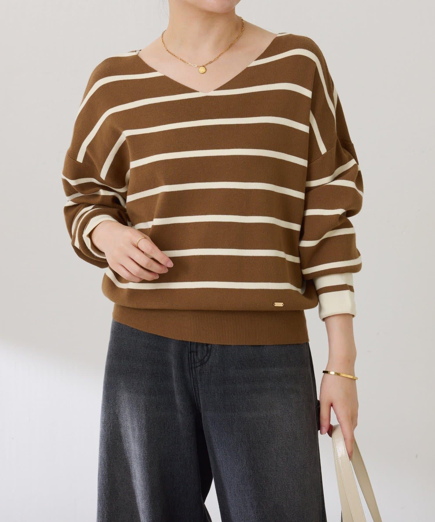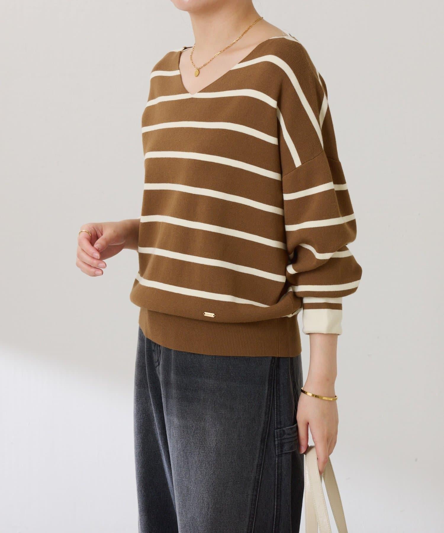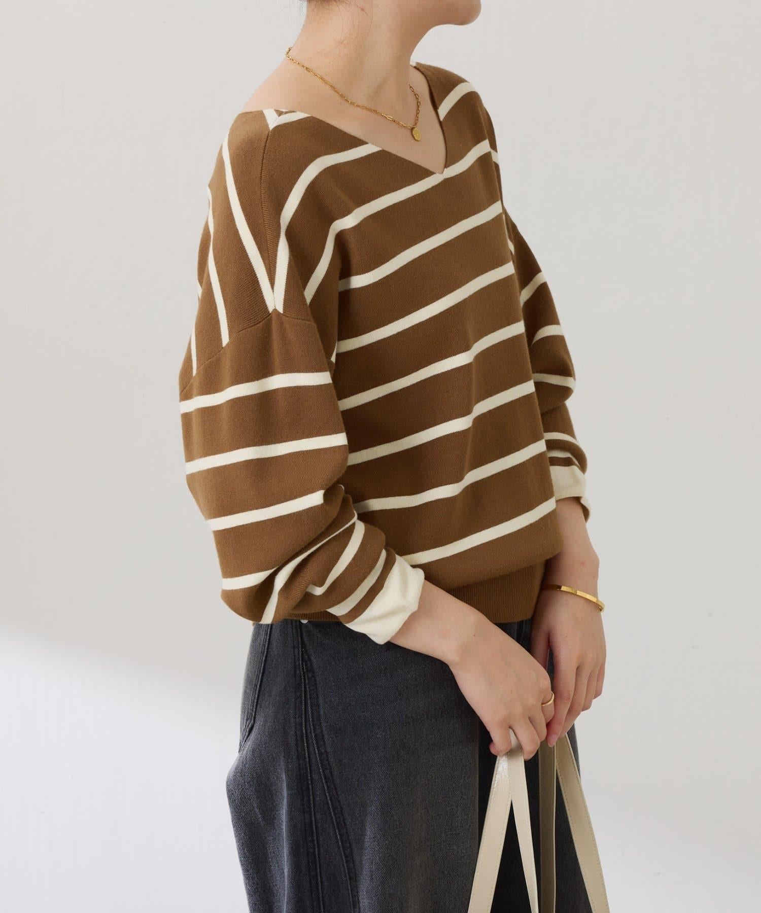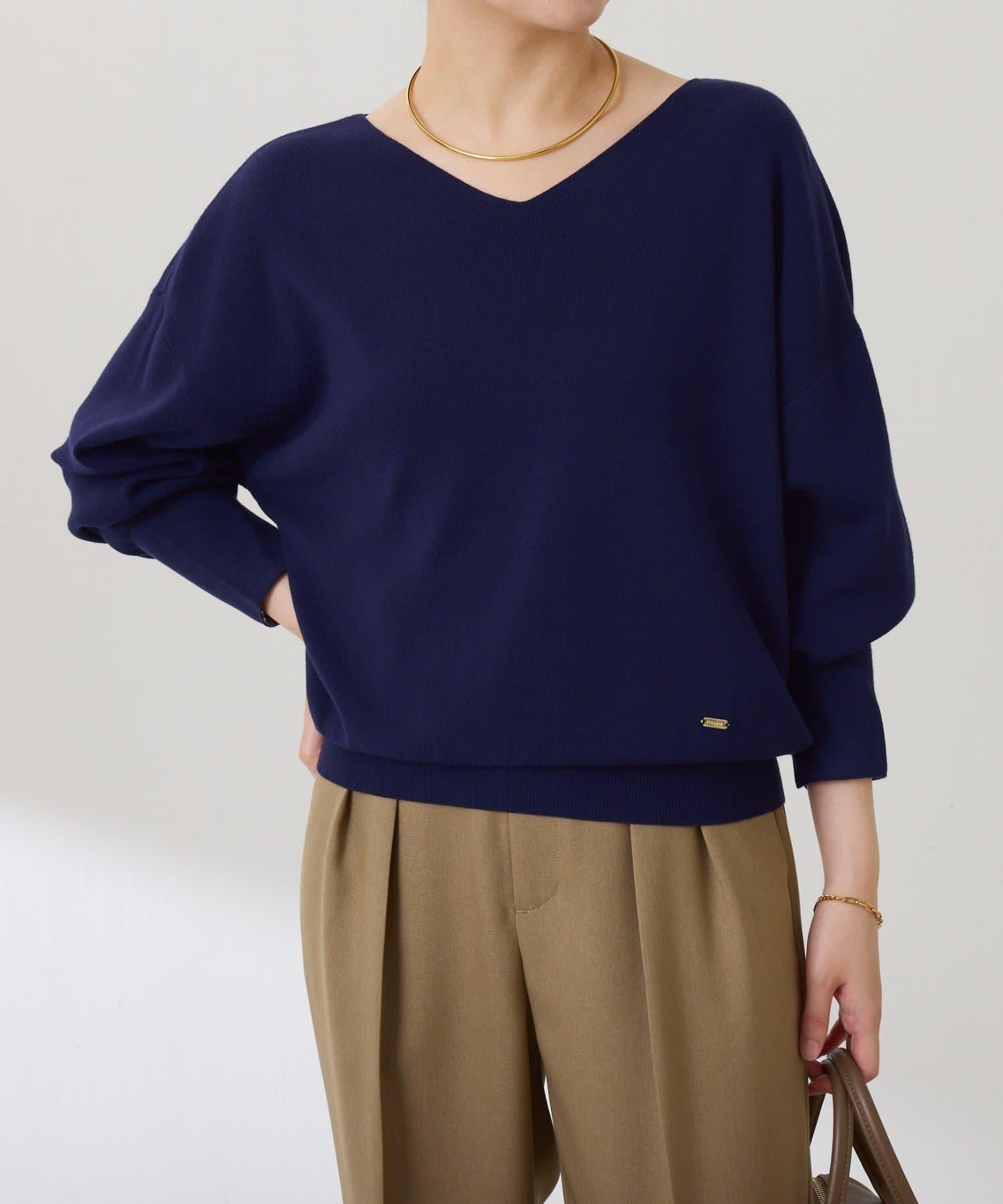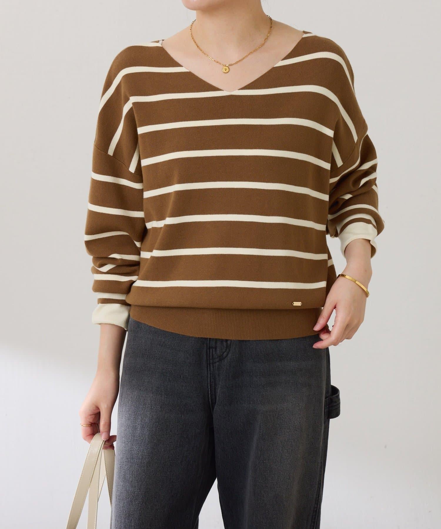雙向前後設計的多爾曼針織衫,領口為淺 V 和船領。
