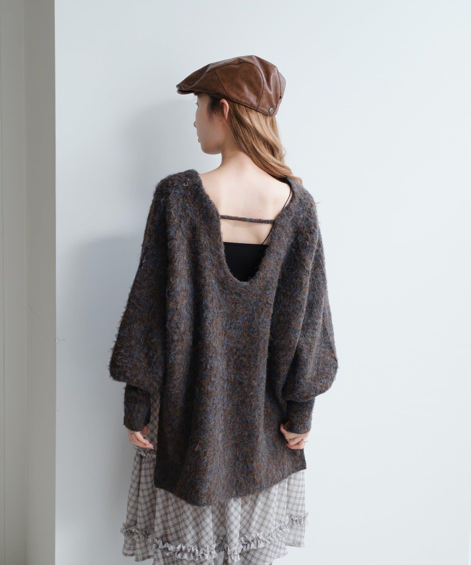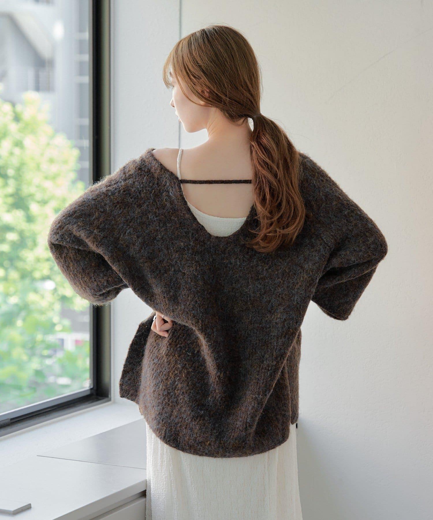 這款 V 領針織衫採用混色紗線,採用雙向設計,前後均可穿著。