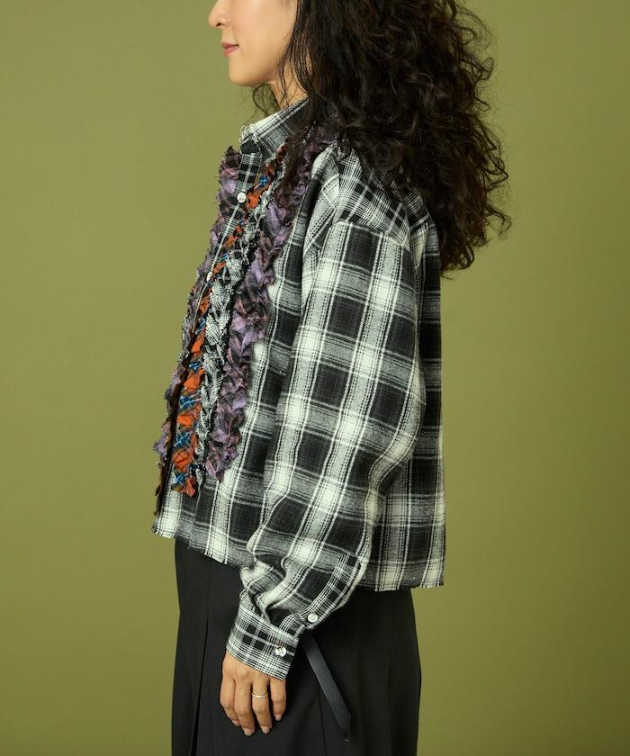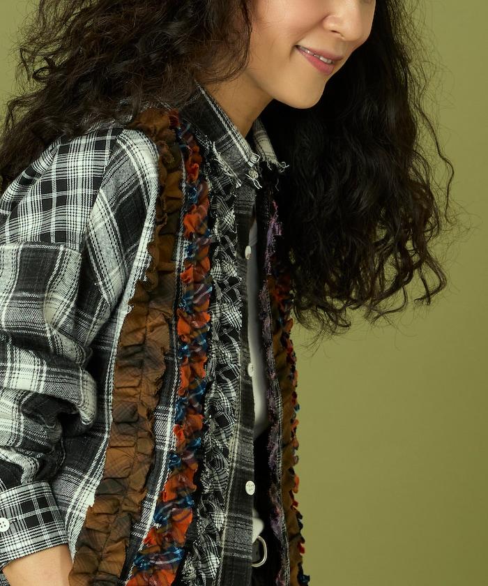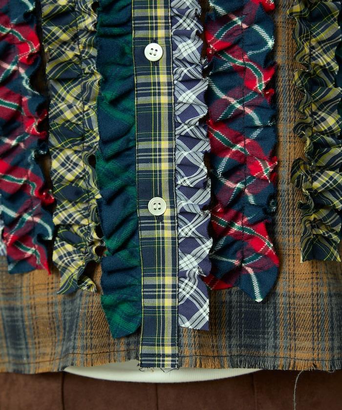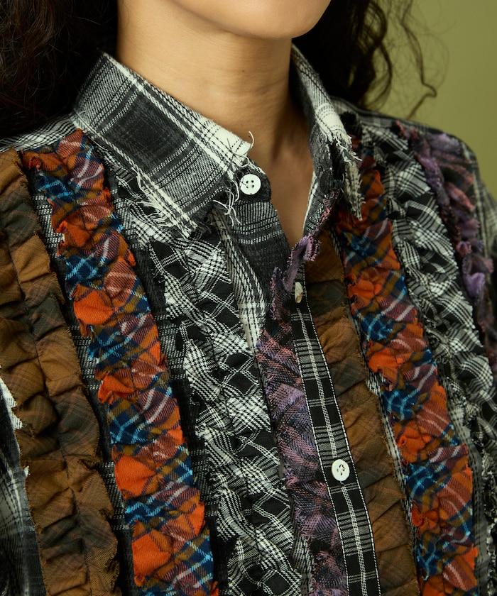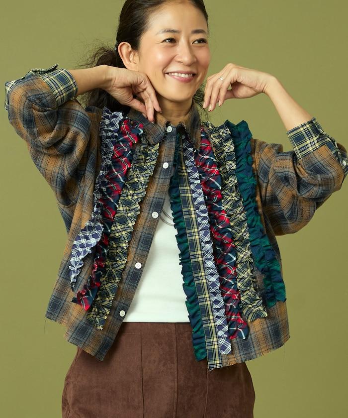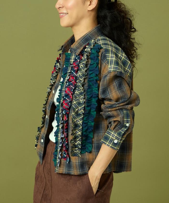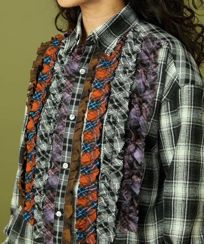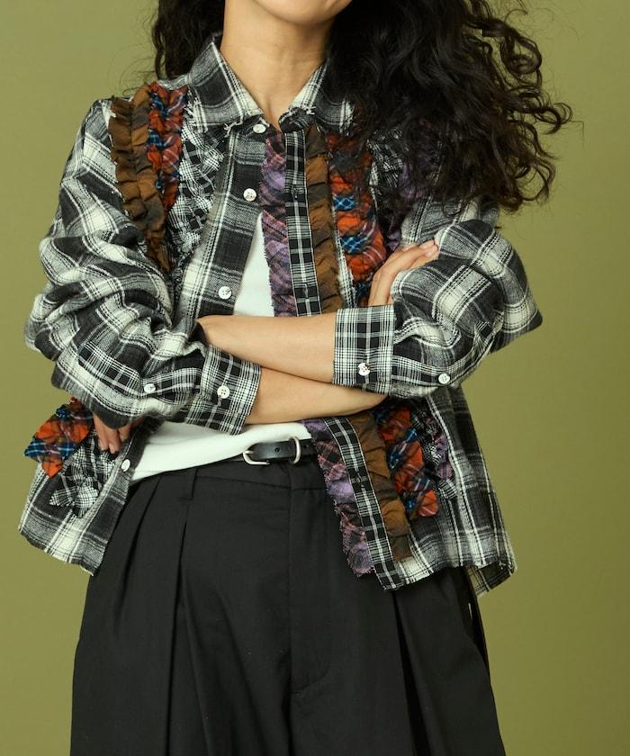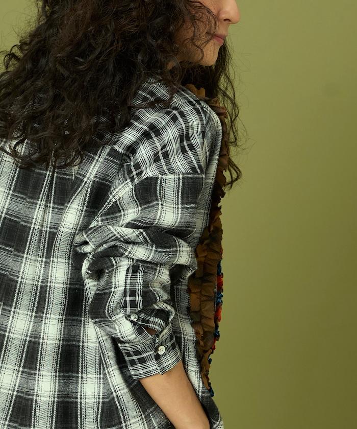 荷葉邊部分採用類似弗裡達圖案的××圖案襯衫,同時進行調整,使相同圖案的格紋不會相鄰。