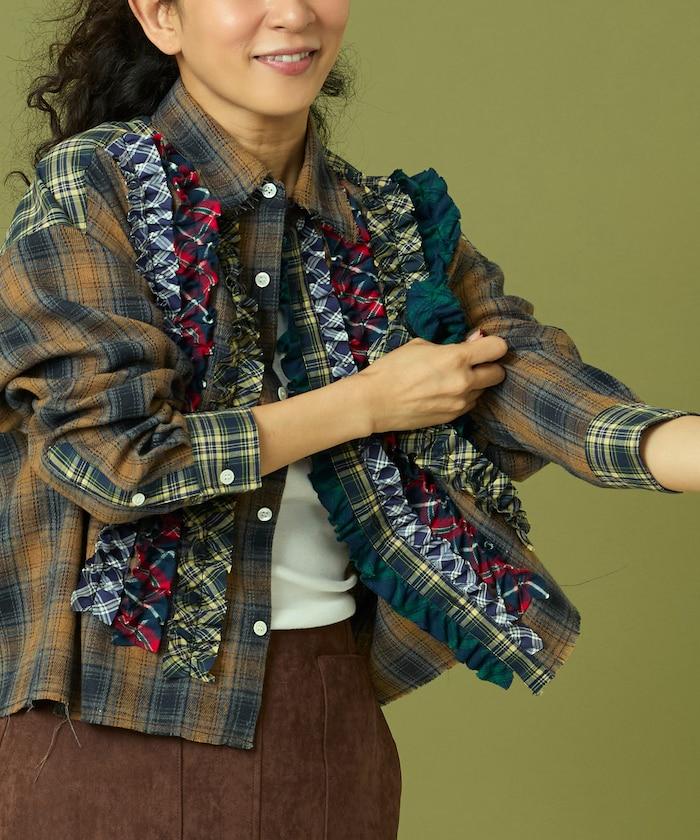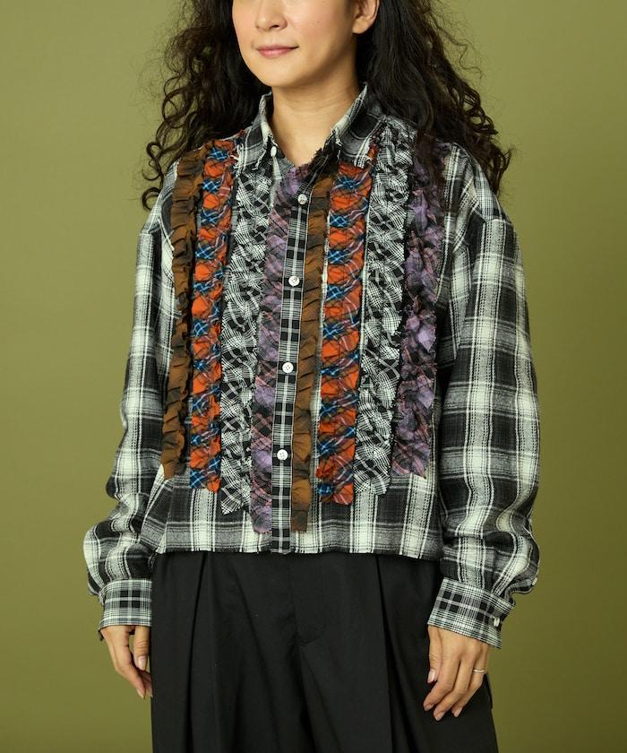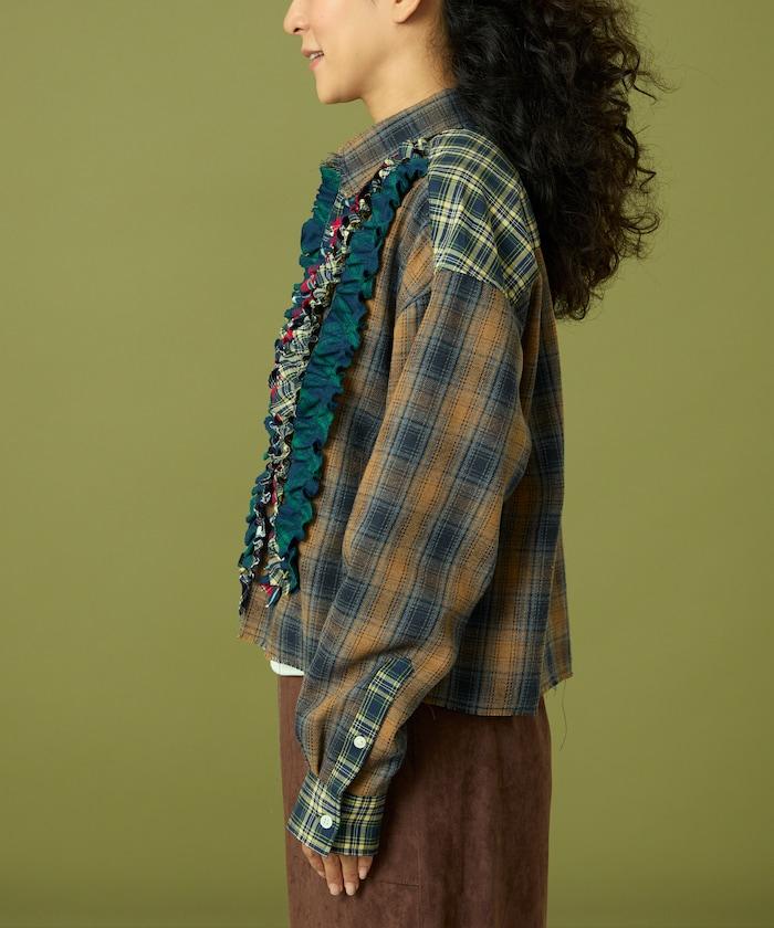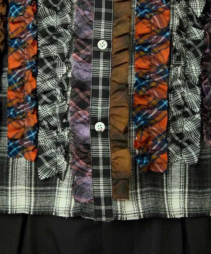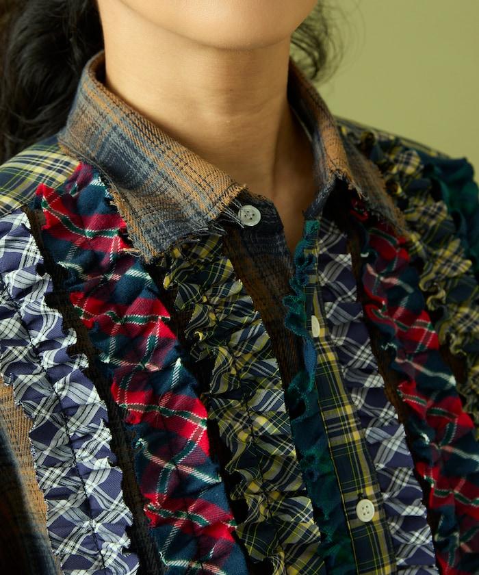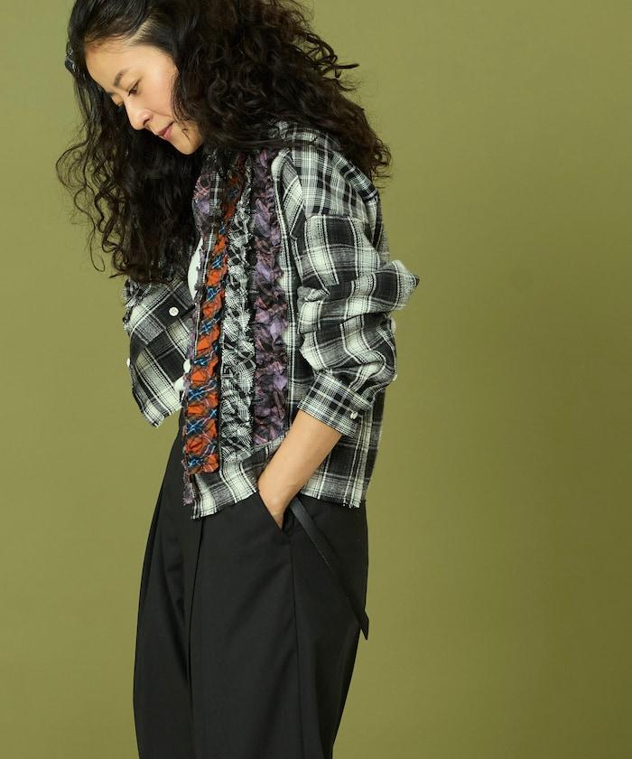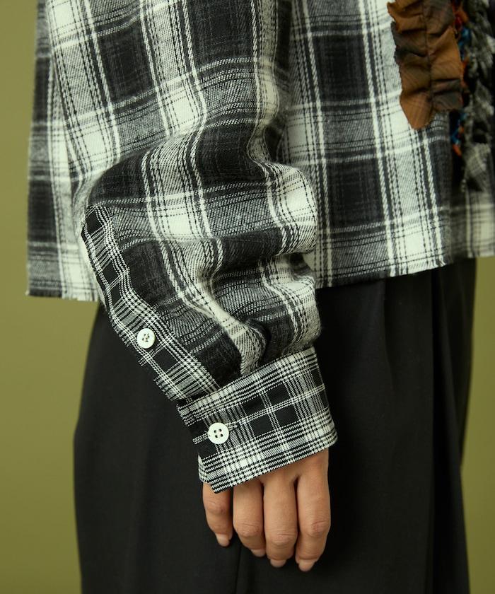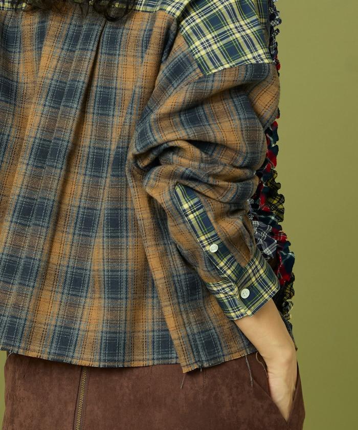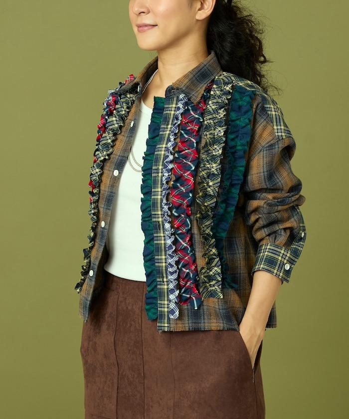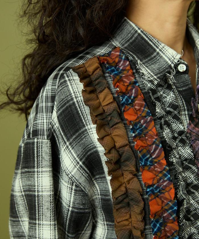 荷葉邊部分採用類似弗裡達圖案的××圖案襯衫,同時進行調整,使相同圖案的格紋不會相鄰。