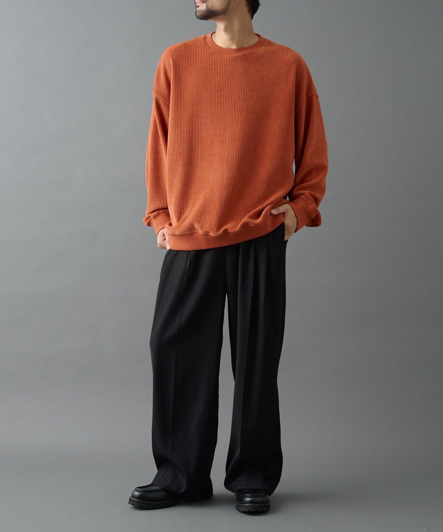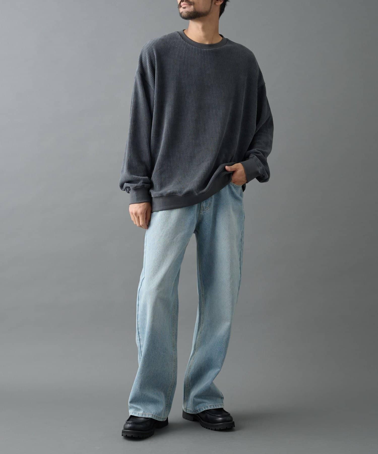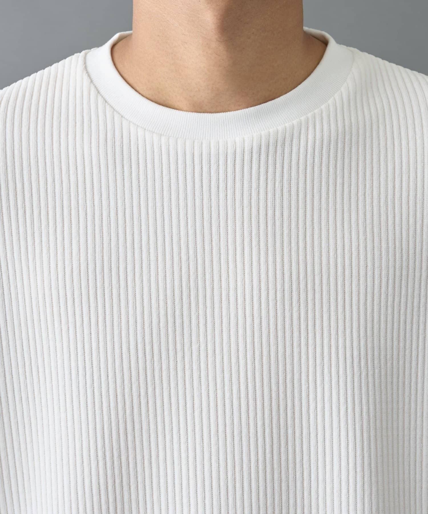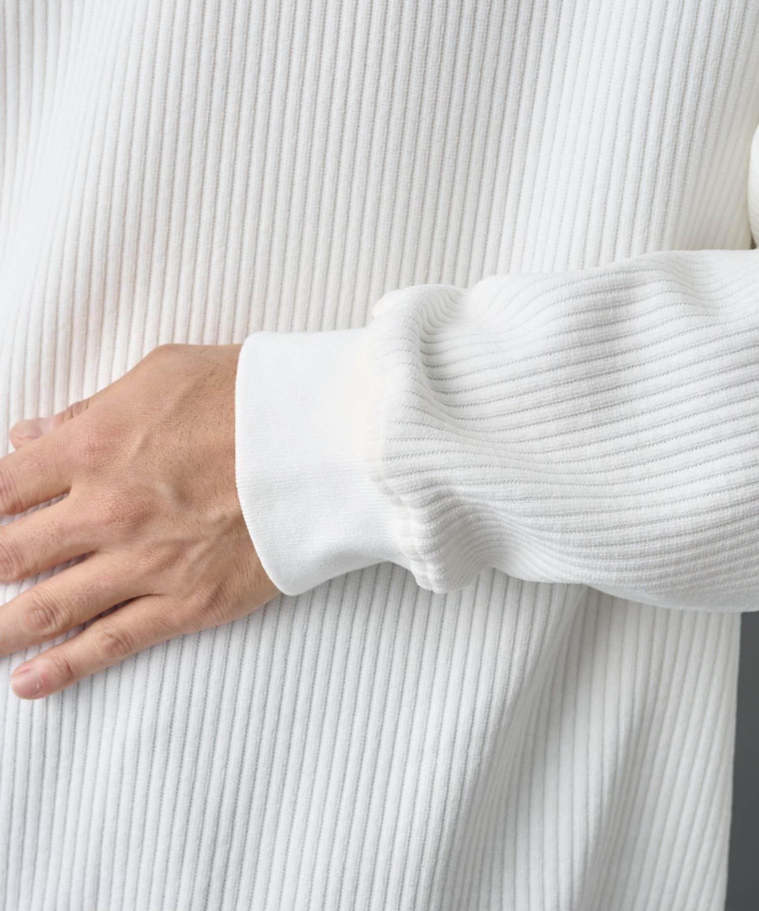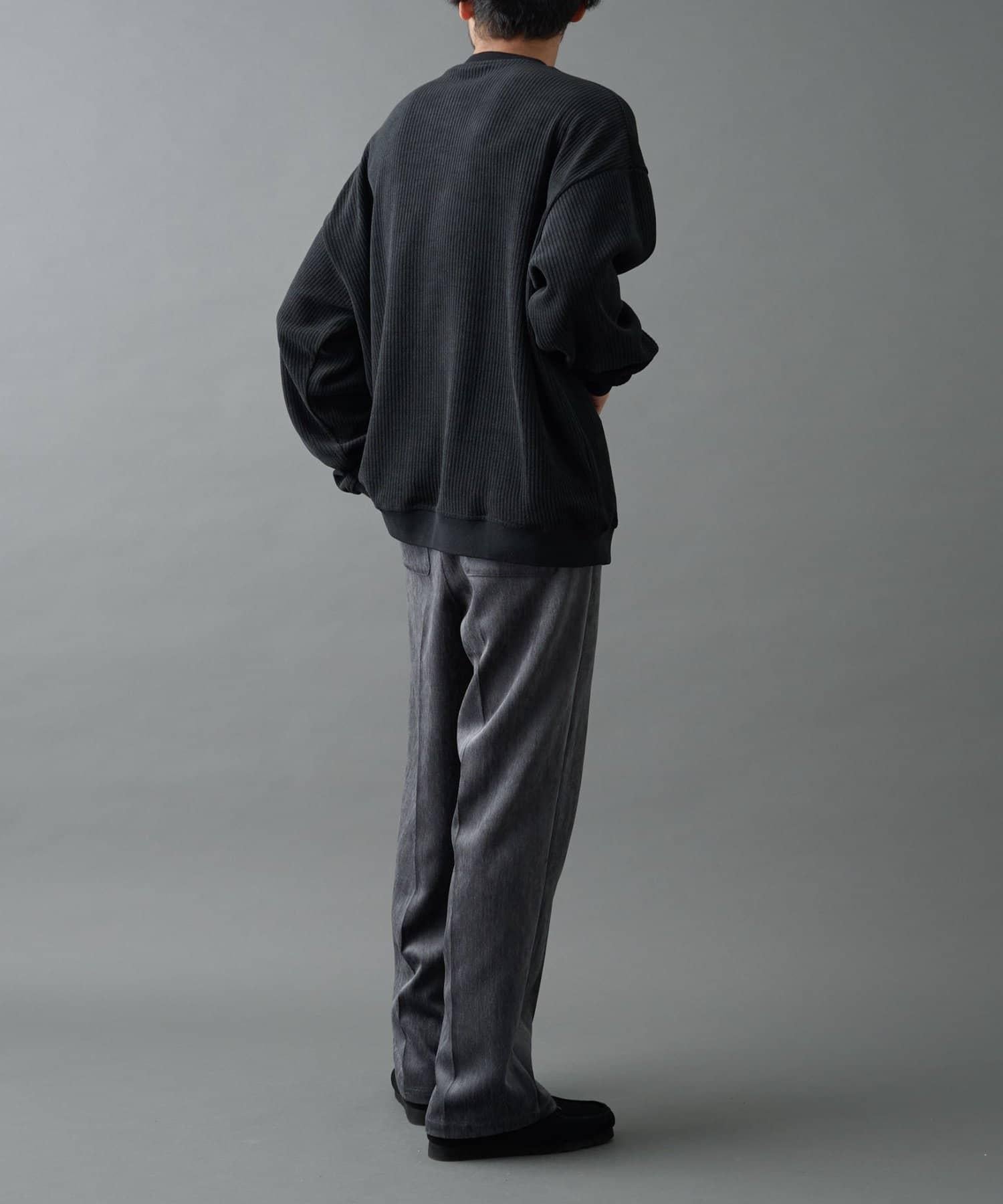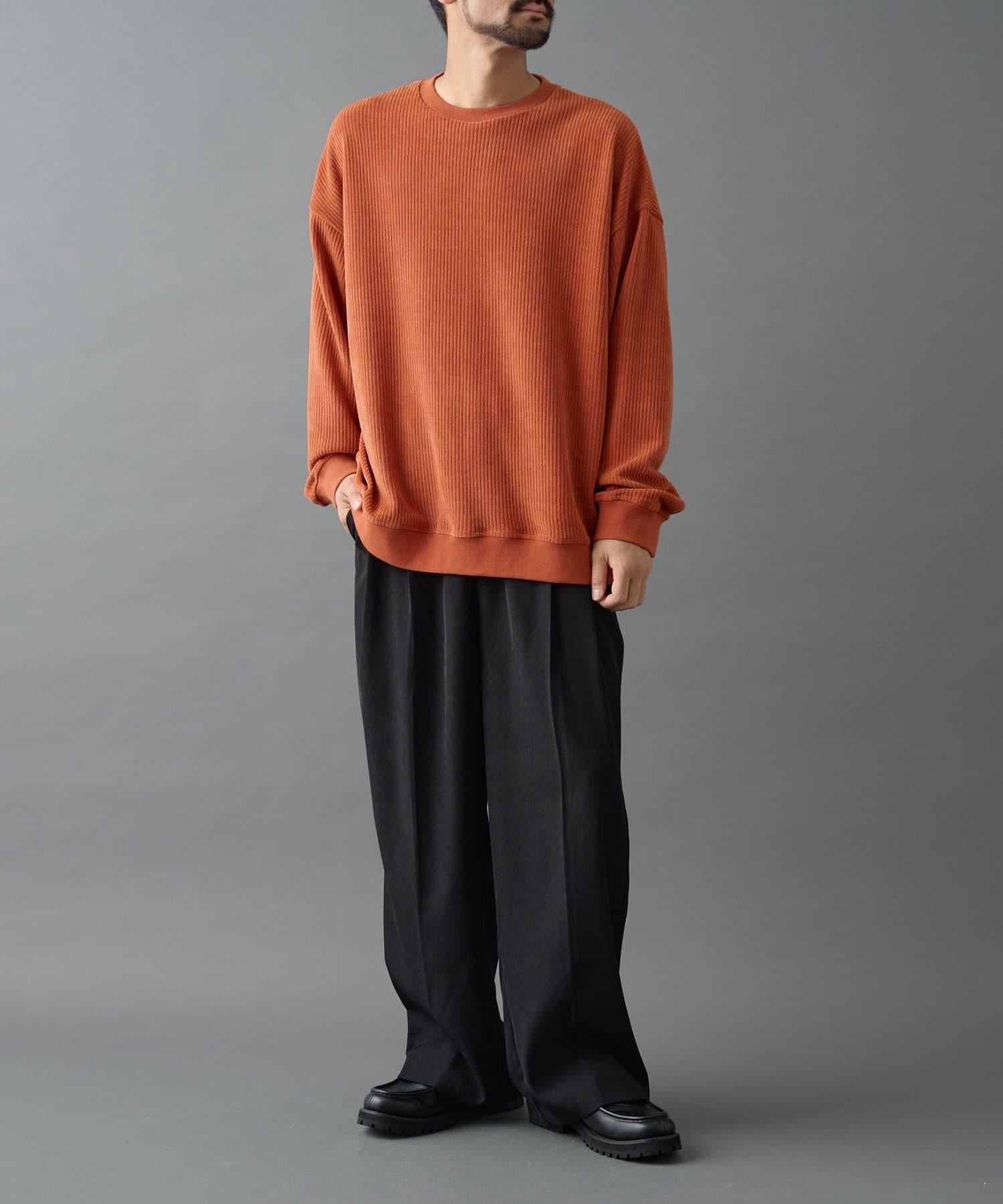 這款圓領衫由燈芯絨面料製成,帶有獨特的垂直脊紋。
