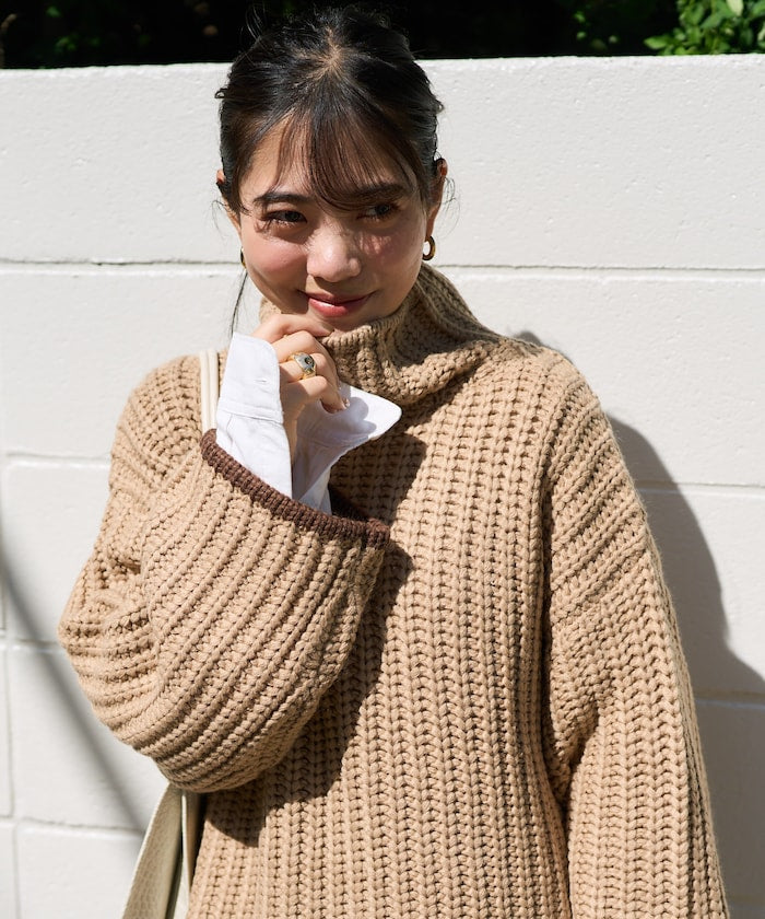 低針距高領針織衫,袖子寬鬆,配色點睛。