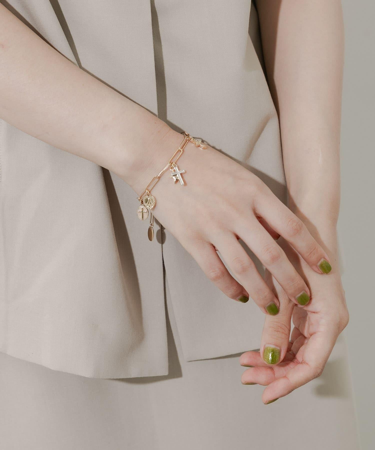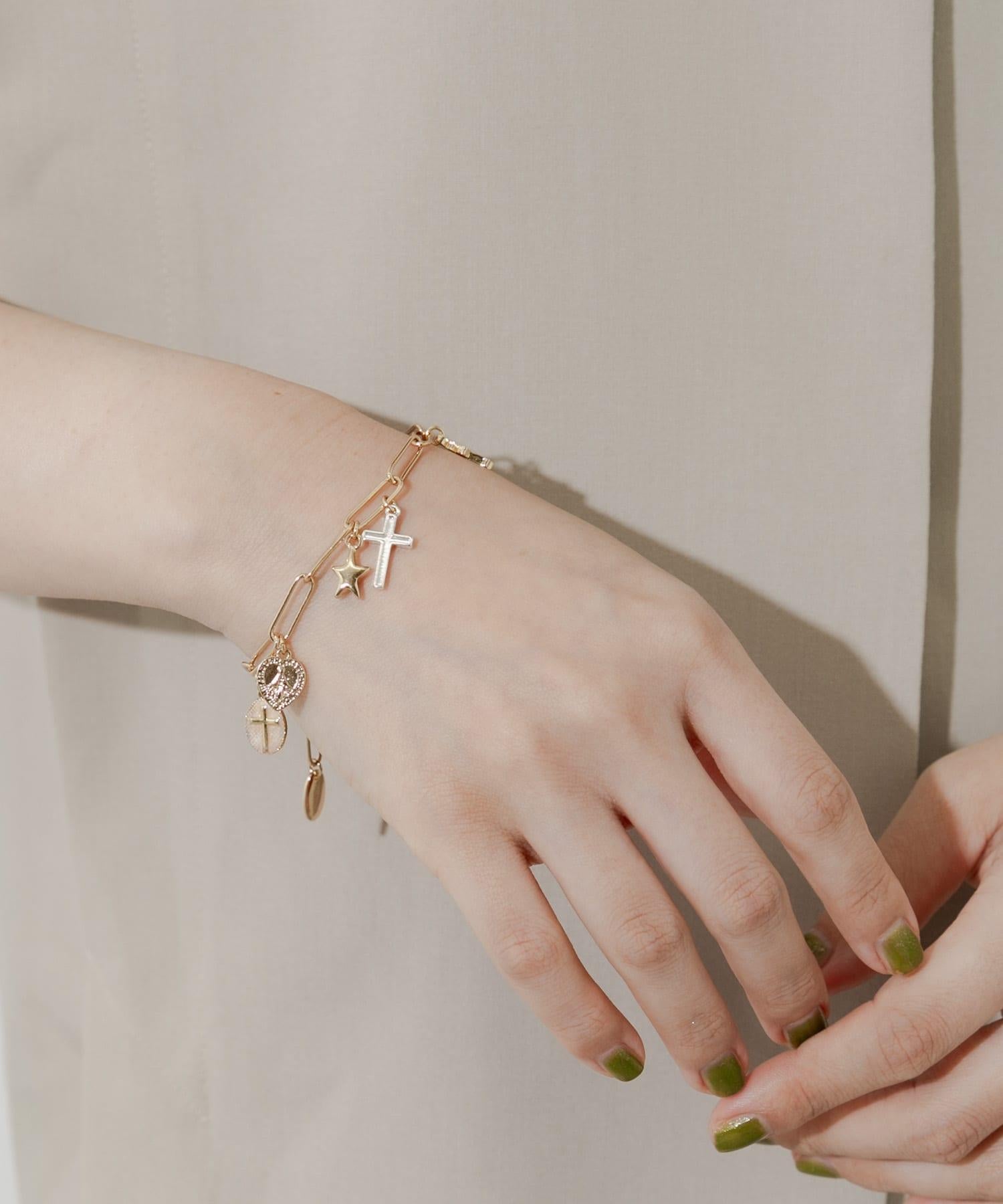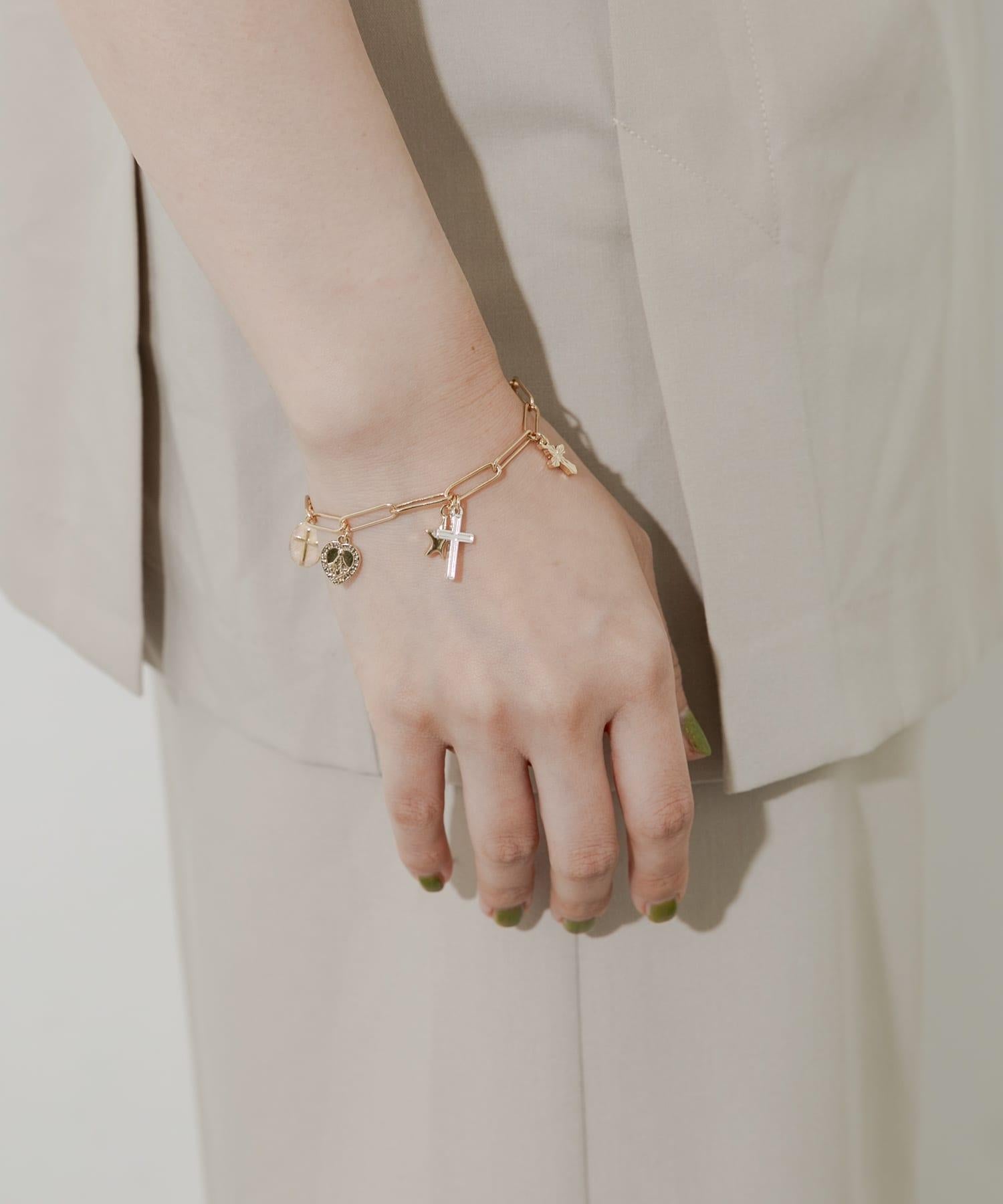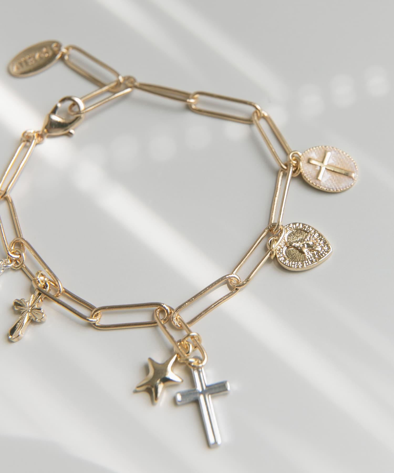 這款手鍊上飾有星星、十字架、硬幣和其他圖案吊飾。