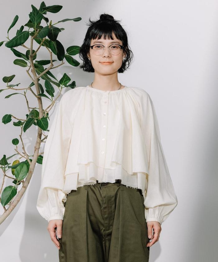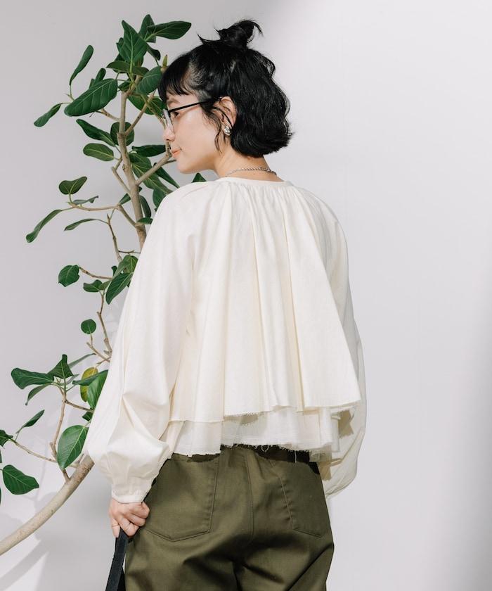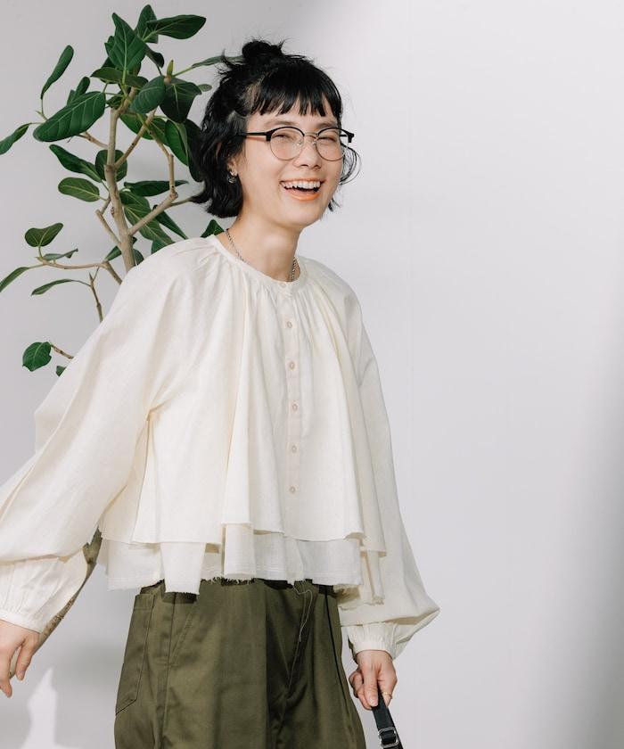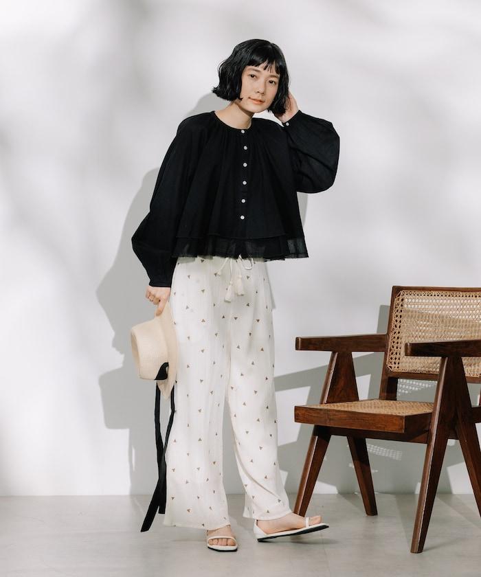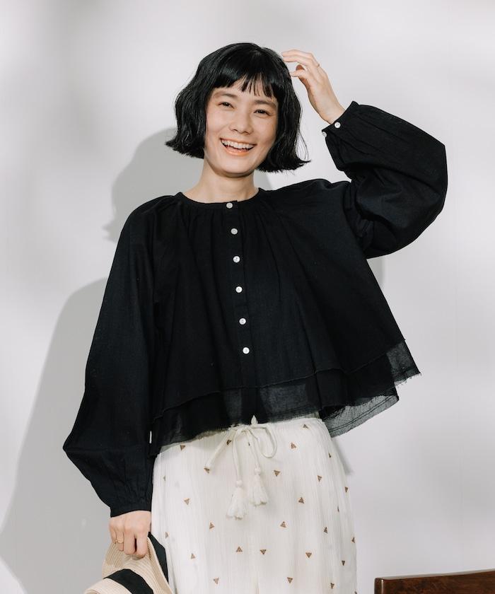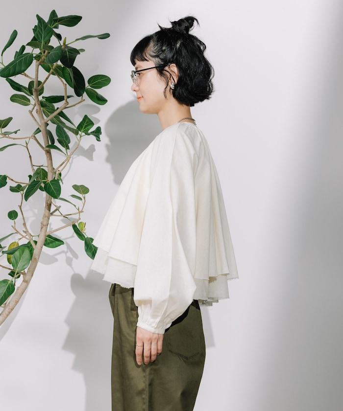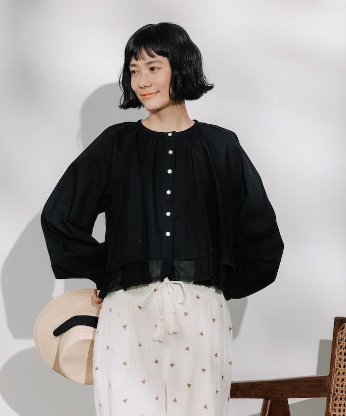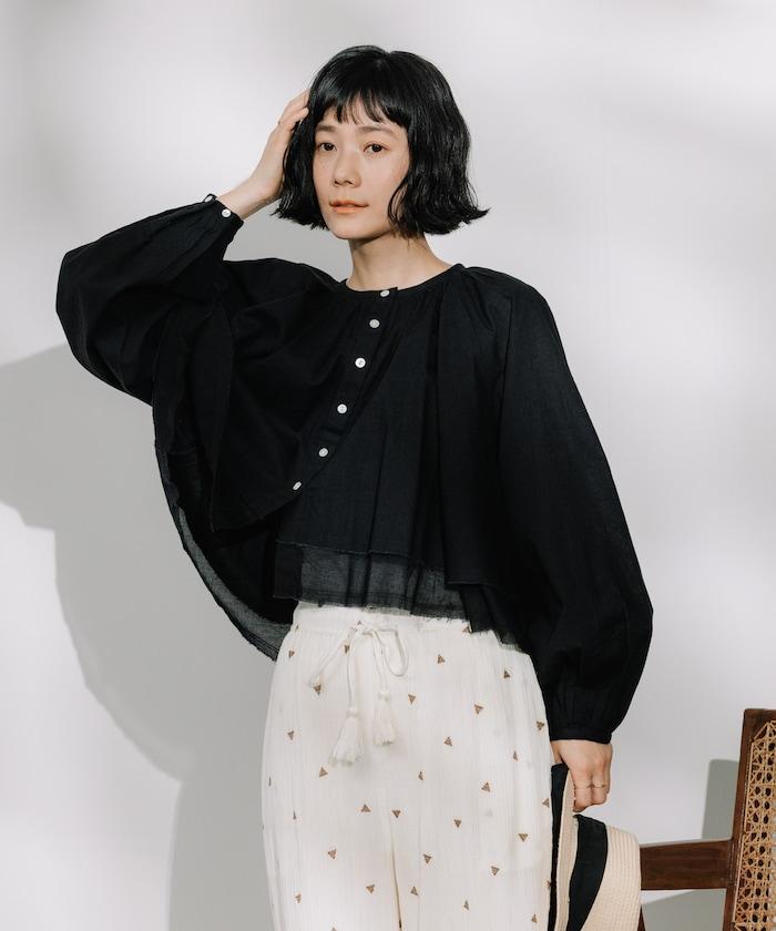 這款設計看上去就像是用具有古樸感的棉麻面料和具有薄紗感的棉質紗布層疊而成。