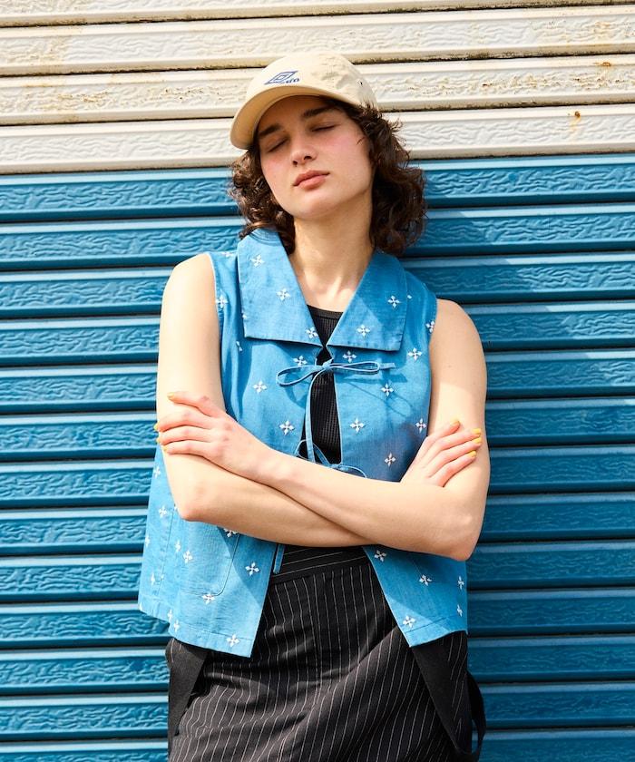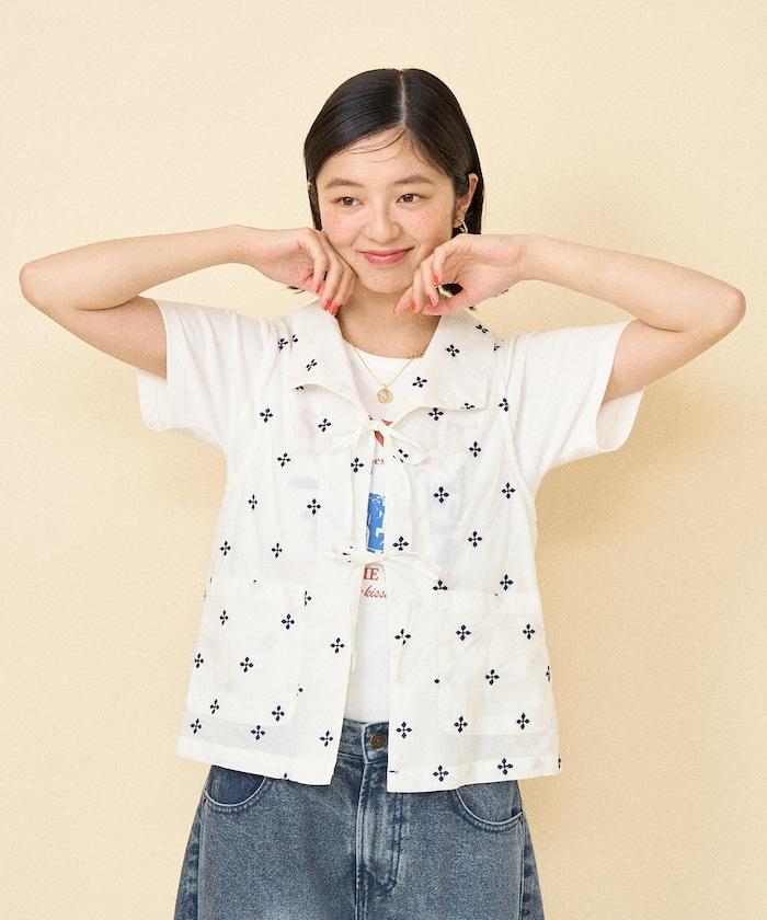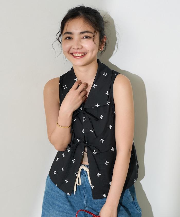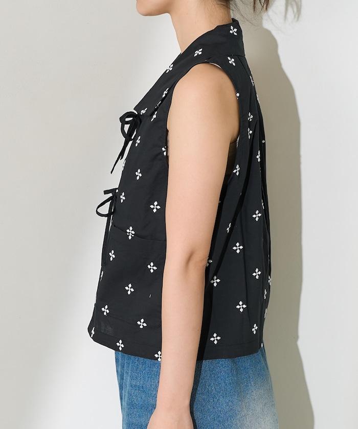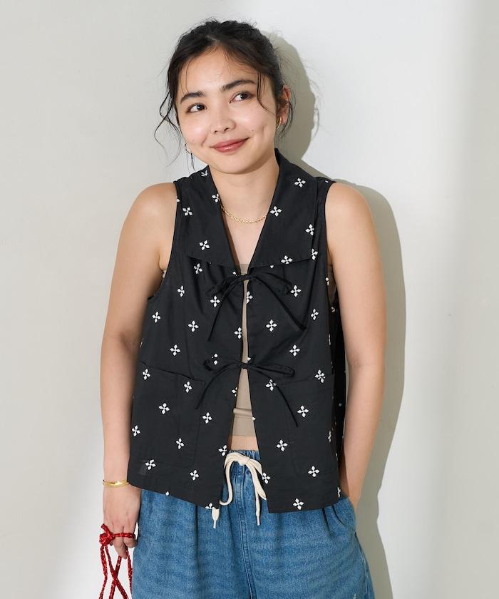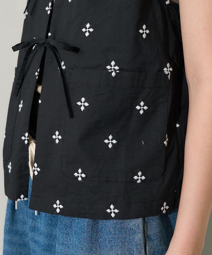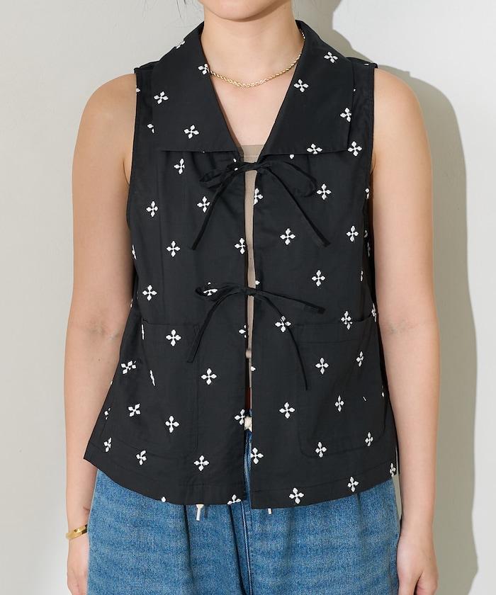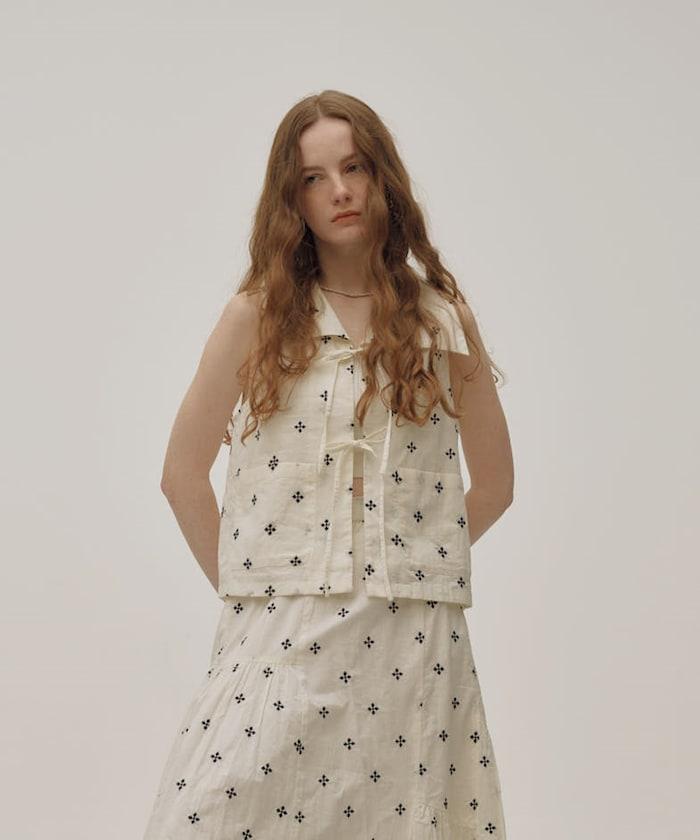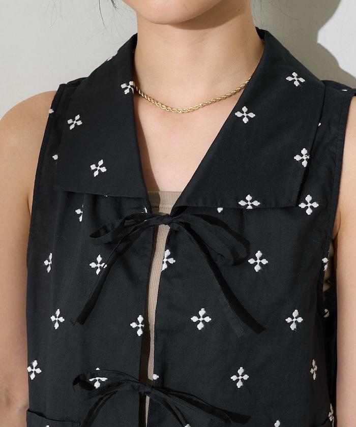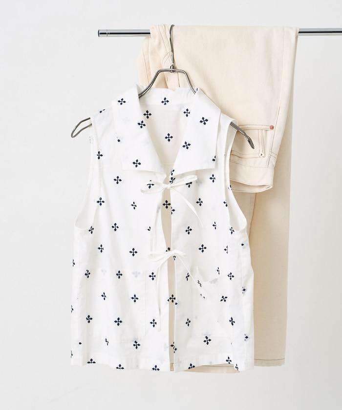 這款刺繡馬甲帶有大領和絲帶,可為多層次的款式增添花朵。