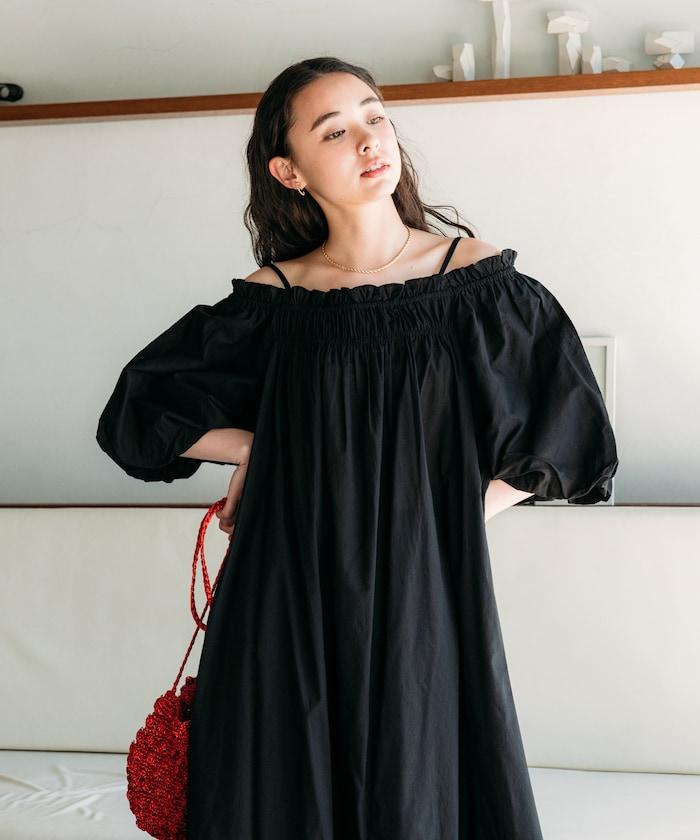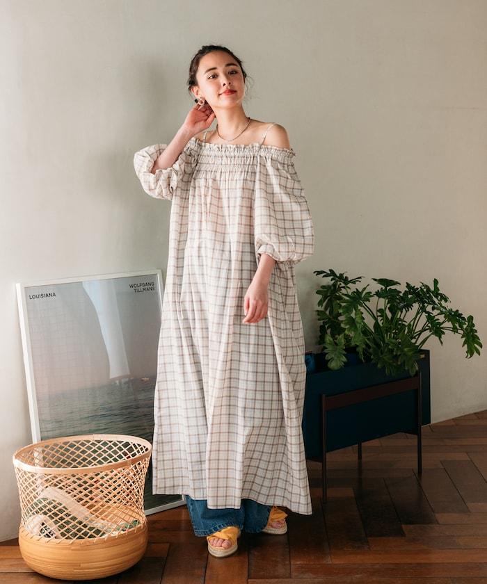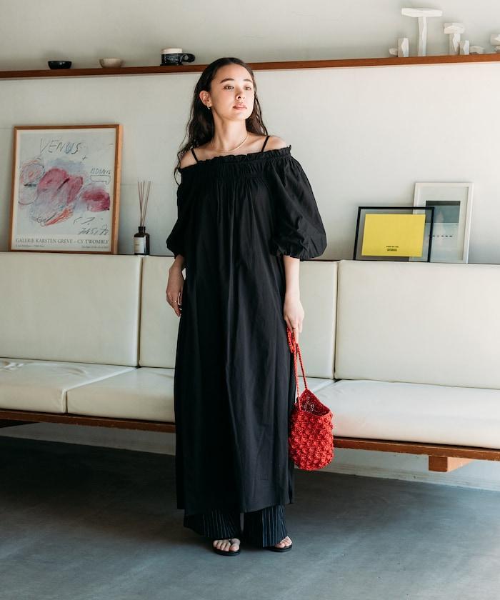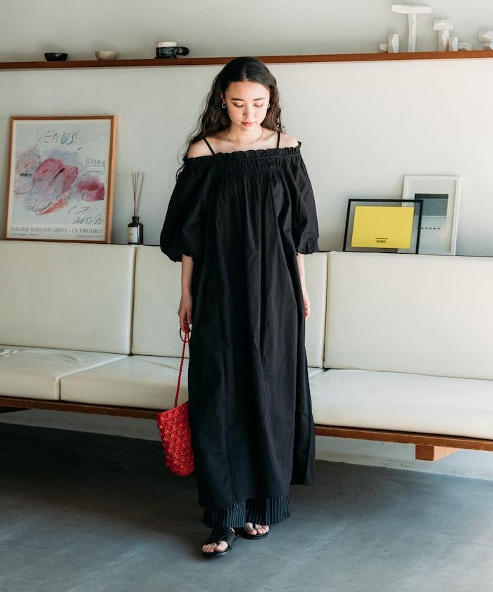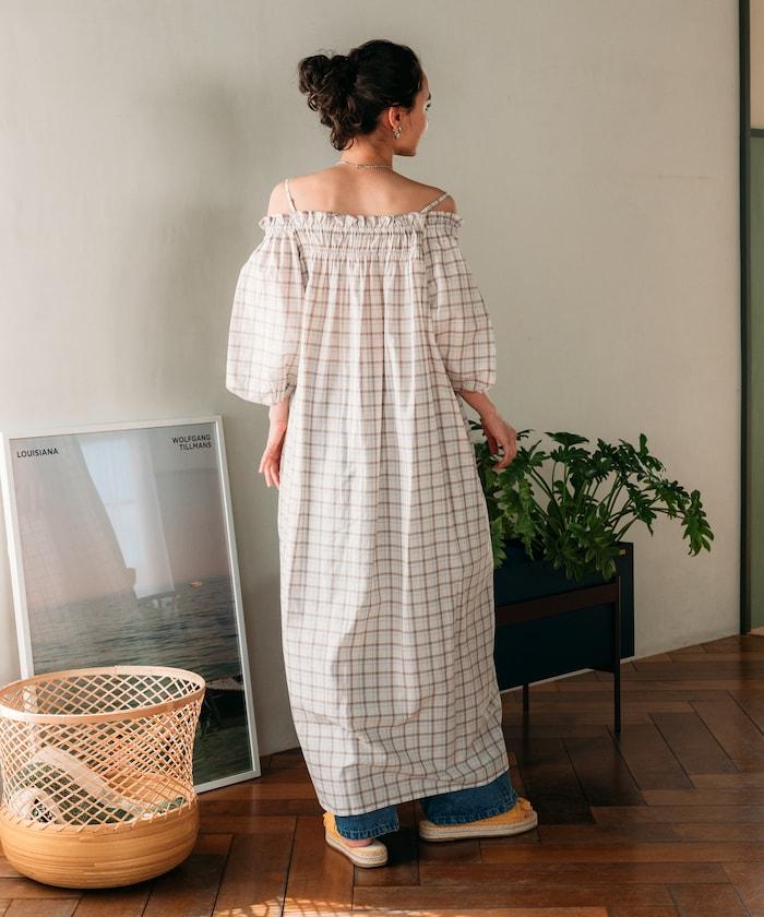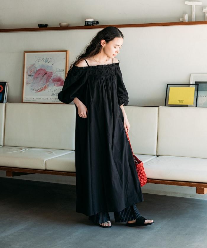 露肩連衣裙,採用柔軟的棉質面料。