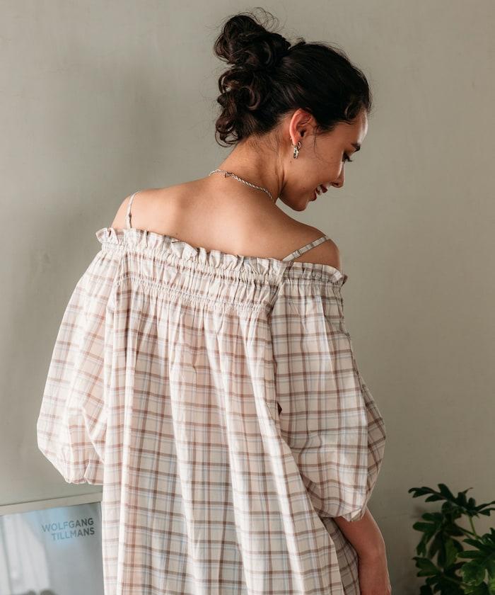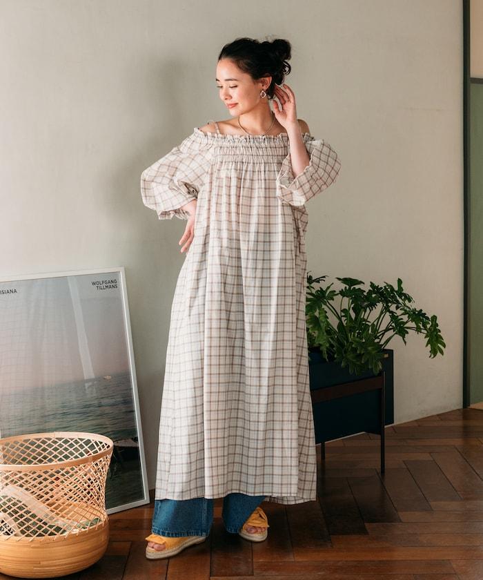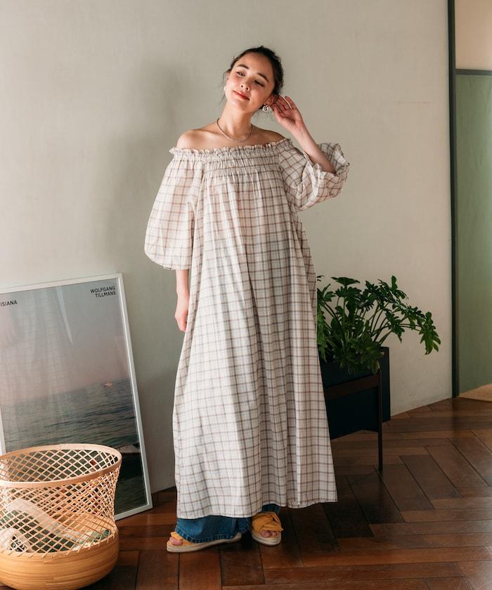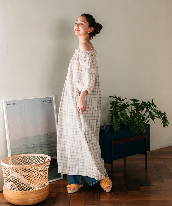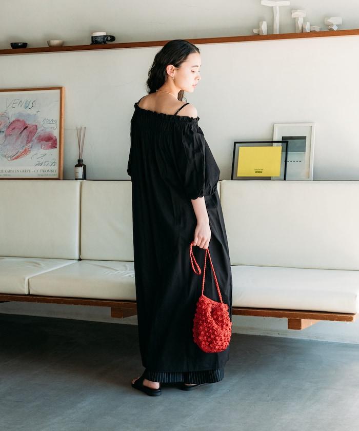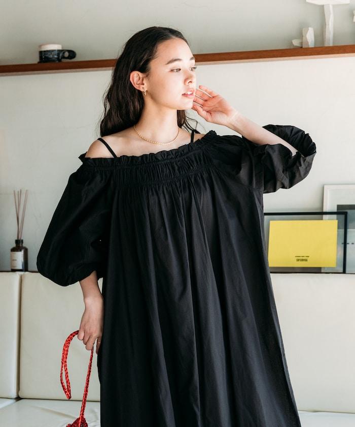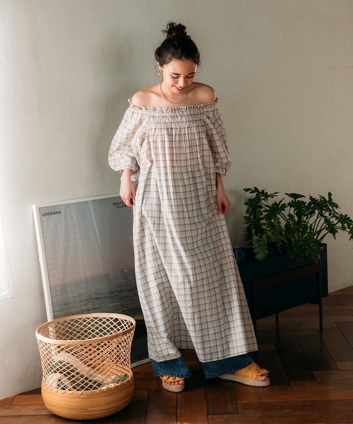 露肩連衣裙,採用柔軟的棉質面料。