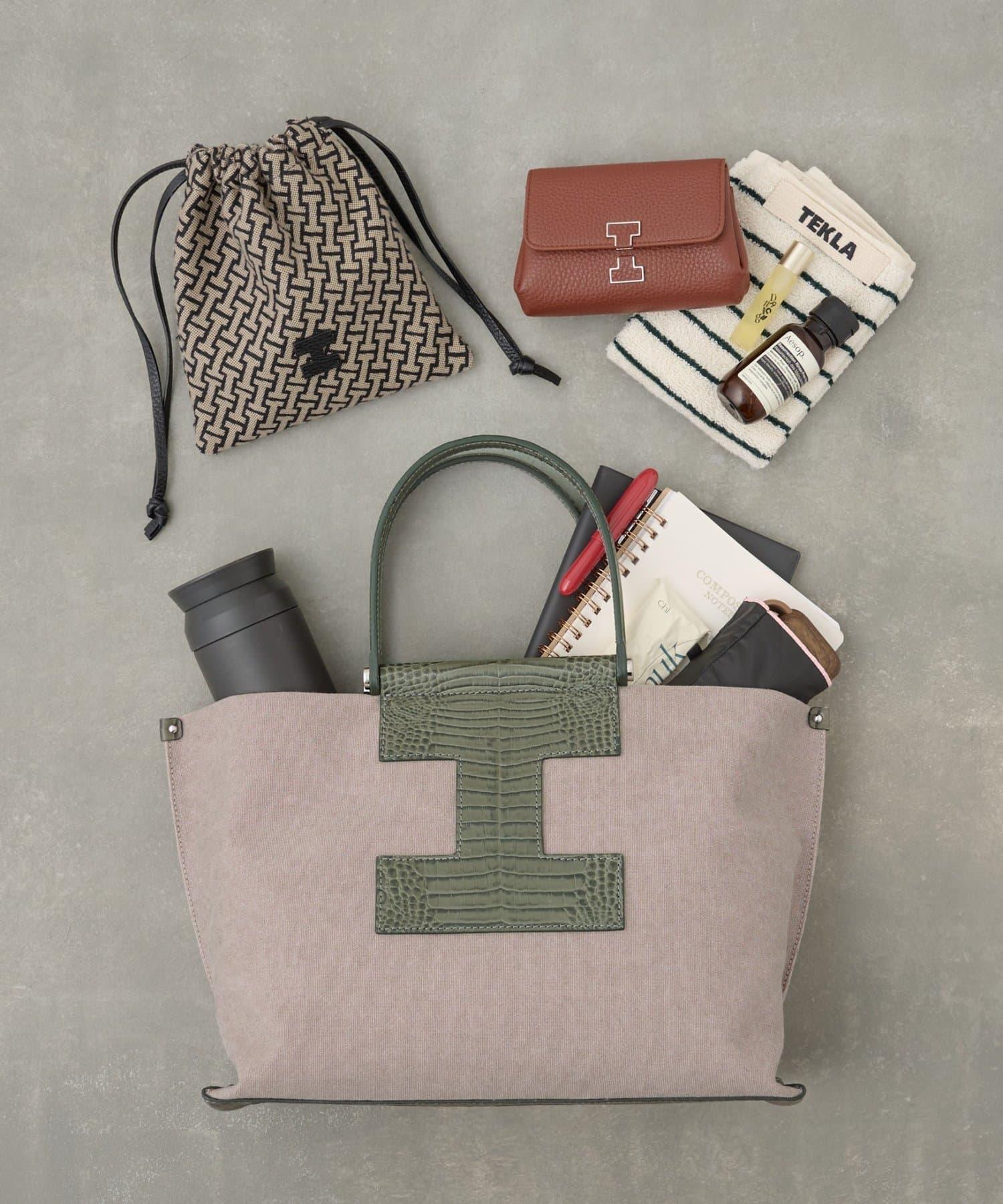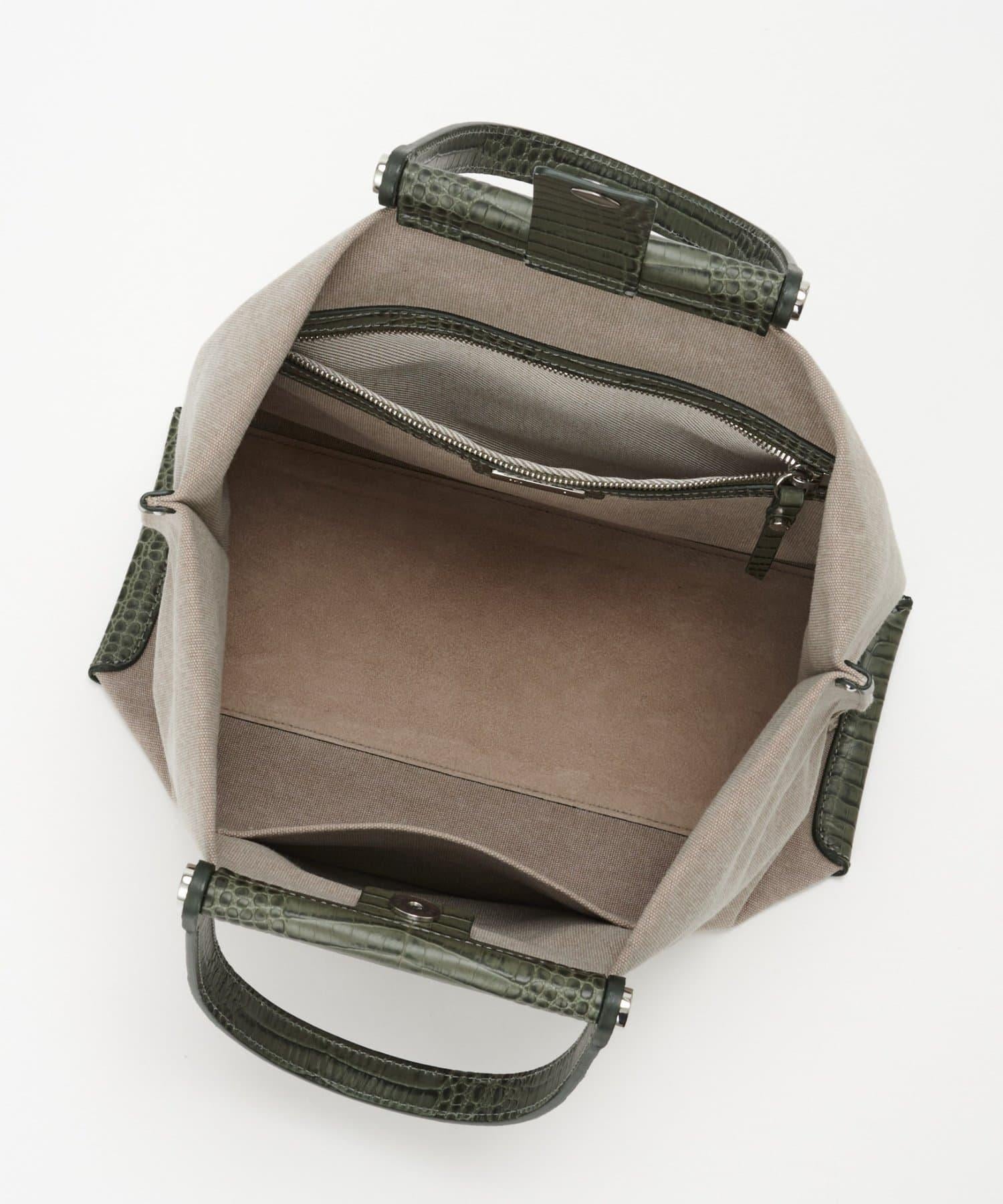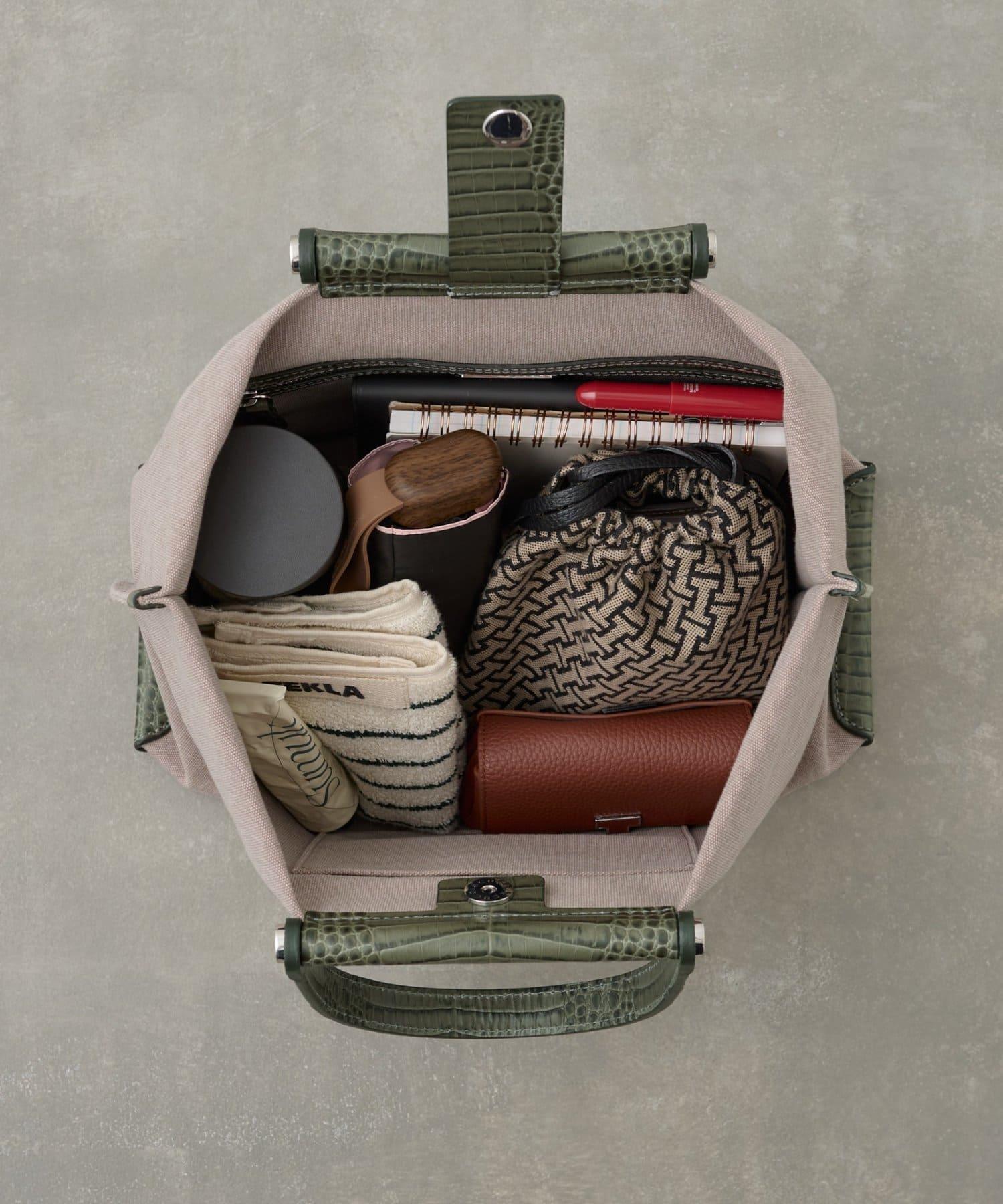 帆布面料選用深色調,與時尚的墨綠色皮革相得益彰。中號尺寸👍可容納 A4 紙張,適合日常外出和工作等多種用途。