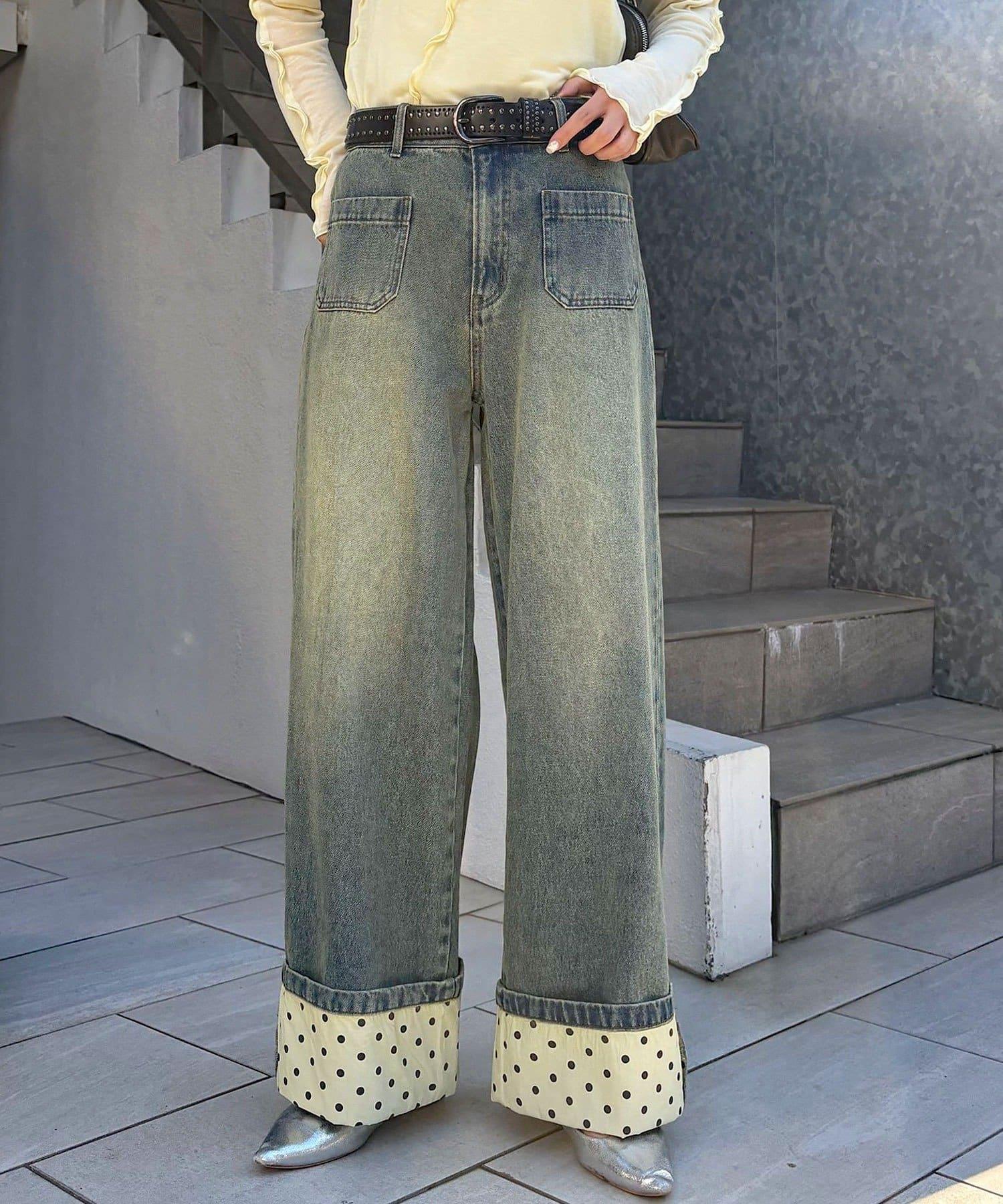 寬大的牛仔長褲,捲起的下襬露出醒目的圓點圖案。