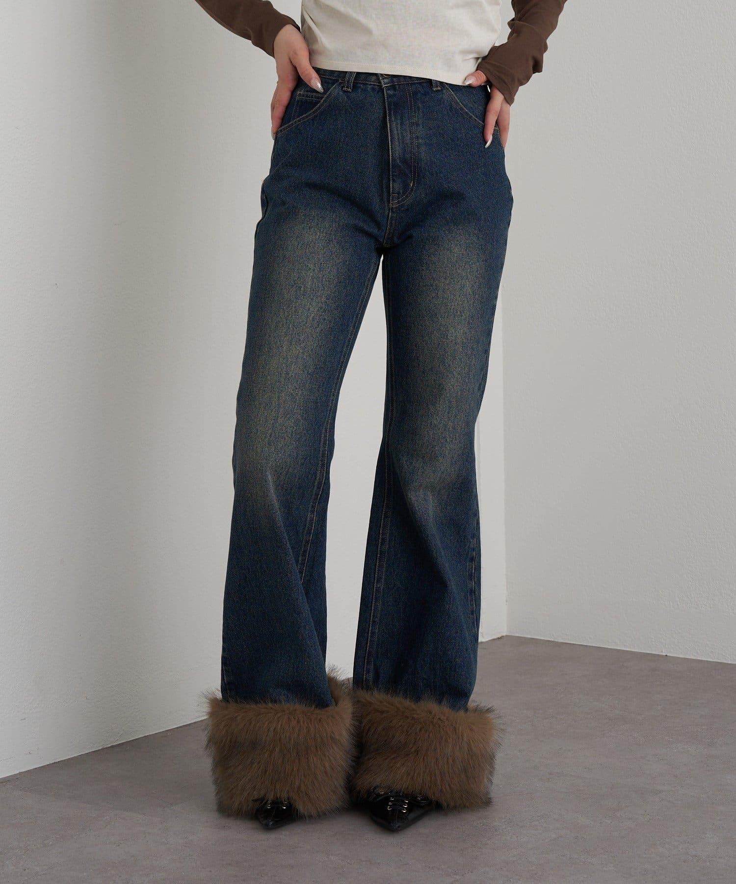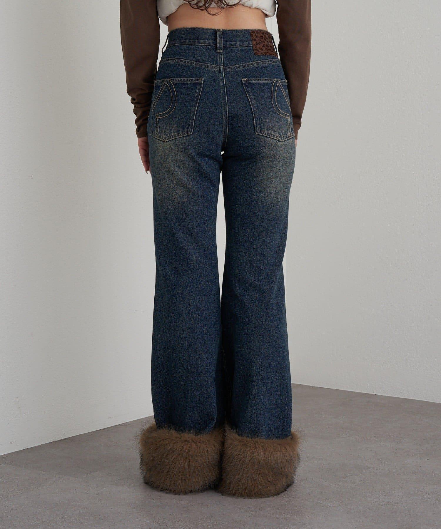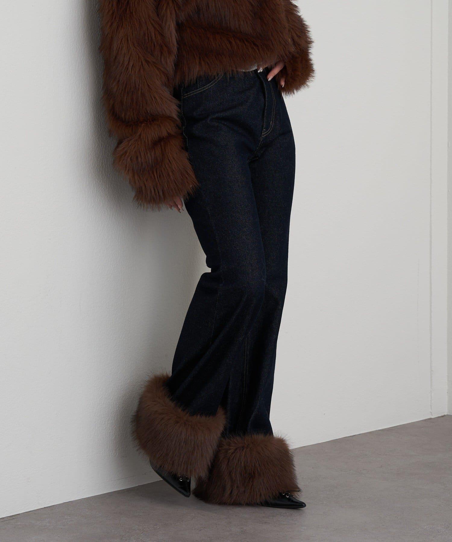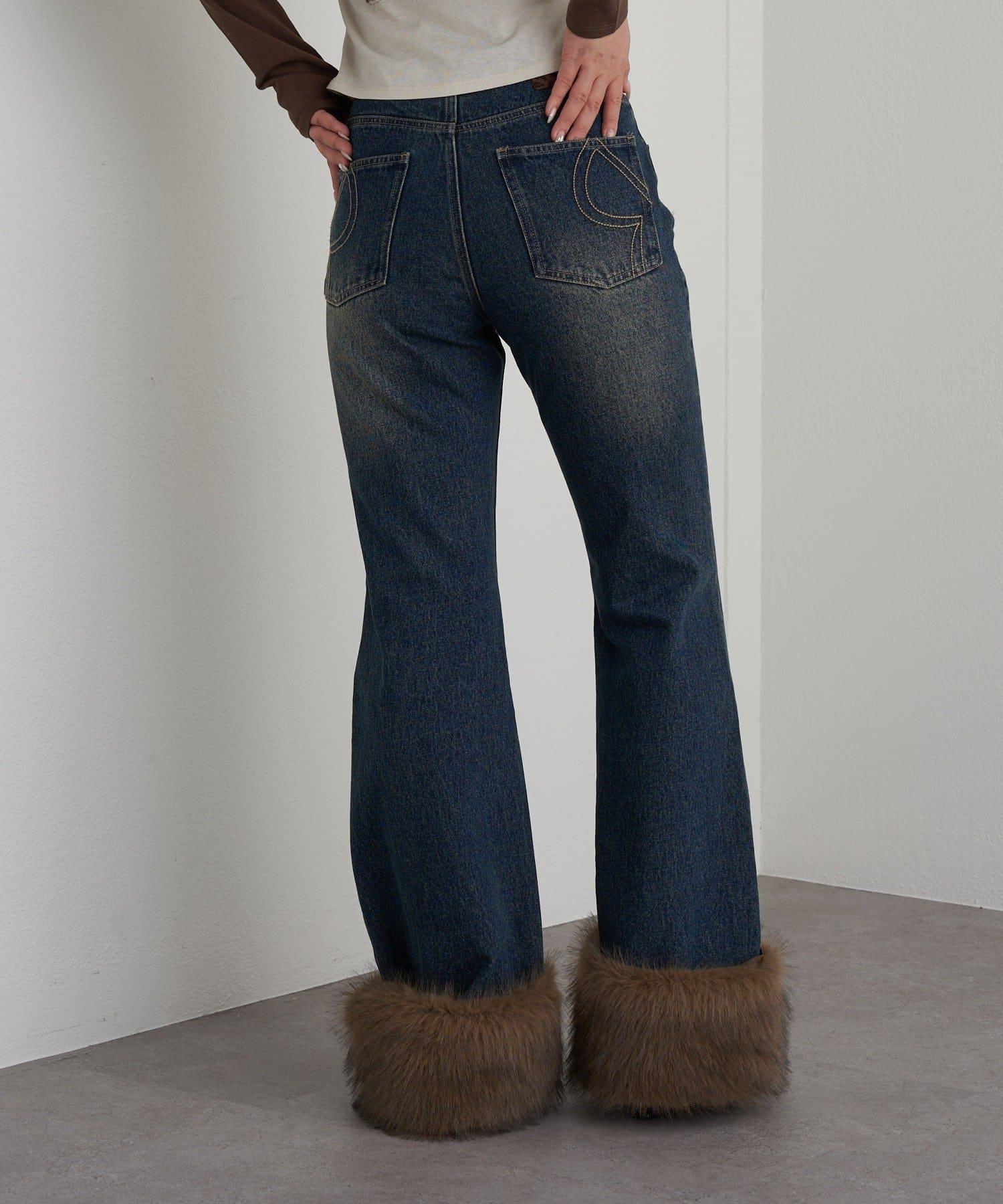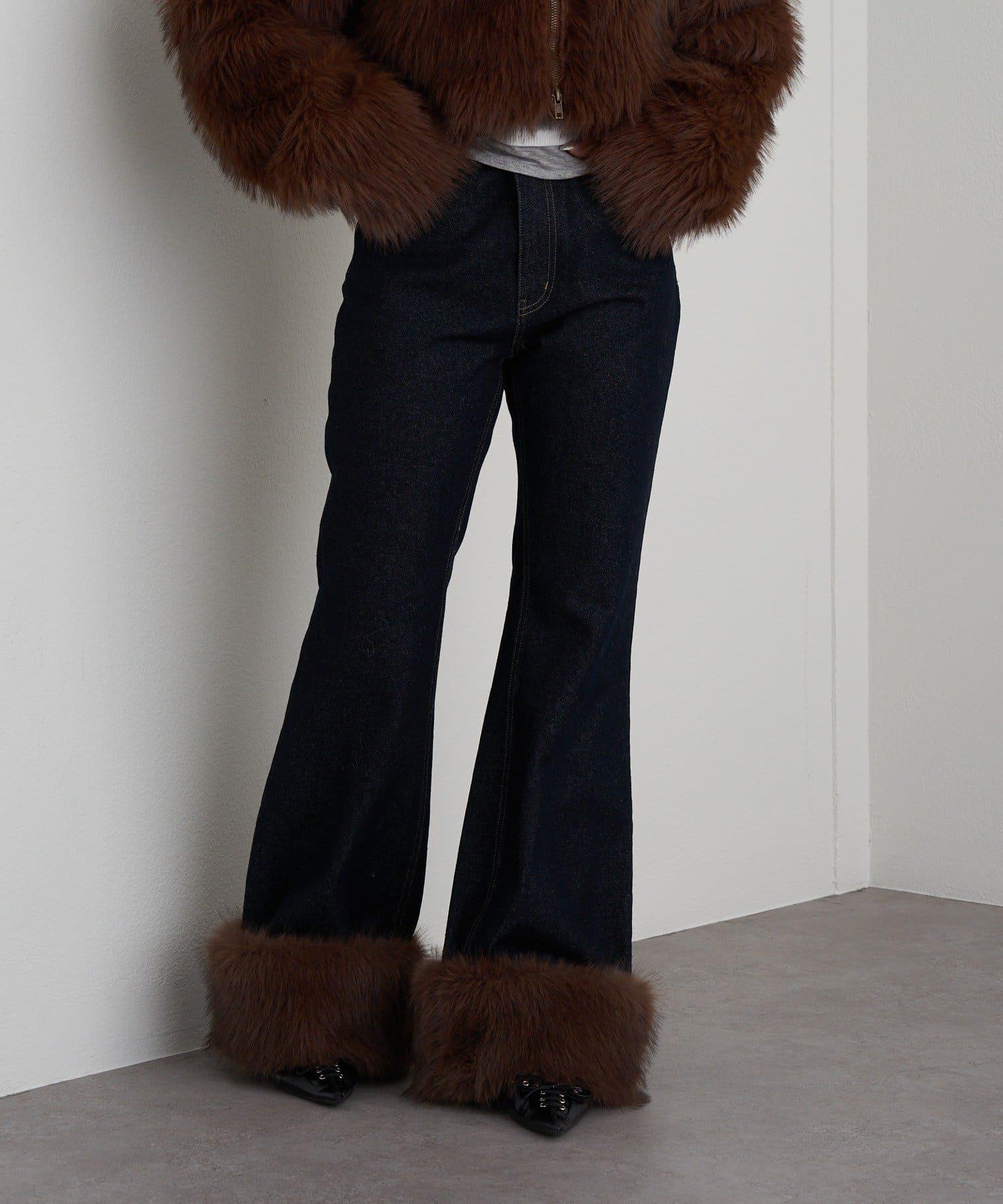 這款單品是一條帶有皮草裝飾的牛仔褲。