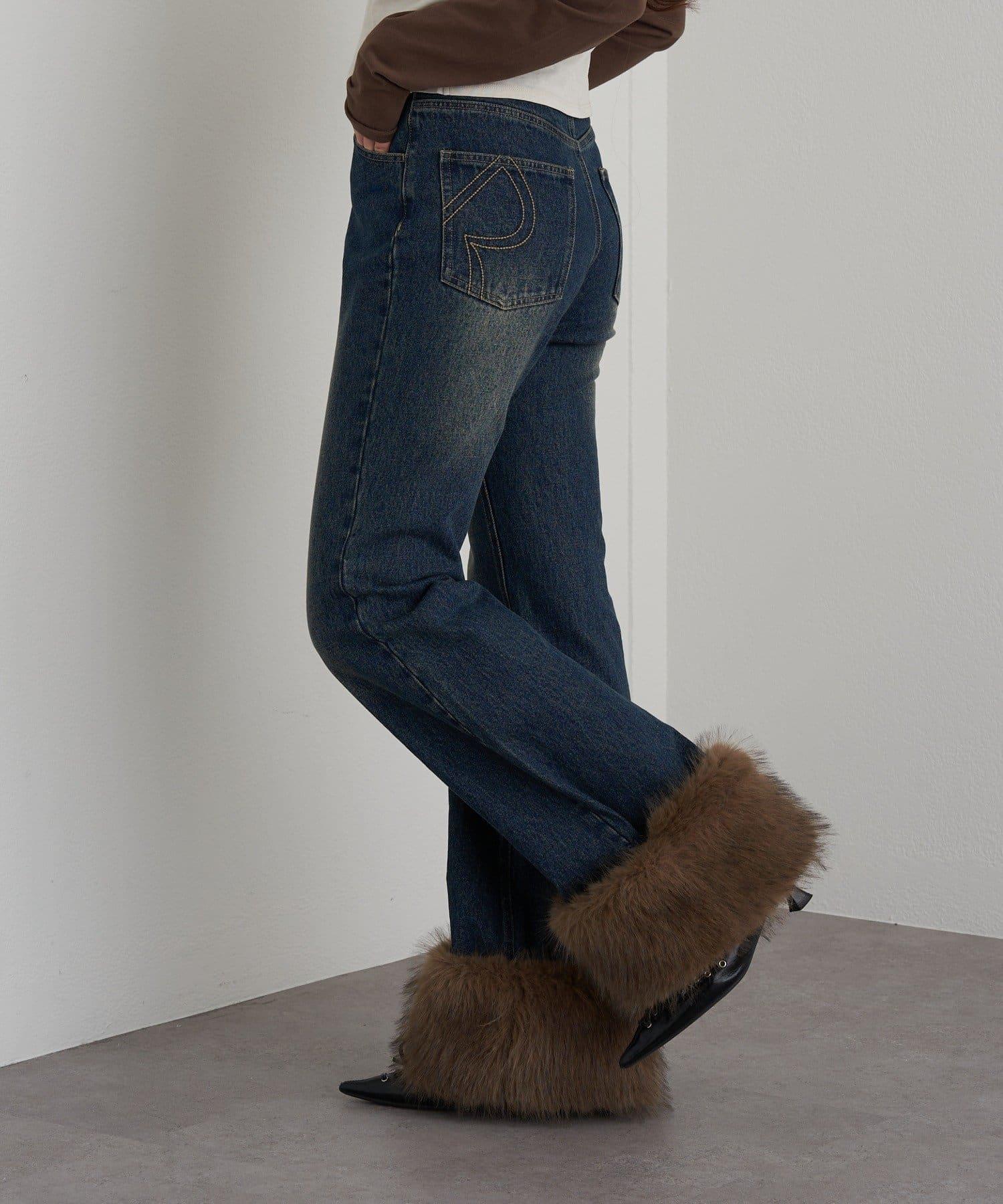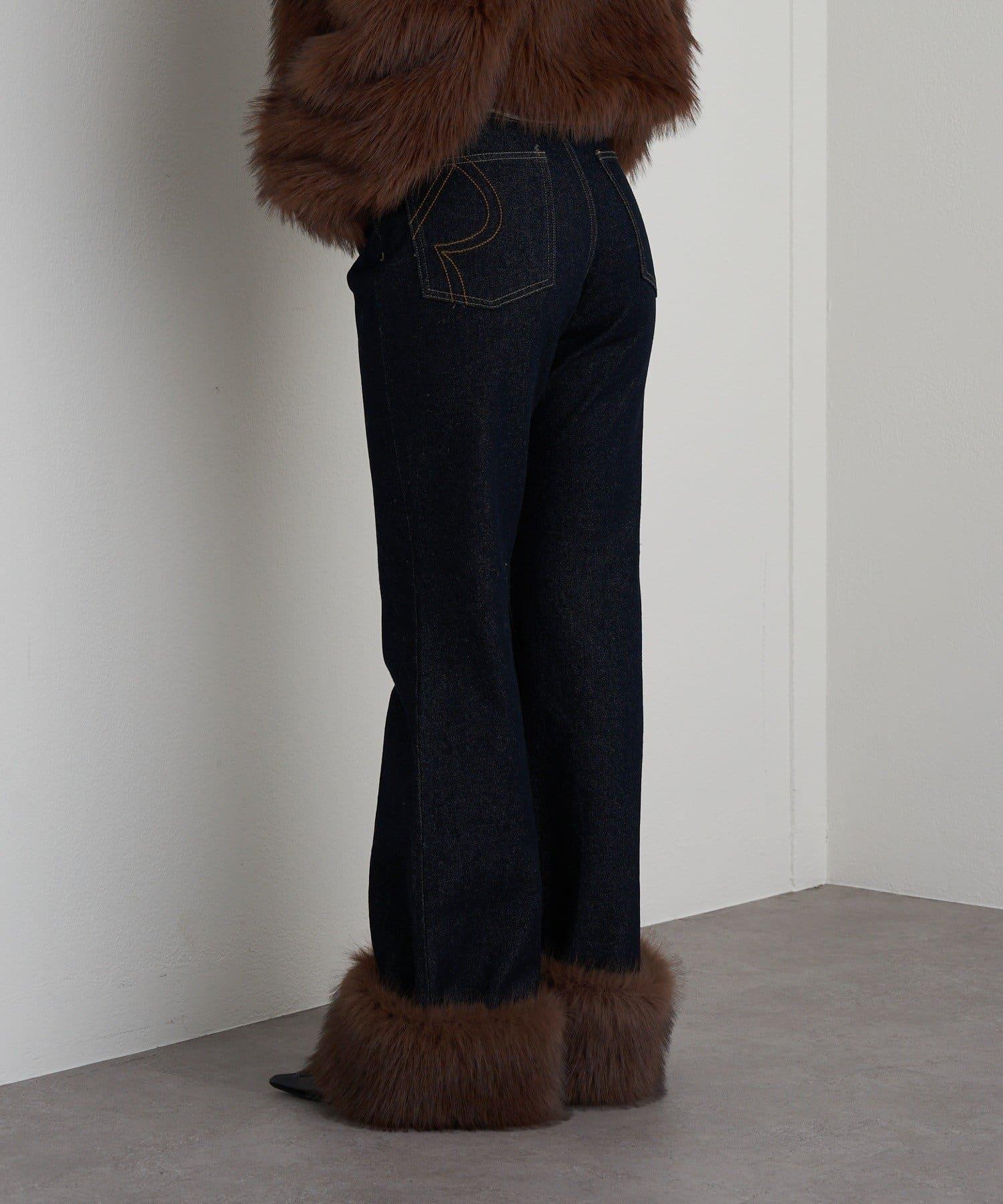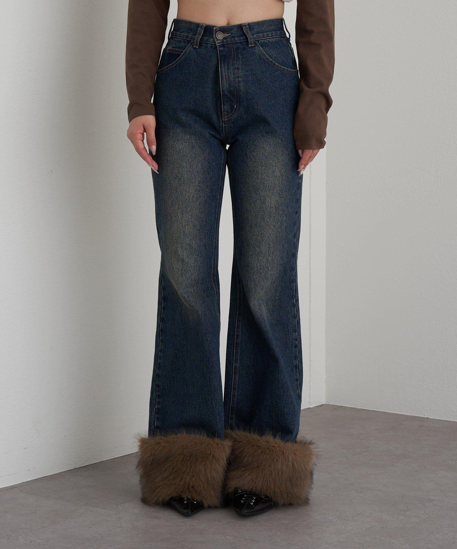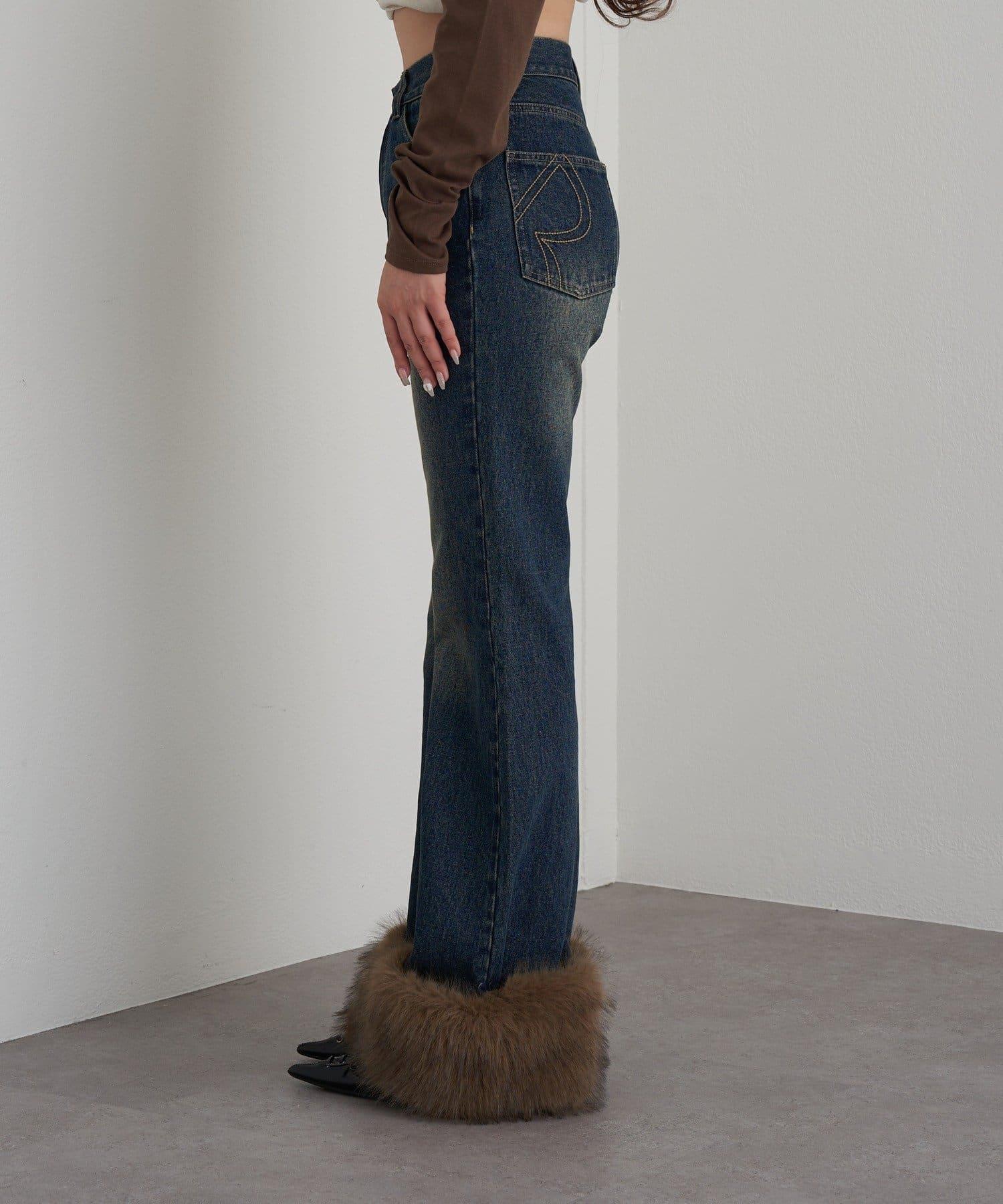 這款單品是一條帶有皮草裝飾的牛仔褲。